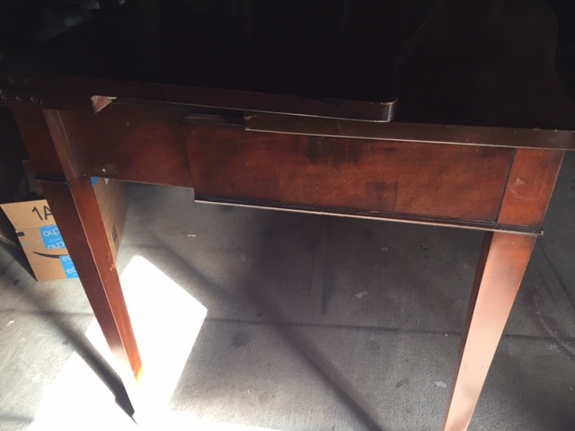 In its present state, it's worth maybe a few tens of dollars, but fully restored, it would probably be worth between $150-$300.Unfortunately, that's from most restorers are going to charge you to fix this, so its only economical if you are going to use it for yourself, as it would be cheaper than buying the same piece of furniture of the same quality new.