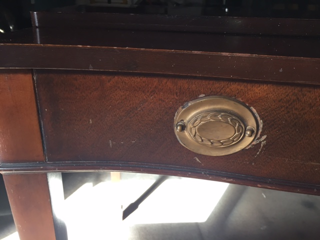 Federal style, from the 1940s or 50s, most like. Drexel is a high end maker, but unfortunately this piece has seen better days, as the finish has suffered some scuffing and one of the brass pulls is missing a handle. Brown furniture is down fright now, unfortunately, and this doesn't have the lines that are desirable for painted shaby-chic furniture.