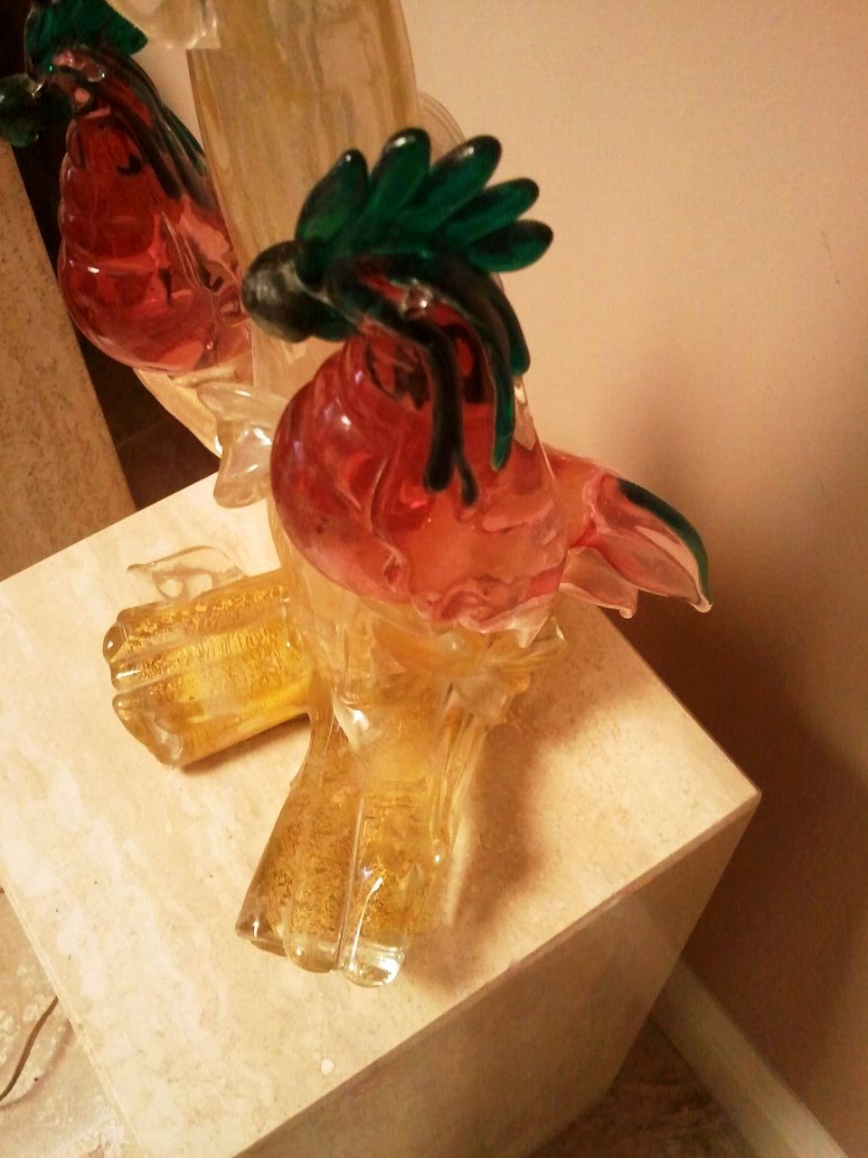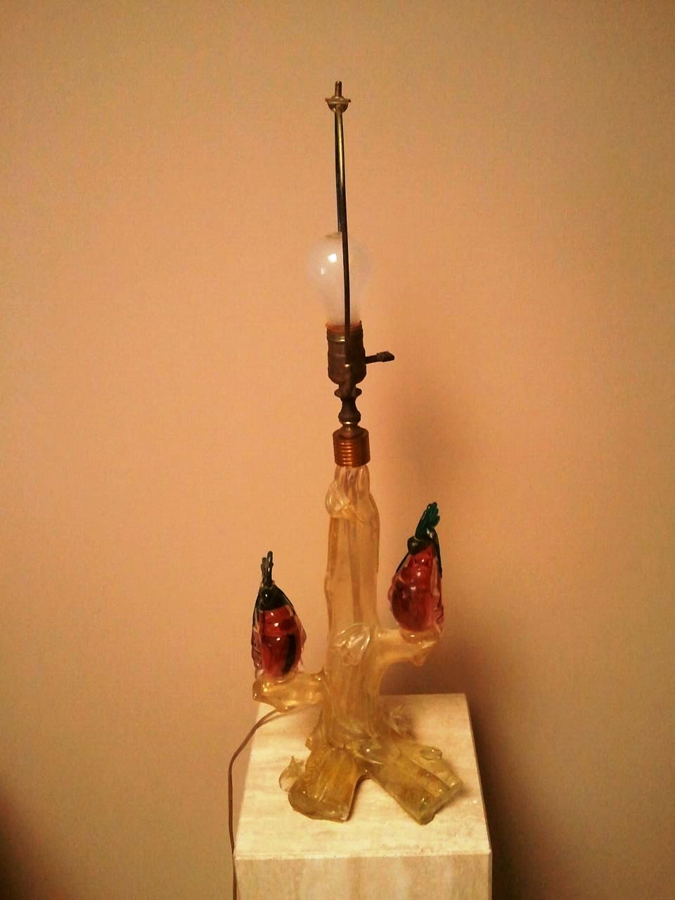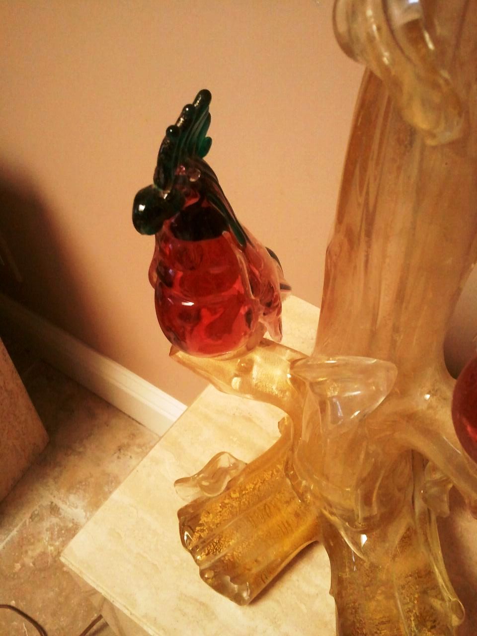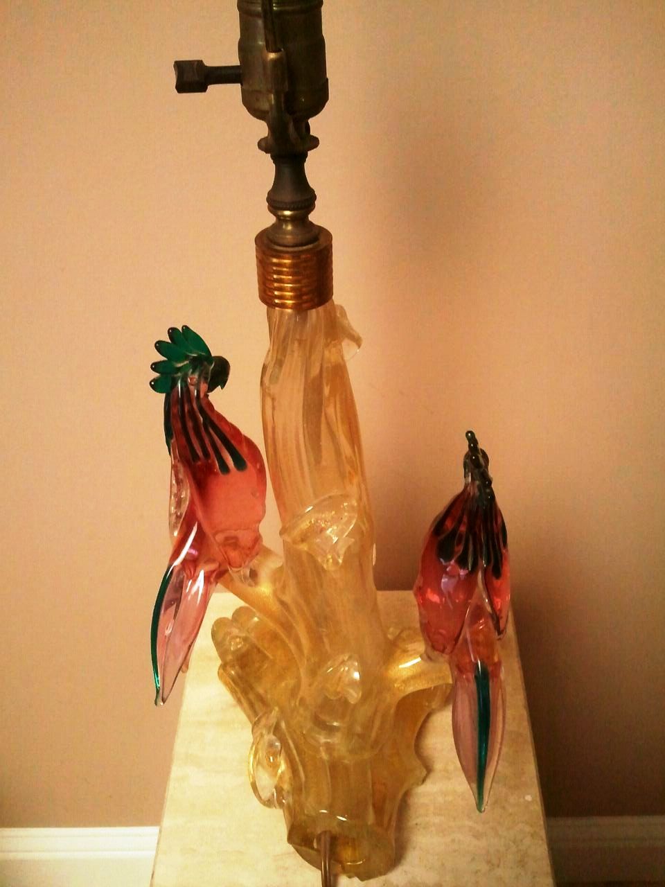 Hello...I am looking for information as to the origin / maker / age / value of this lamp. It is in working order. It looks like Murano glass, but I am not sure that it is. There is a lot of gold flecking in the base of the lamp. Birds appear to be Cockatoos.