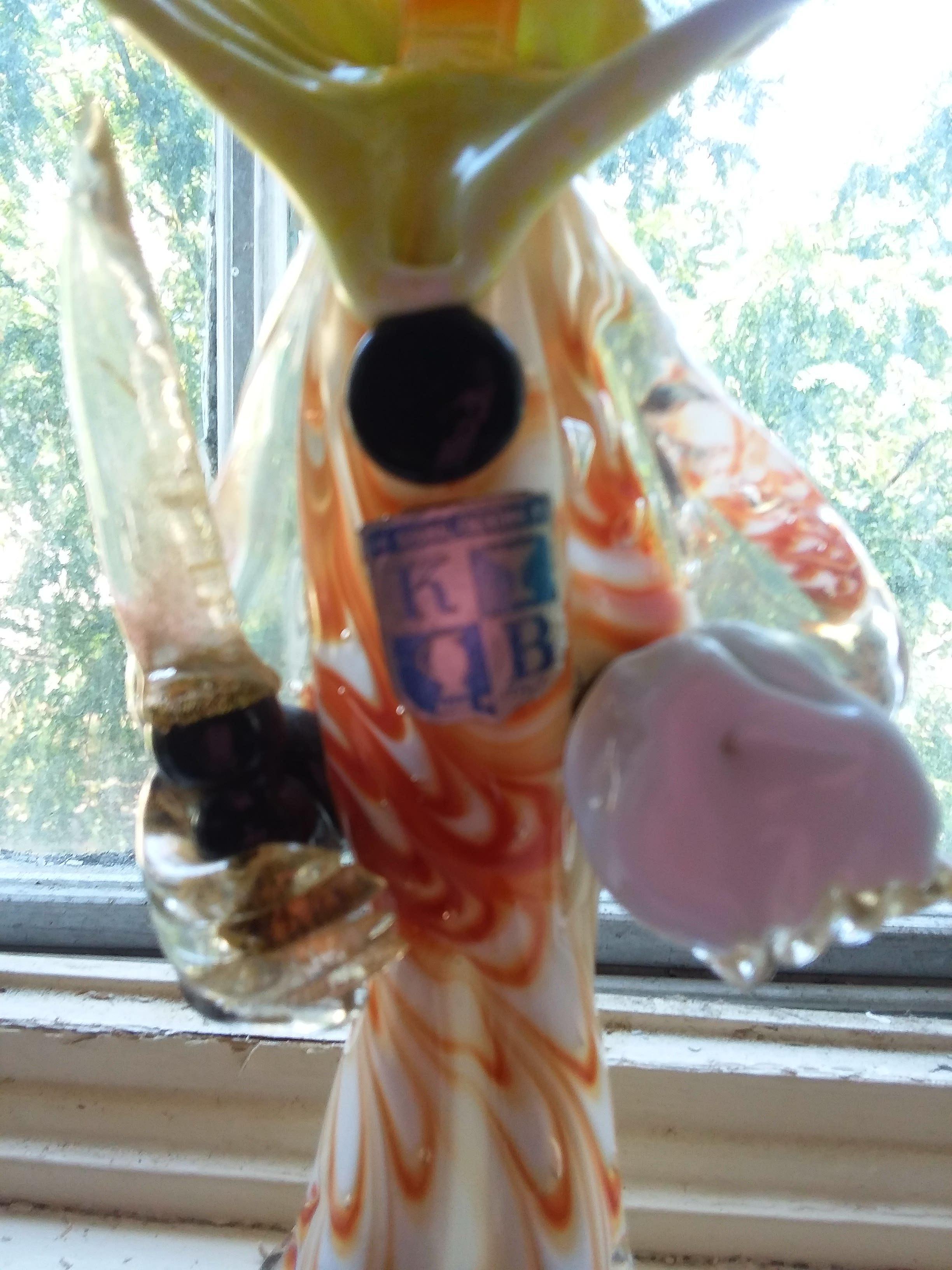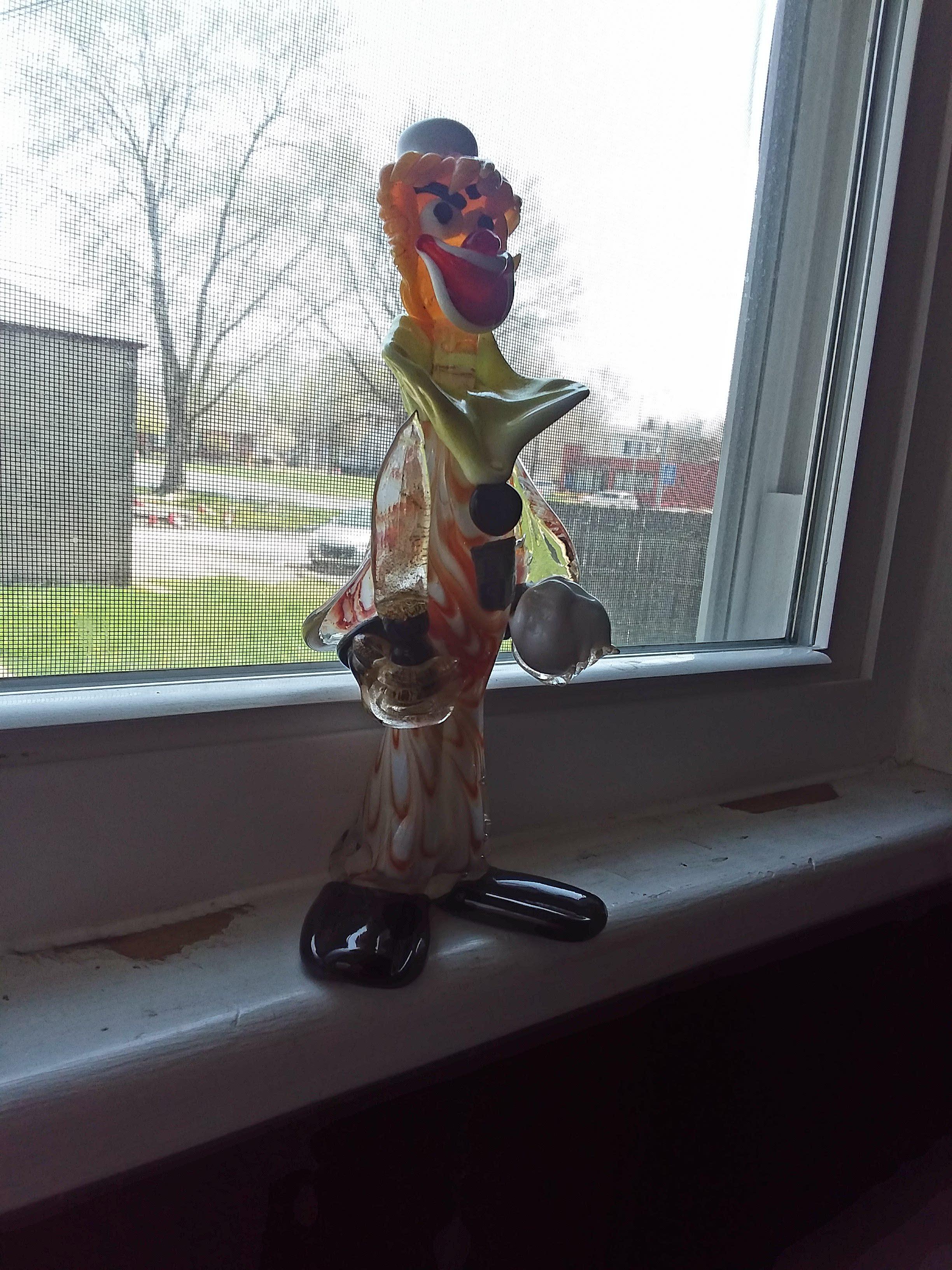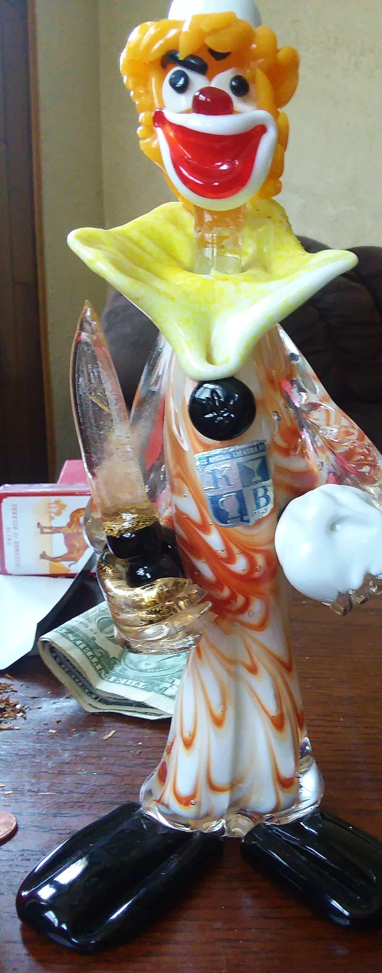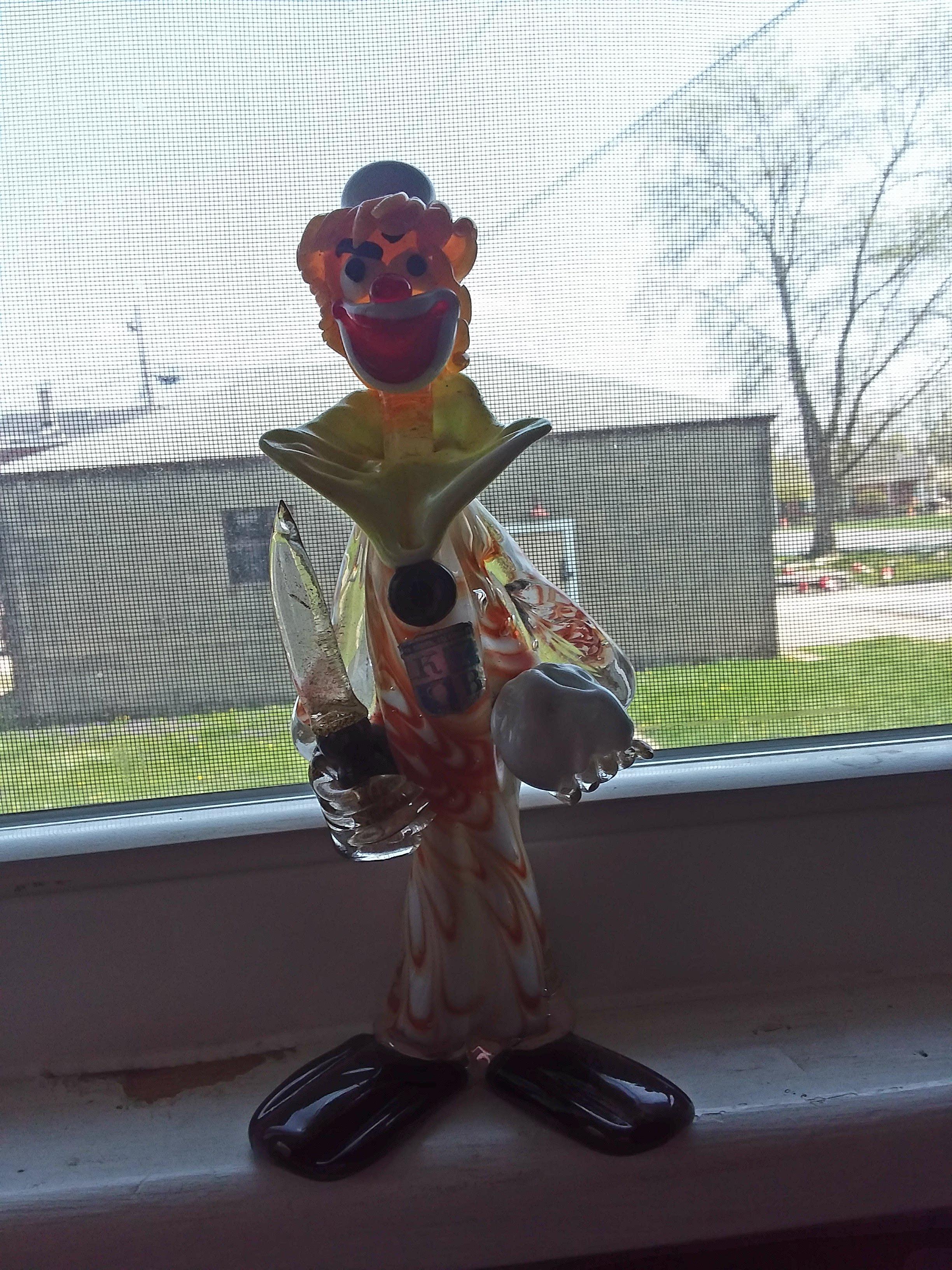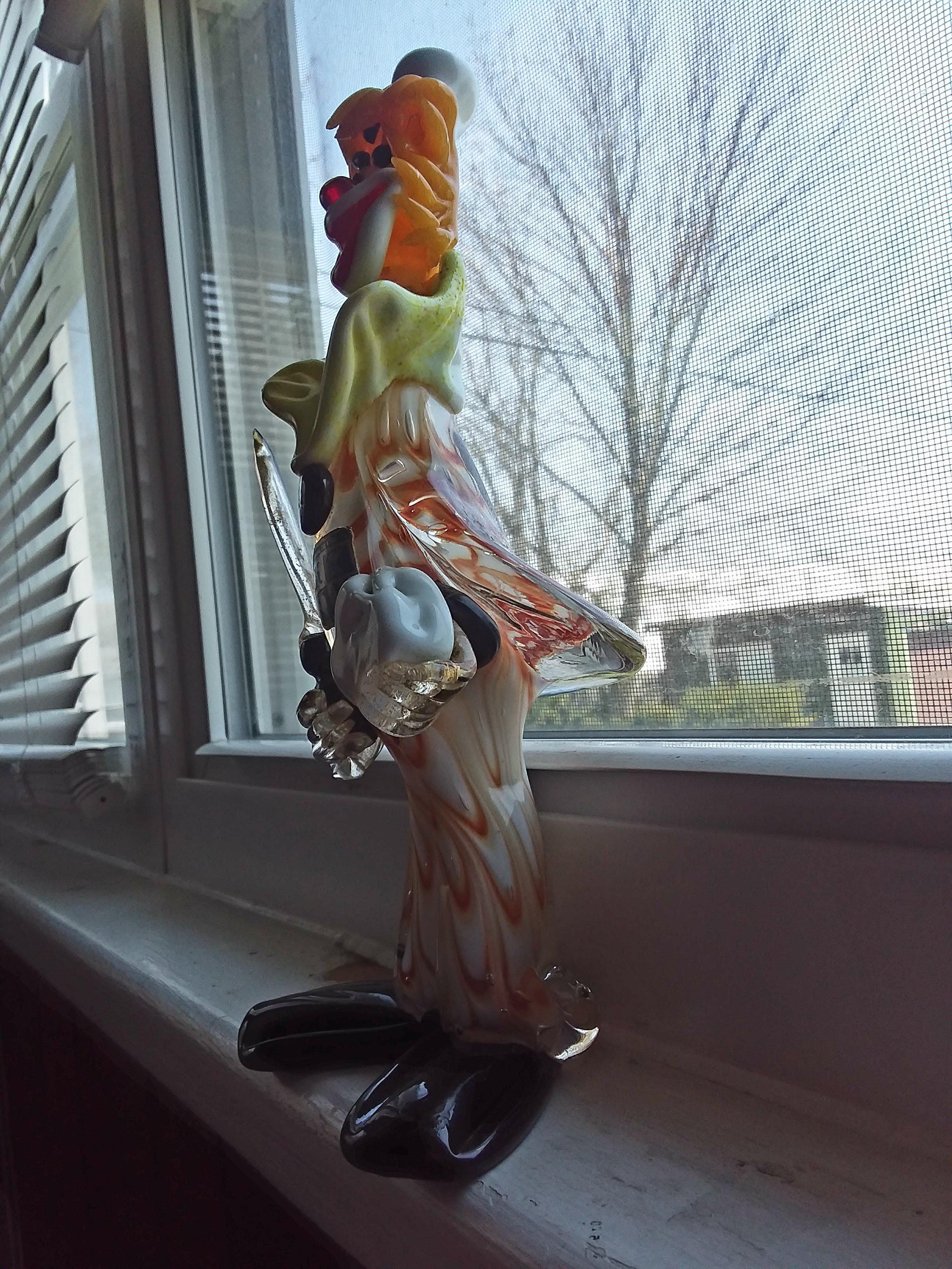 My fiance was given this Murano Clown as a gift from his Father 30 some years ago. We have searched and searched for one like it. With no success. He is holding knife in one hand and some sort of a white ball in the other. (My fiance thinks it is a skull) Ive never seen one of these clowns with a weapon before. Any info would be appriciated thank you.