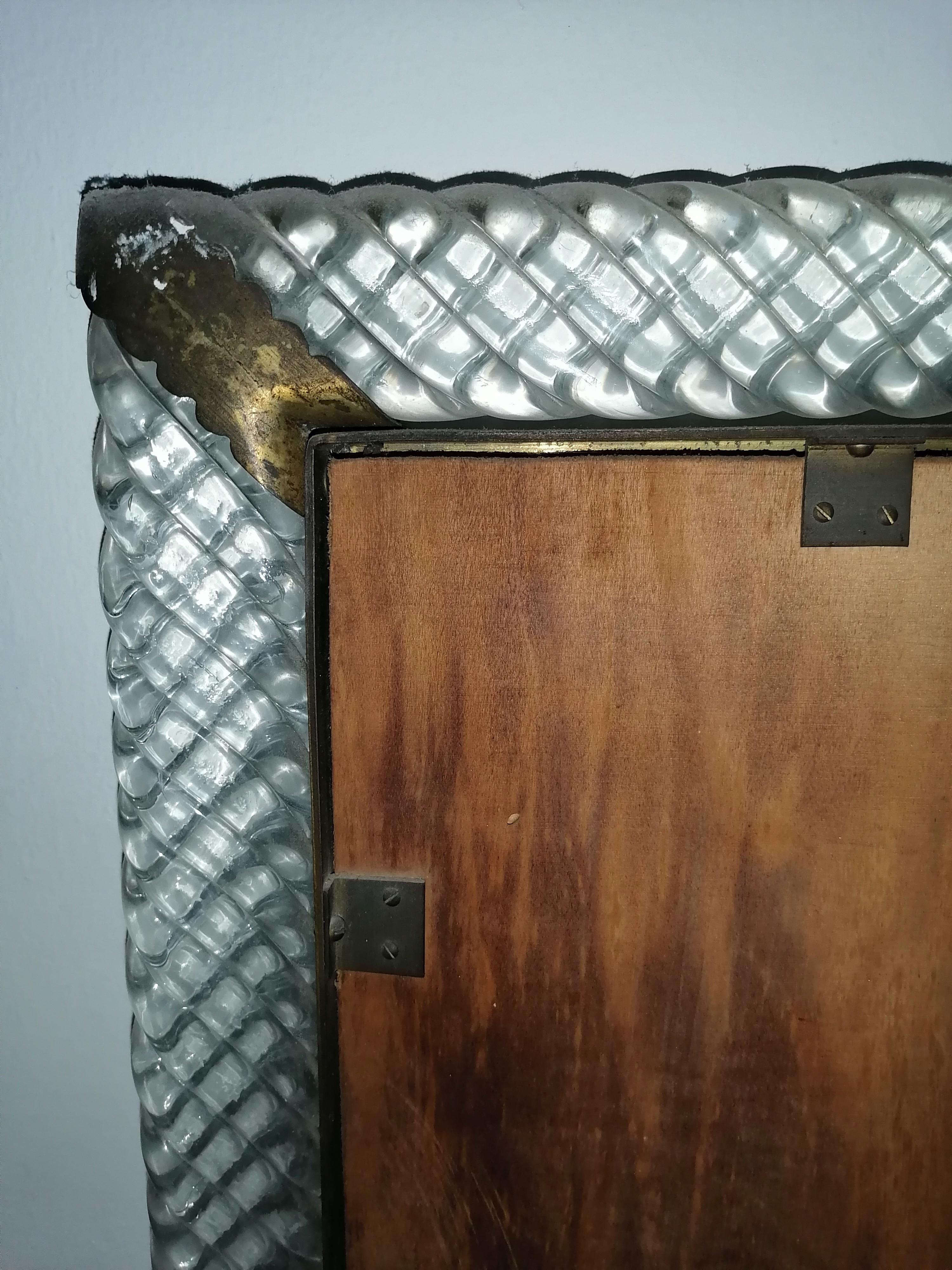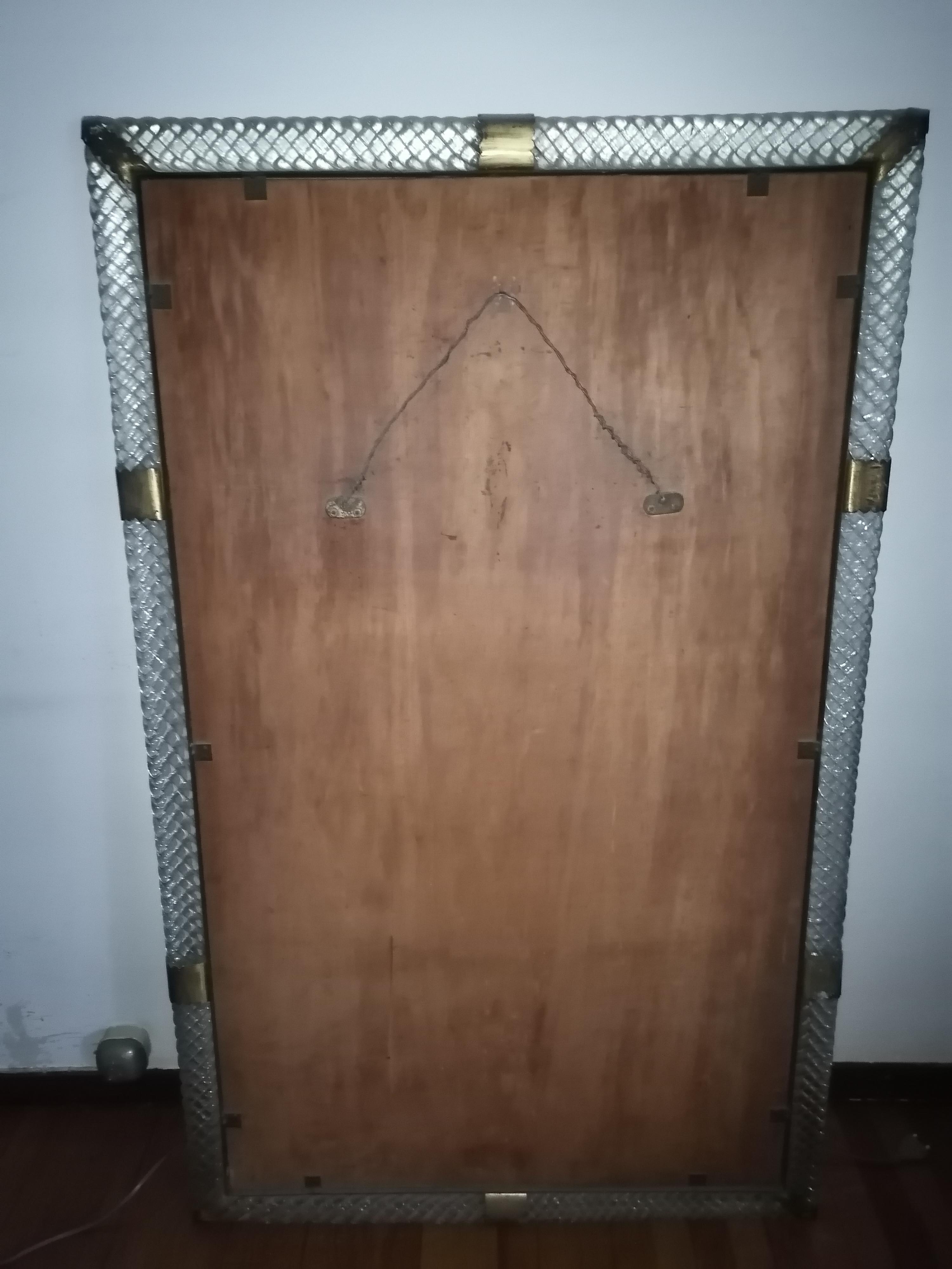 This is a large mirror featuring a Murano glass-style frame with a lattice pattern and decorative brass corner and mid-section details. The backing is made of wood, and the mirror has a chain for hanging. The craftsmanship suggests it may be a vintage or mid-20th-century piece, inspired by or originating from the Venetian tradition of glasswork.
