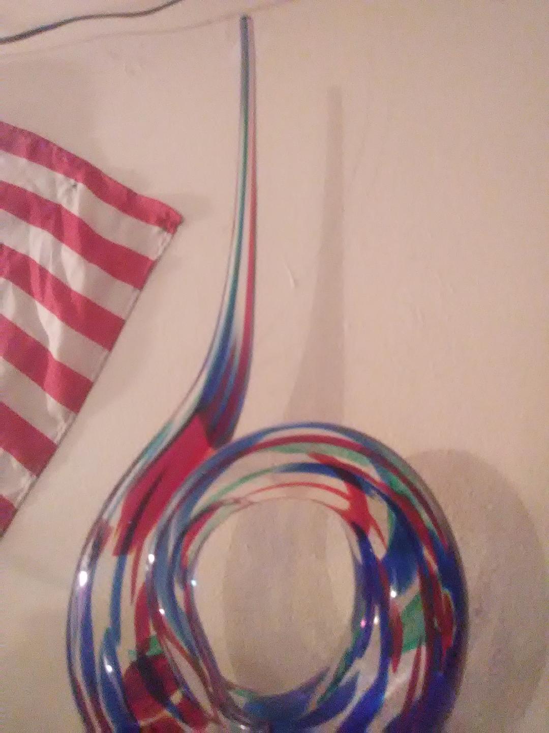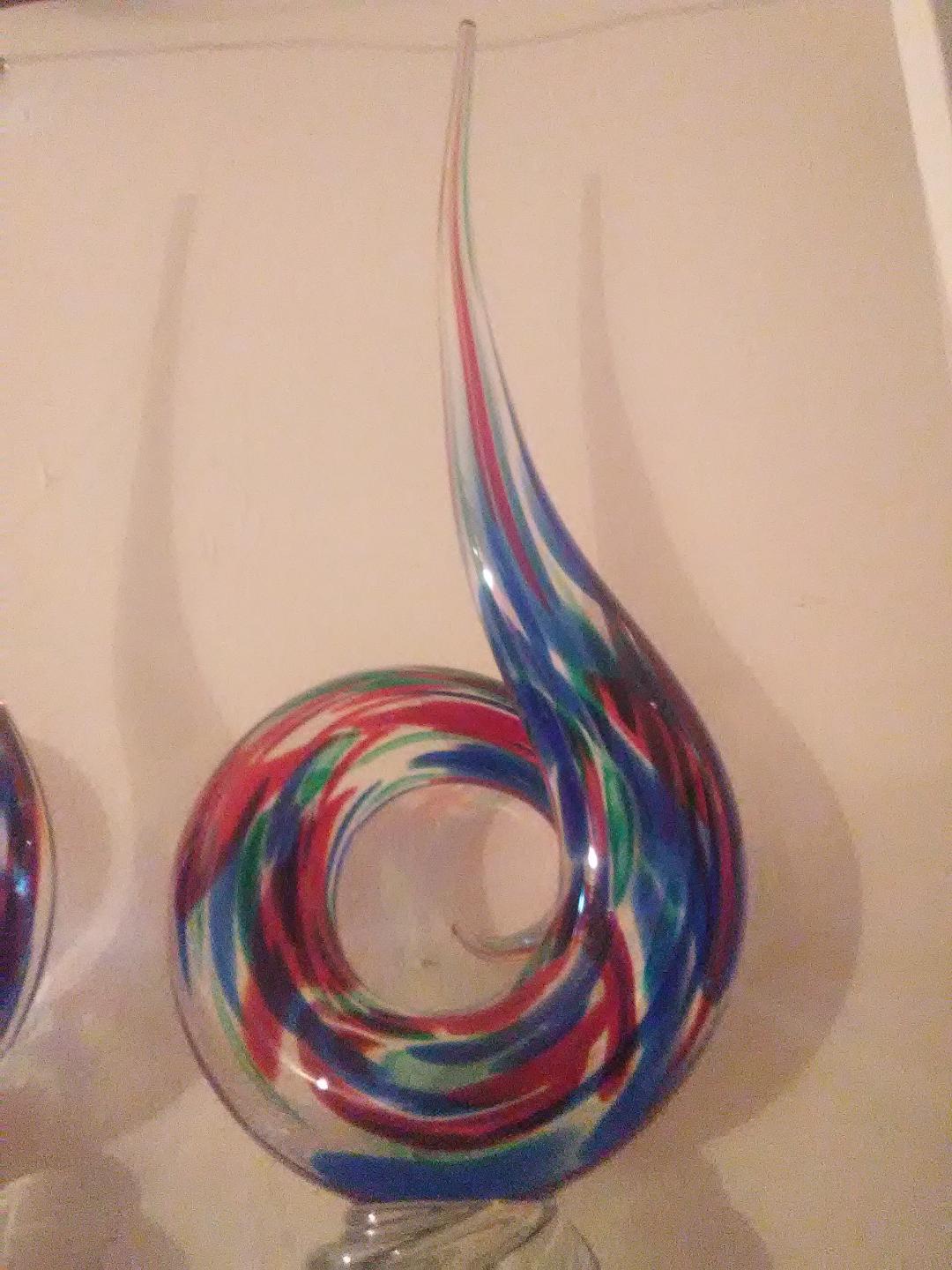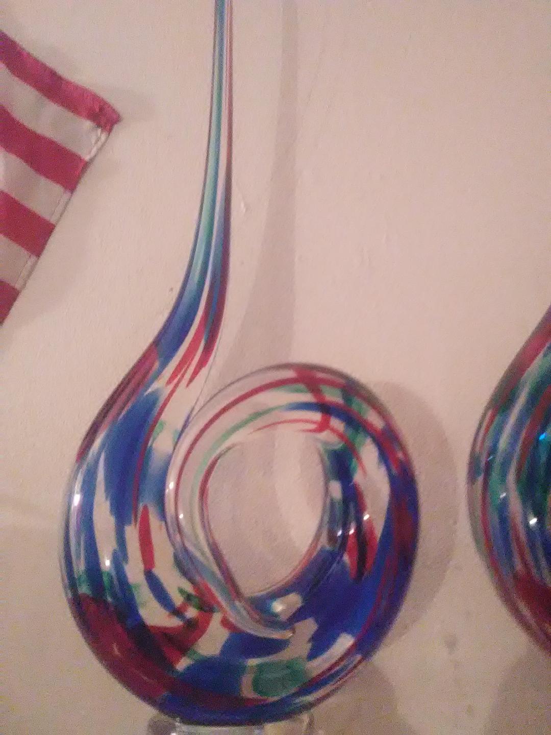 Hello, I have a pair of Murano Glass Sculptures. One is red, blue and green. It is 20 3/4" tall, 7 1/4" wide, 5" deep and is on a base that is 4" tall and 3 3/4" wide. The other is red, blue and has a small amount of green. It is 20" tall, 6 1/2" wide, 4" deep and is on a base that is 3 3/4" tall and 4 1/4" wide. They weigh 12 pounds each. The vase has red and black and is 10" tall, 5" tall at top and 4" wide at bottom. It is 4 1/2" deep with an inner width of 3". It weighs 8 pounds. They are all in excellent condition, with no chips or cracks. Thank you for your time.