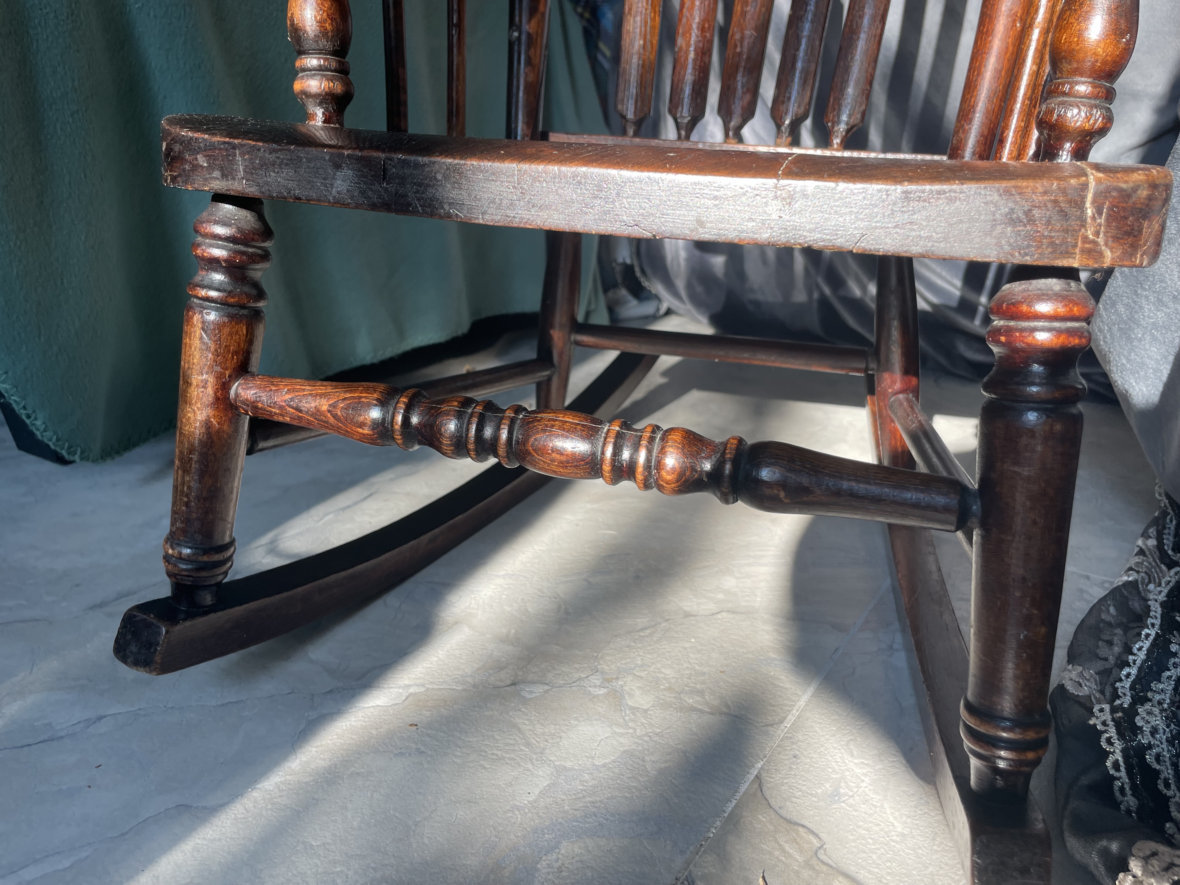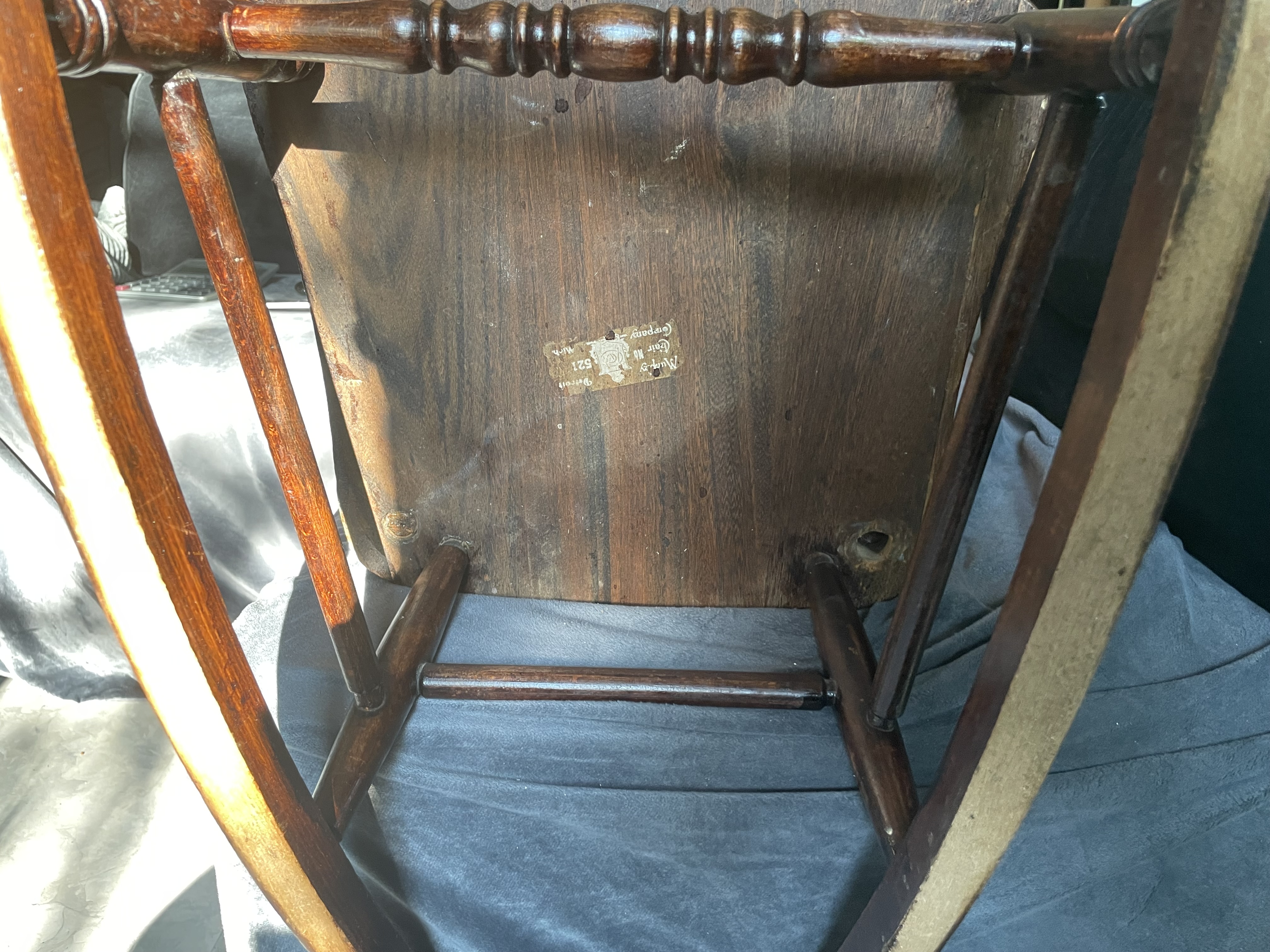 Physical Description: This antique child's rocking chair, produced by the Murphy Chair Company in Detroit, Michigan, is constructed from a dark wood, likely oak or a similar hardwood. The dimensions are as follows: back to front rocker legs measure 22.25 inches, arm to arm spans 17 inches, height is 25.75 inches, and the seat dimensions are 14.25 x 13.25 inches. The chair weighs approximately 9 lbs. A distinguishing feature is the original Murphy label located on the bottom of the chair.