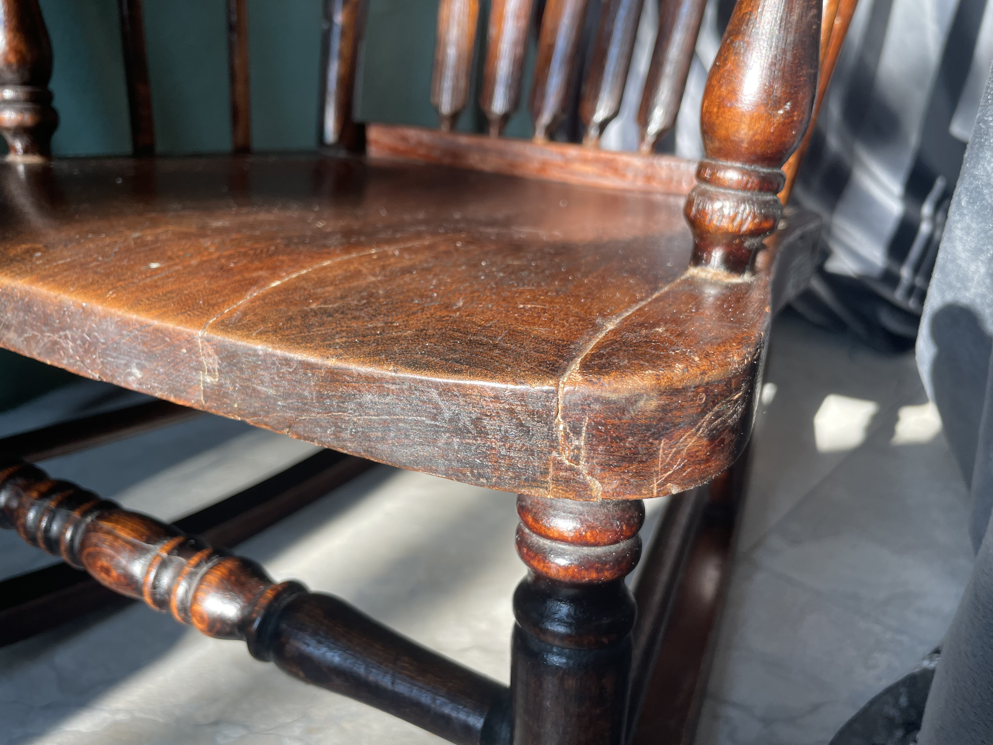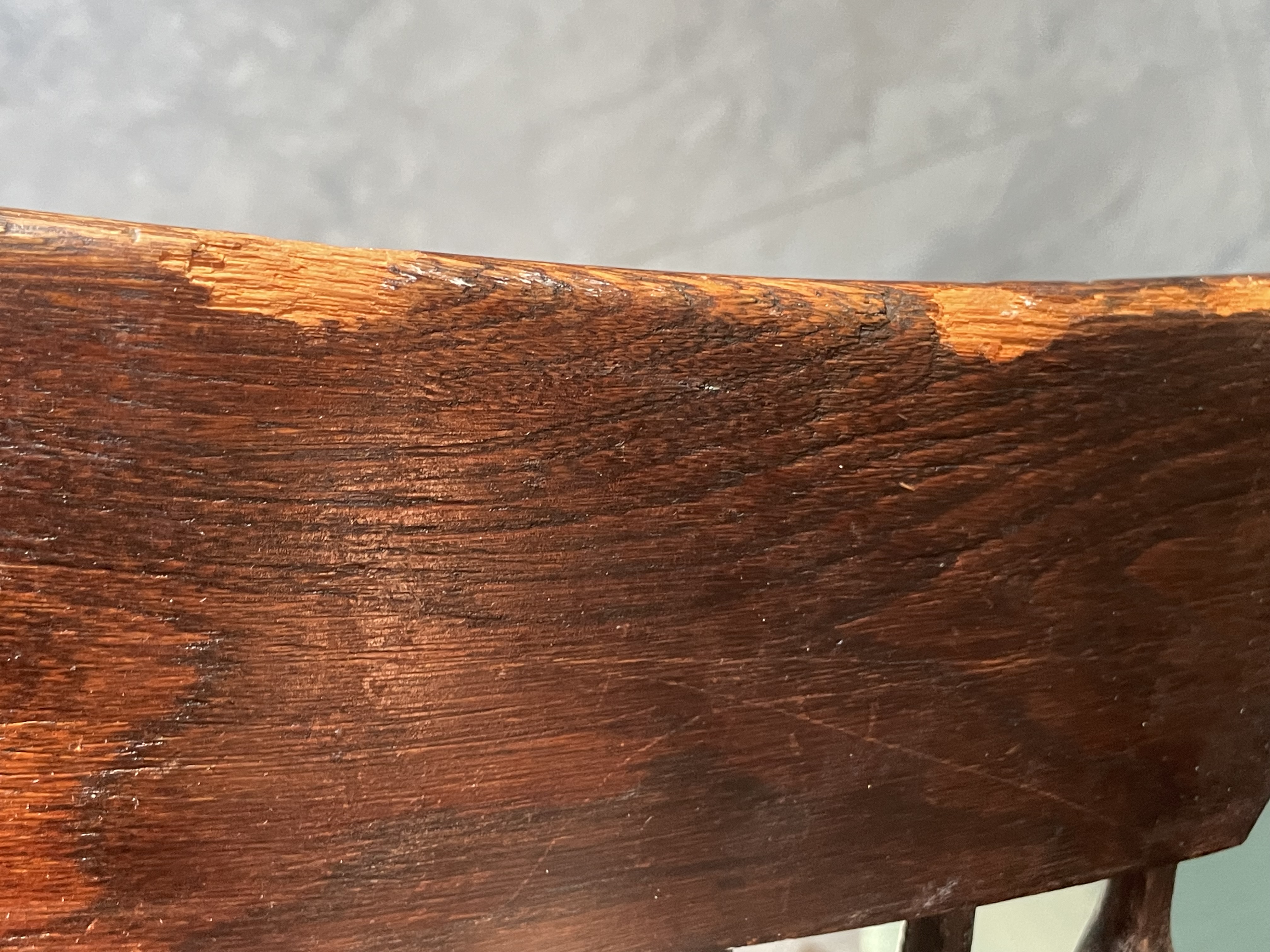 - Surface scratches and minor cracks are visible on the seat and armrests, which are typical for furniture of this age.