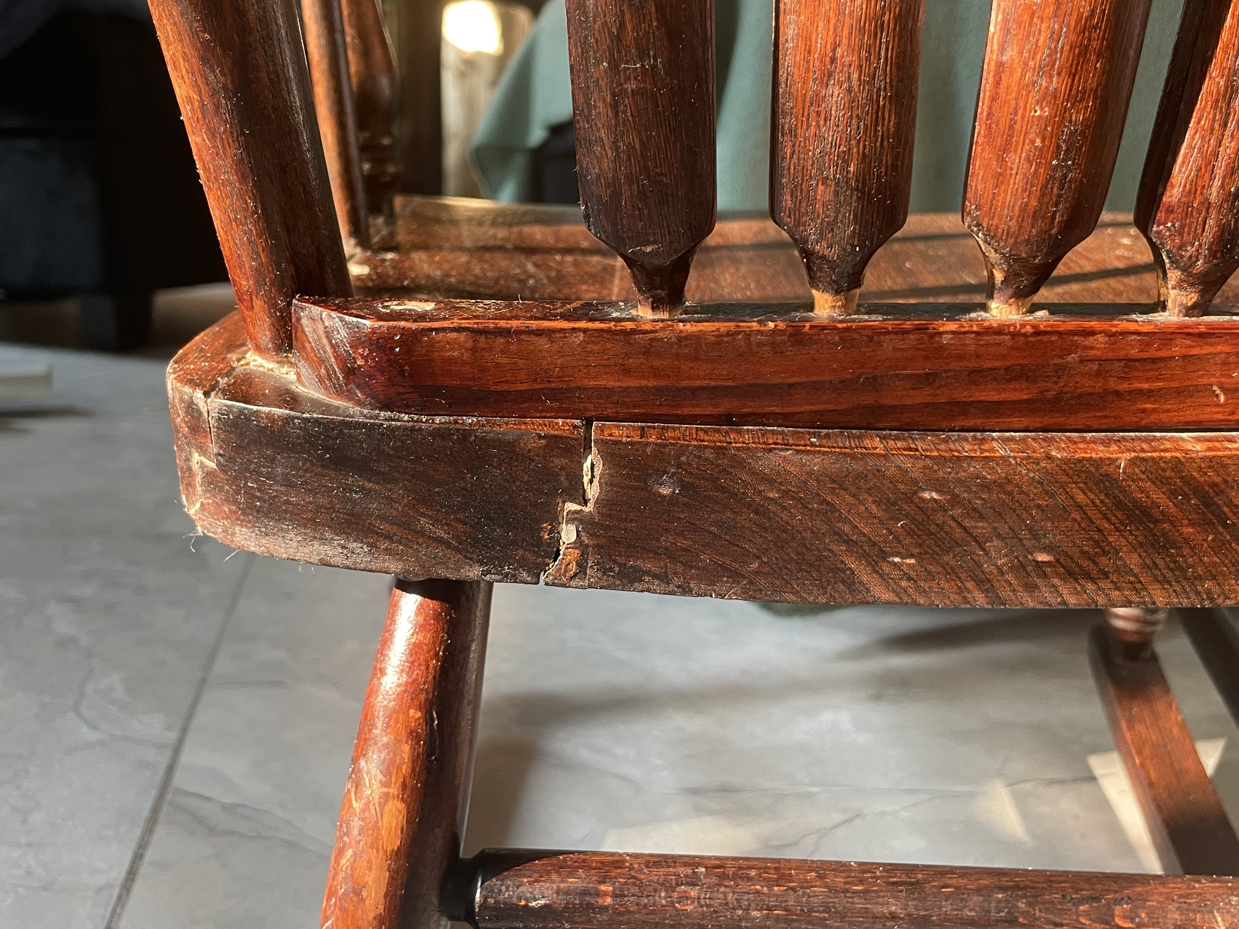 - The chair is loose in some areas, suggesting it may require tightening or additional restoration work.