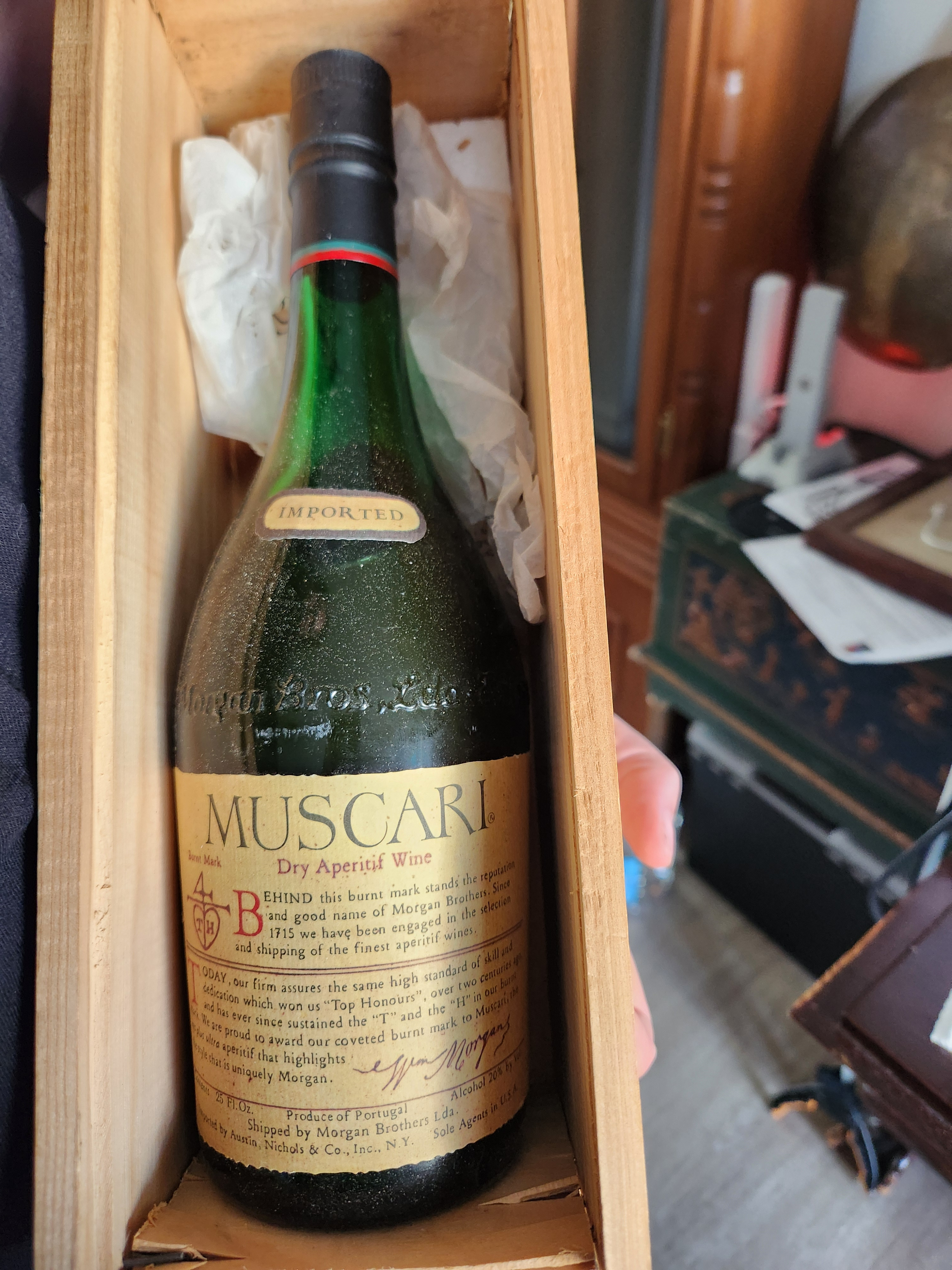 Muscari Dry Aperitif Wine. Made by Morgan Brothers Ltd.. Dating to 20th Century. Materials: Glass, Wood. Estimated value: $44 – $56. Condition: Good. Moderate interest in vintage wines, with slight upward price trends.