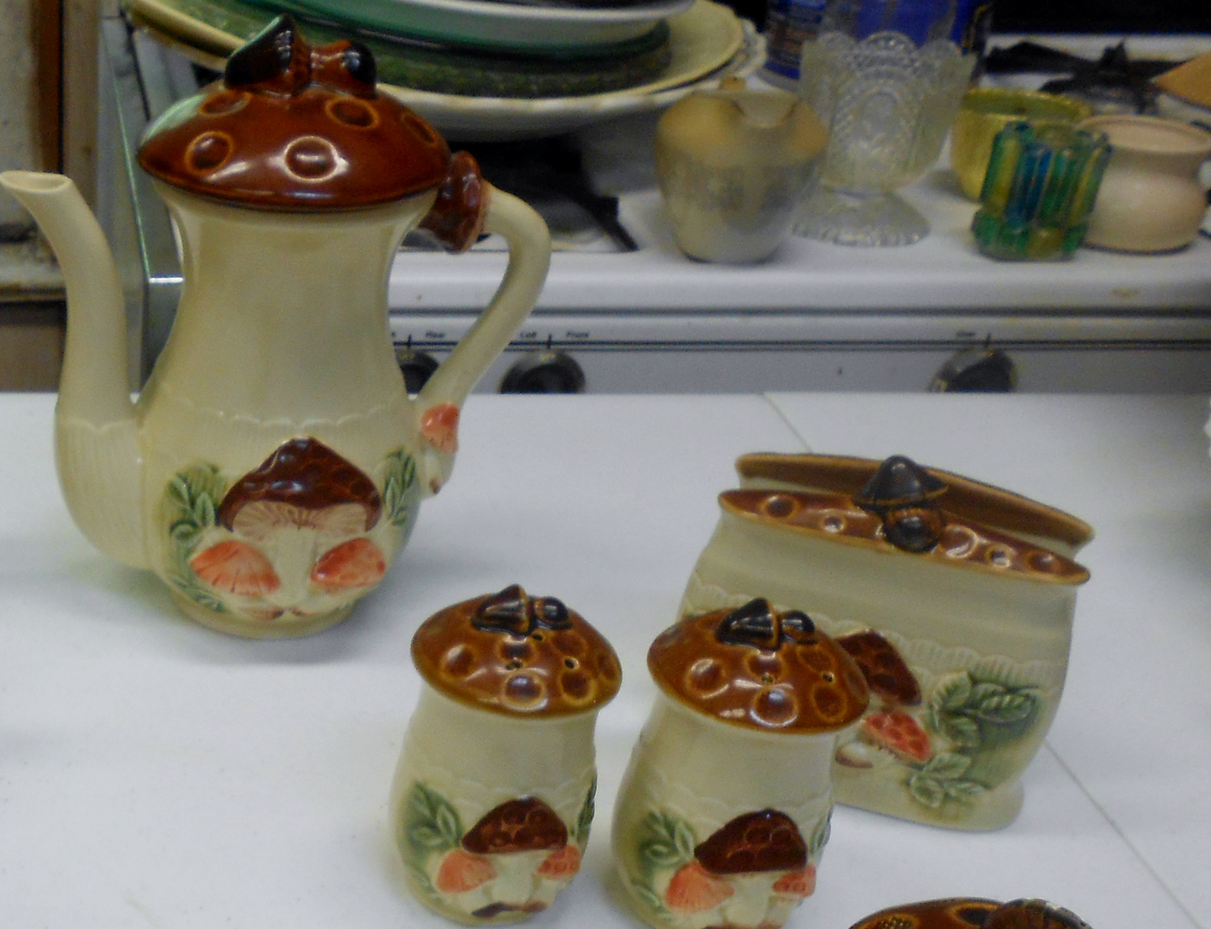 Bought for 5 dollars... has all the pieces to the set including napkin holder, salt and pepper shakers, cups, creamer and sugar bowls...