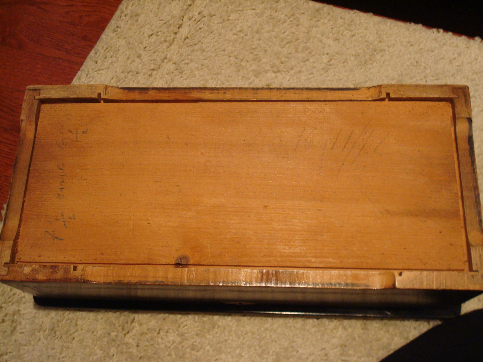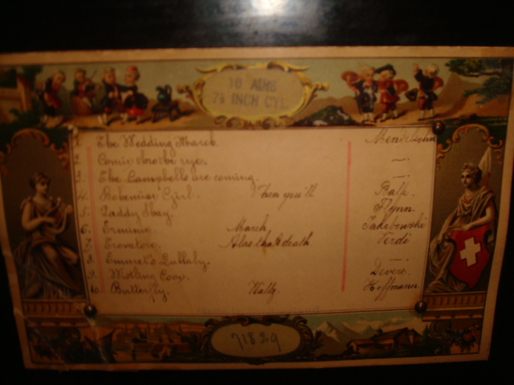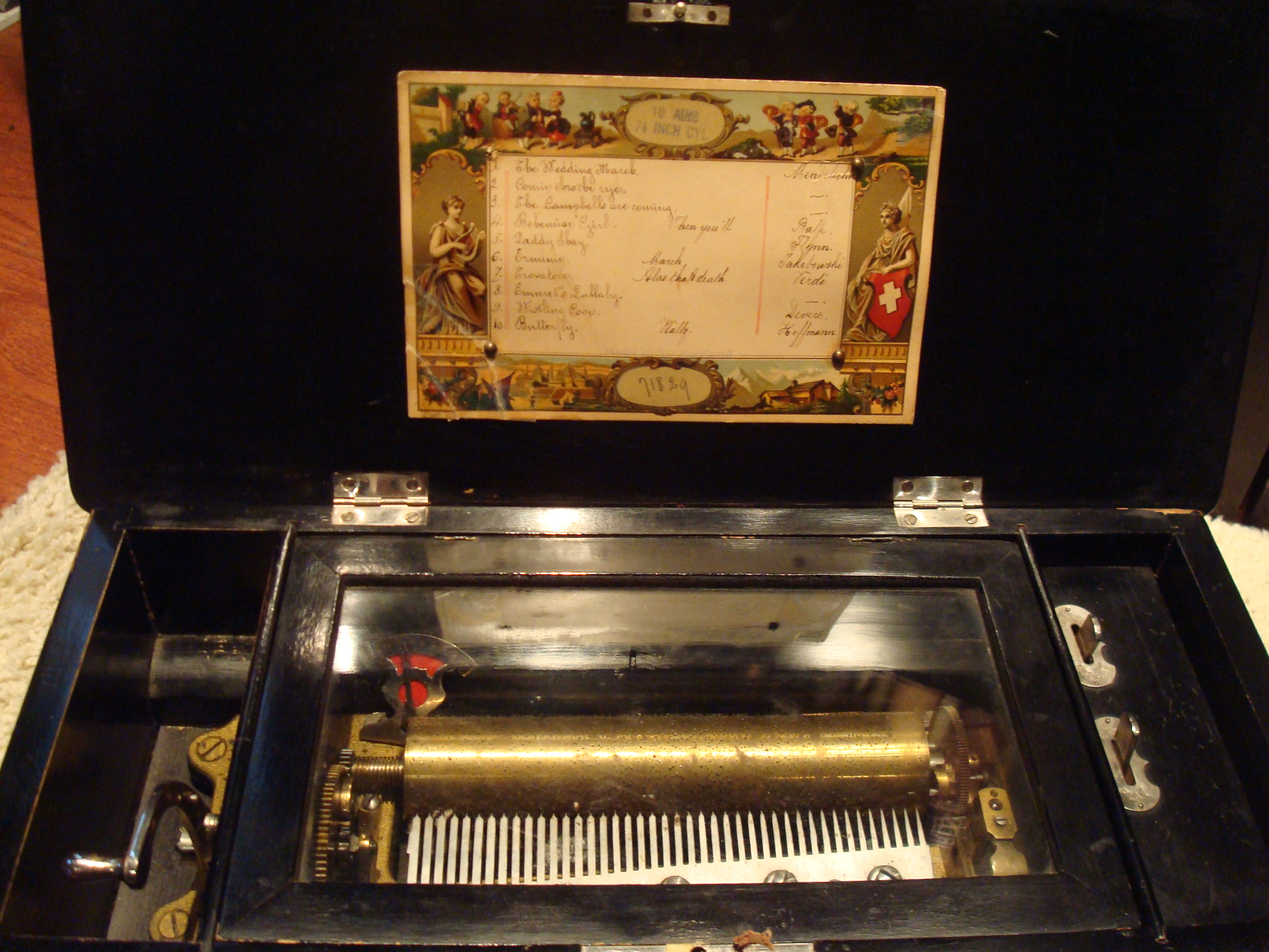 Hand crank music box with hand written play list. Inside says 10 airs (assuming that means songs) and 7 1/2 inch cyl (assuming that means legnth of music round. Year states 1892.