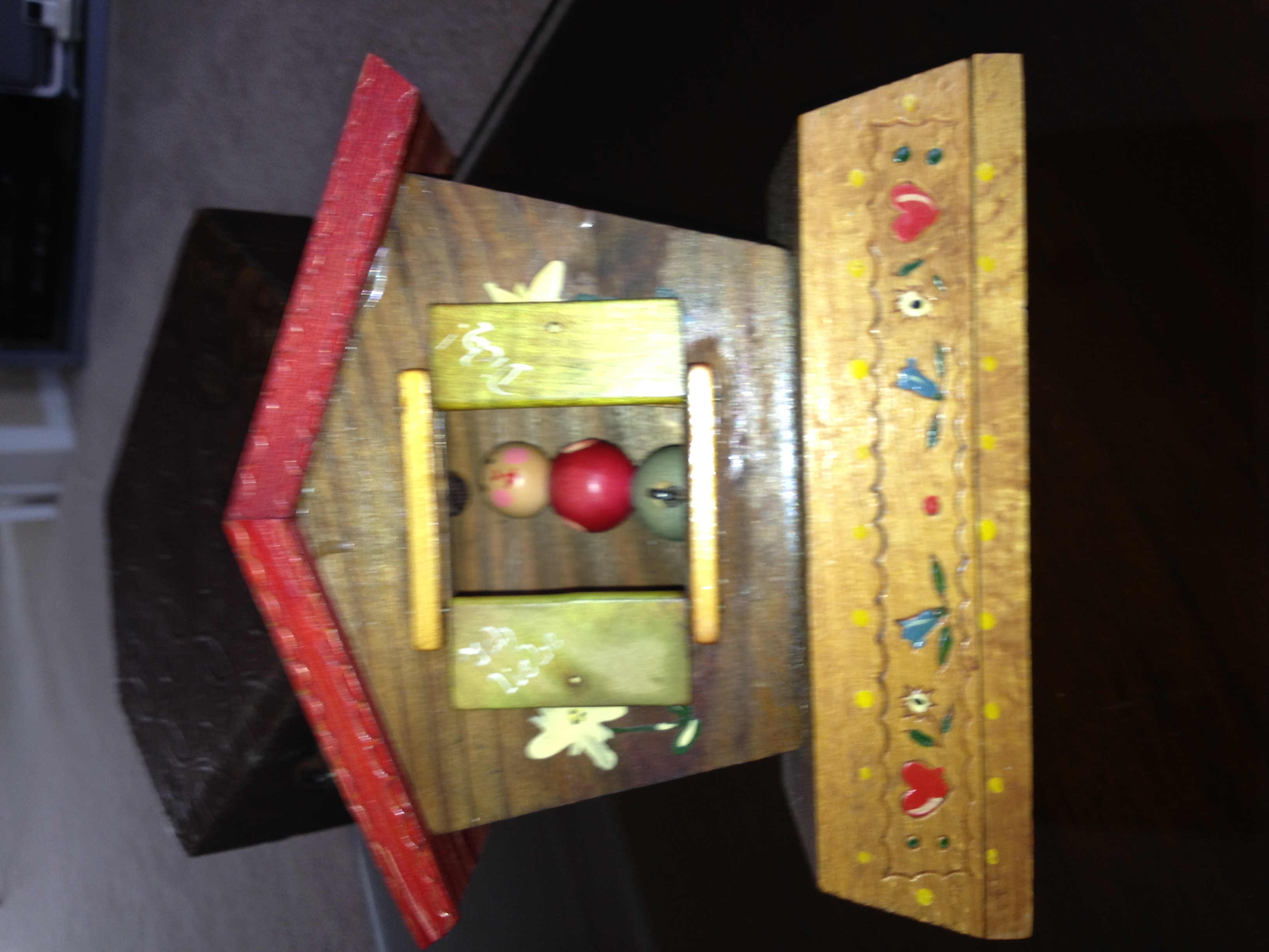 #41 Auf Wiedersehen1691 Lador Music sounds excellent crank on bottom small plug on side stars and stops music Boy missing arms on inside made wth colorful wood balls as entire box is wood. two doors open that are missing knobs. Belonged to my great grandmother,best I figure about 1850 item or so. 6" x ^' shaped like a small hose with two shutters that open.