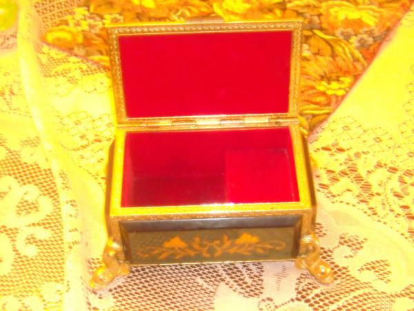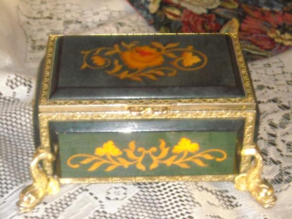 A music box made in Italy. It contains Reuge Swiss Musical Movements. The song it plays is called "It's Impossible." It has fish head shaped legs. The design on the top lid and sides is mainly floral. This music box is to be a Italian music box, wooden with floral inlays, 4 1/4 inches by 2 1/2 inches by 3 1/2 inches, ornate molded brass feet, with Reuge Swiss movement, playing "It's Impossible", non-working activating pin in the lid. It still plays music when winded.