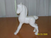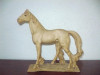 The figurine is a plain brown horse standing on a small patch of grass with a few rocks strewn about. The horse is saddled and bridled and has leather reins that cross over the saddle. The entire figure is mounted on a dark wooden base (stained a cherry wood color possibly). The song that the figurine plays is the theme song from Chariots of Fire. There is a label on the bottom of the wooden base that says "The San Francisco Music Box Company" and under that is "1994 the san francisco music box company". there is also a "made in Thailand" sticker.