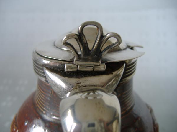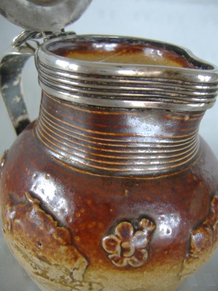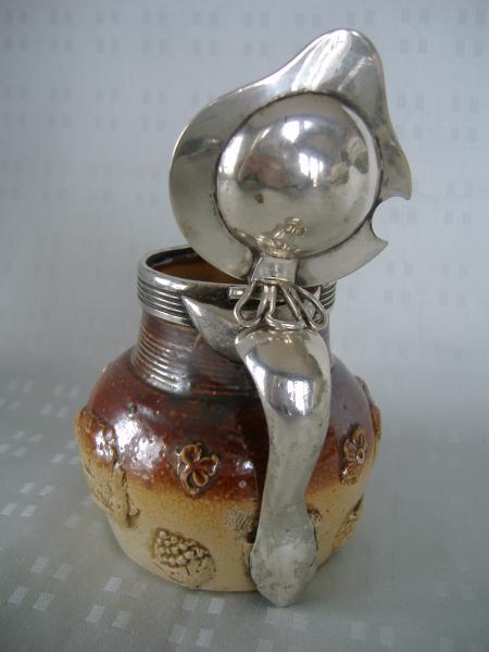 This little mustard pot has been around for years. I think it came from my grandmother at some point and I'm wondering if this is salt glazed. There is silver at the top of the pottery edge as well as the cover and handle. There is a spoon that goes with it but I have no idea if it's original. Any clues??