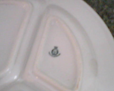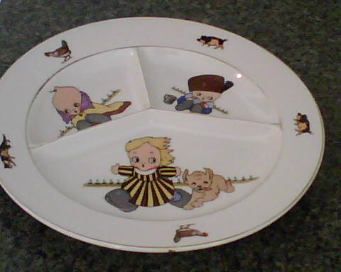 3 section dinner plate. Marked Musterschutz Nr.4558 on one section and marked union k made in(can not read where made print is to small). Gold rimmed plate with what are possibly one child per. section 2 boys and 1 girl with a dog. The rim has a cat, 2 pigs, and 2 roasters on it. each section is approx. 1" deep. Plate measures 10 inchs wide and approx. 29" around. One small scratch on gold around rim. and painted children have minor scratches on them.
