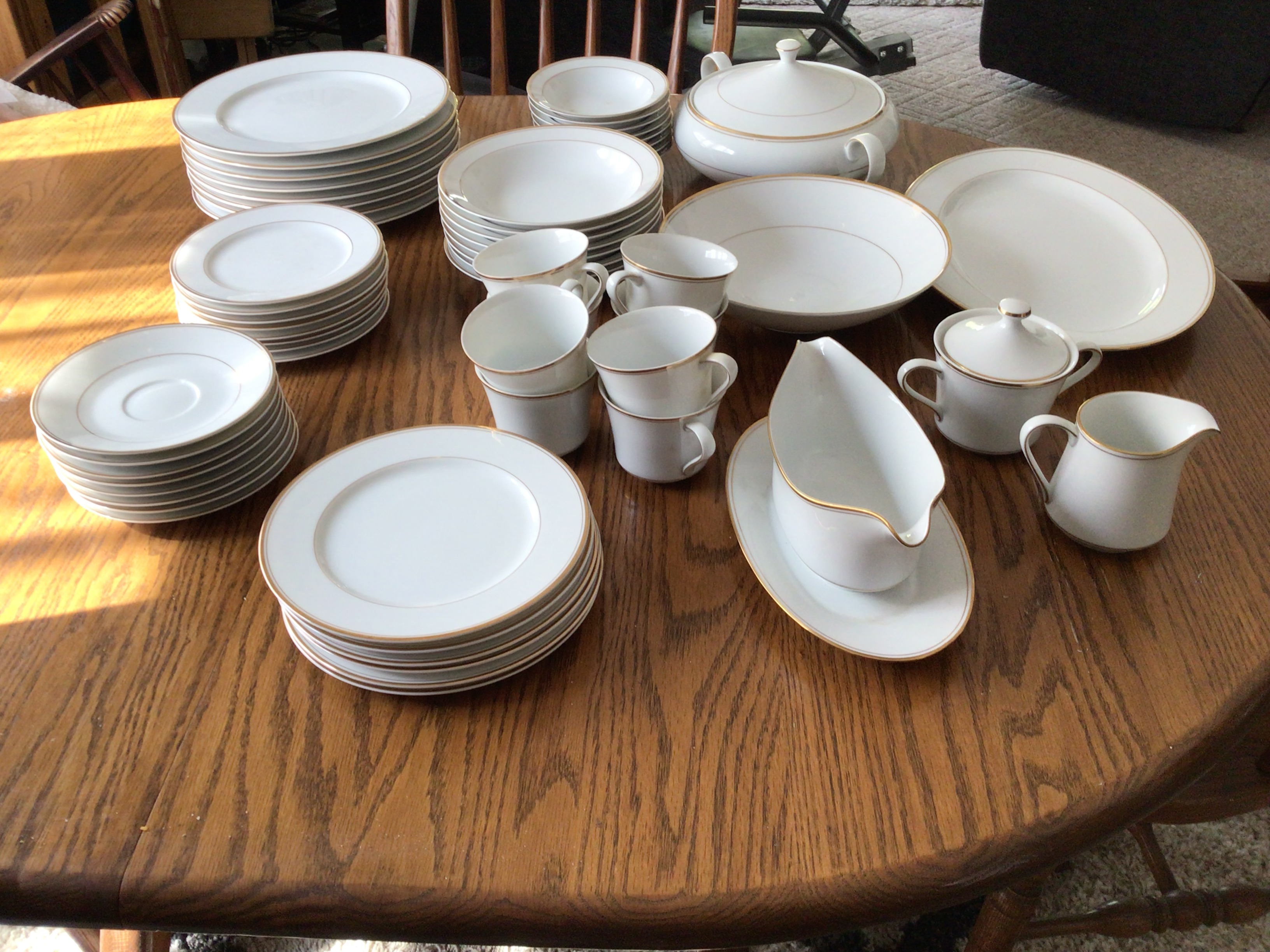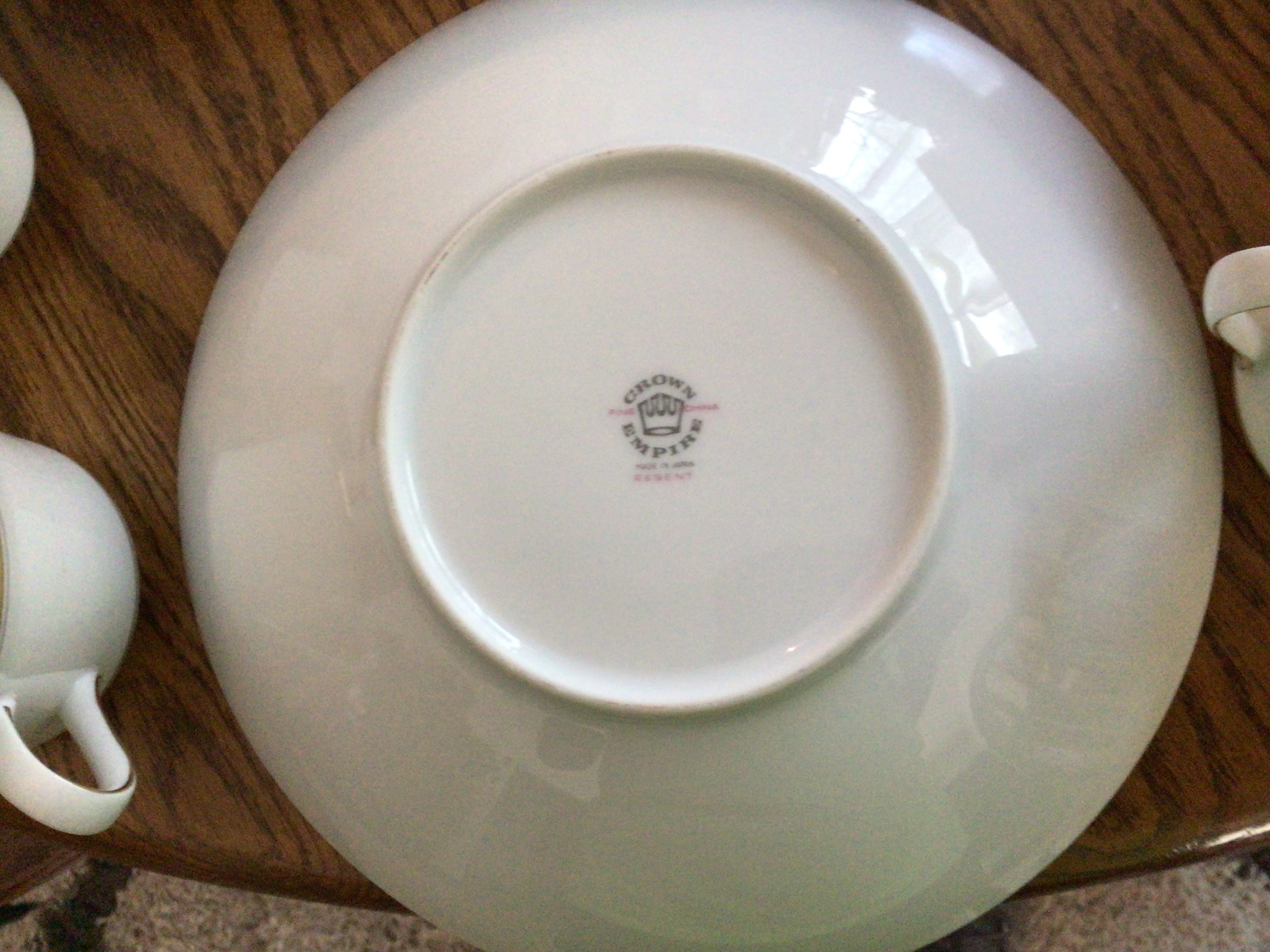 I have inherited a full set of Crown Empire Regent Edition fine china, 92 pieces total. It was a wedding gift to my grandparents in 1942 and is in immaculate condition, kept in a china cabinet and only used on formal holidays. No scratches, chips but is missing (2) 8” saucers and is Gold trimmed. Consists of serving platter, serving bowl, covered vegetable bowl, gravy bowl with attached saucer, sugar bowl, creamer, 8 coffee cups and 8 saucers, 8 salad plates, 6 appetizer plates, 8 dinner plates, 8 soup bowls, and 8 small bowls. I'd love to know what it is worth, and I'd like to sell it. Thank you Sherry Holbrook 2198637041