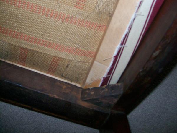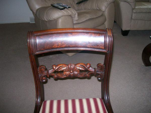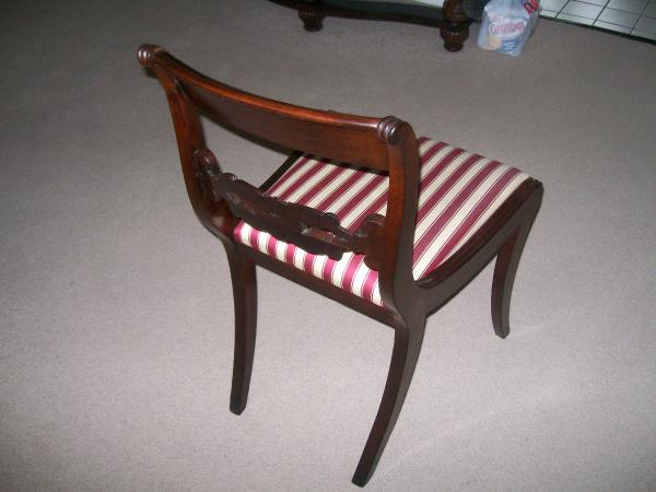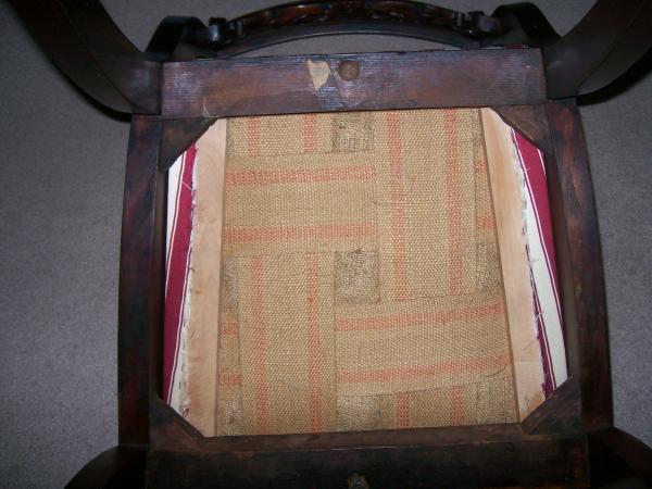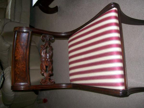I purchased this antique chair in a very reputable antique mall for $210.00 down from $500. The dealer is pretty reputable so I have been told. The chair is in great condition. A few straches and nicks. NO CRACKS, OR missing parts. Chair is very sturdy and solid. The cloth is not orginal ( I can see new staples ) but is very beautiful. It indicated CA 1820 " Federal American " chair. I belive it to be Mahagony with a nice patina in the strraches and grooves. I believe the 1820 date to be accurate based on pictures of other chairs like it.