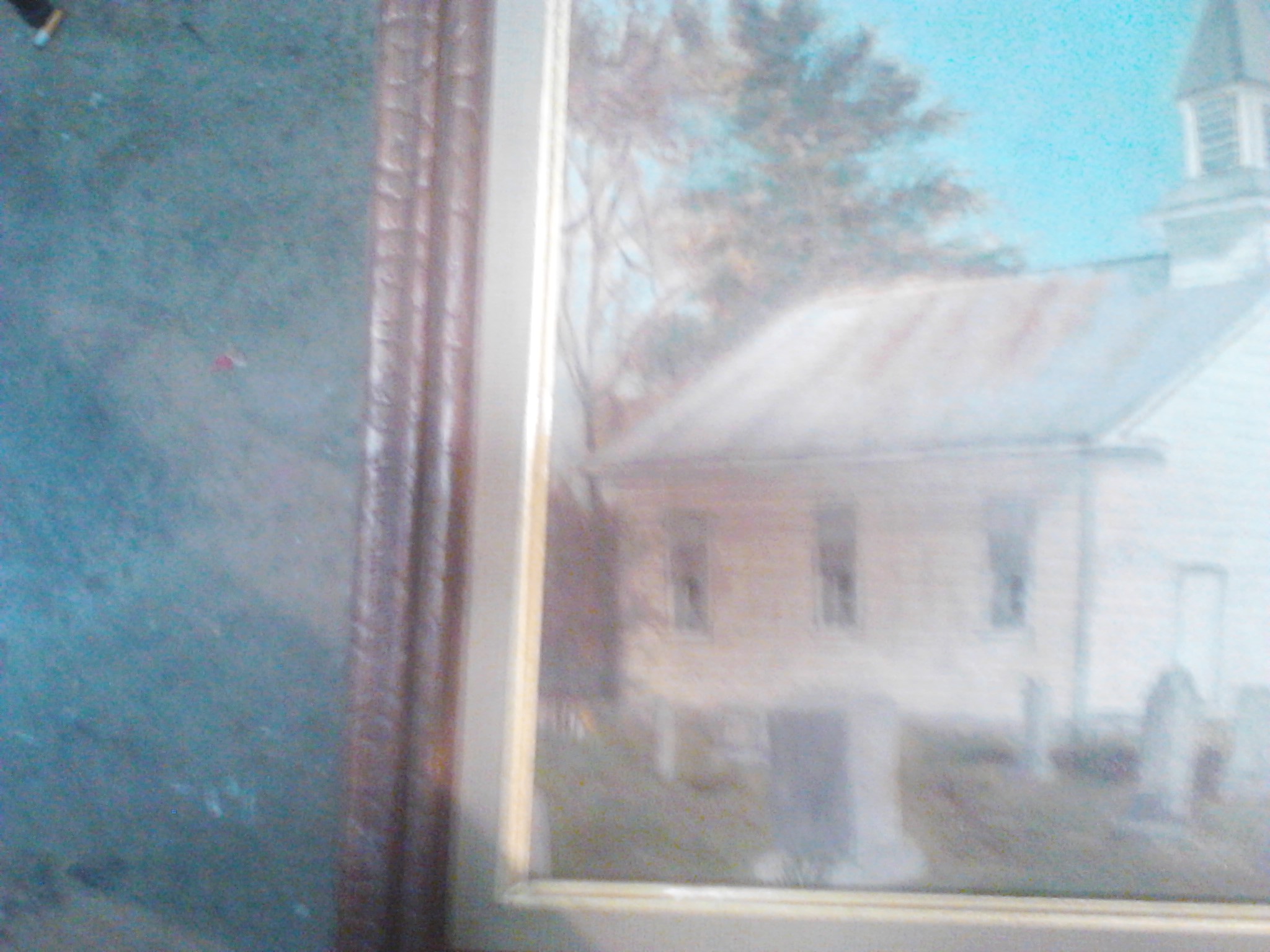 This is a painting of a church in the woods with a graveyard very nice peice.