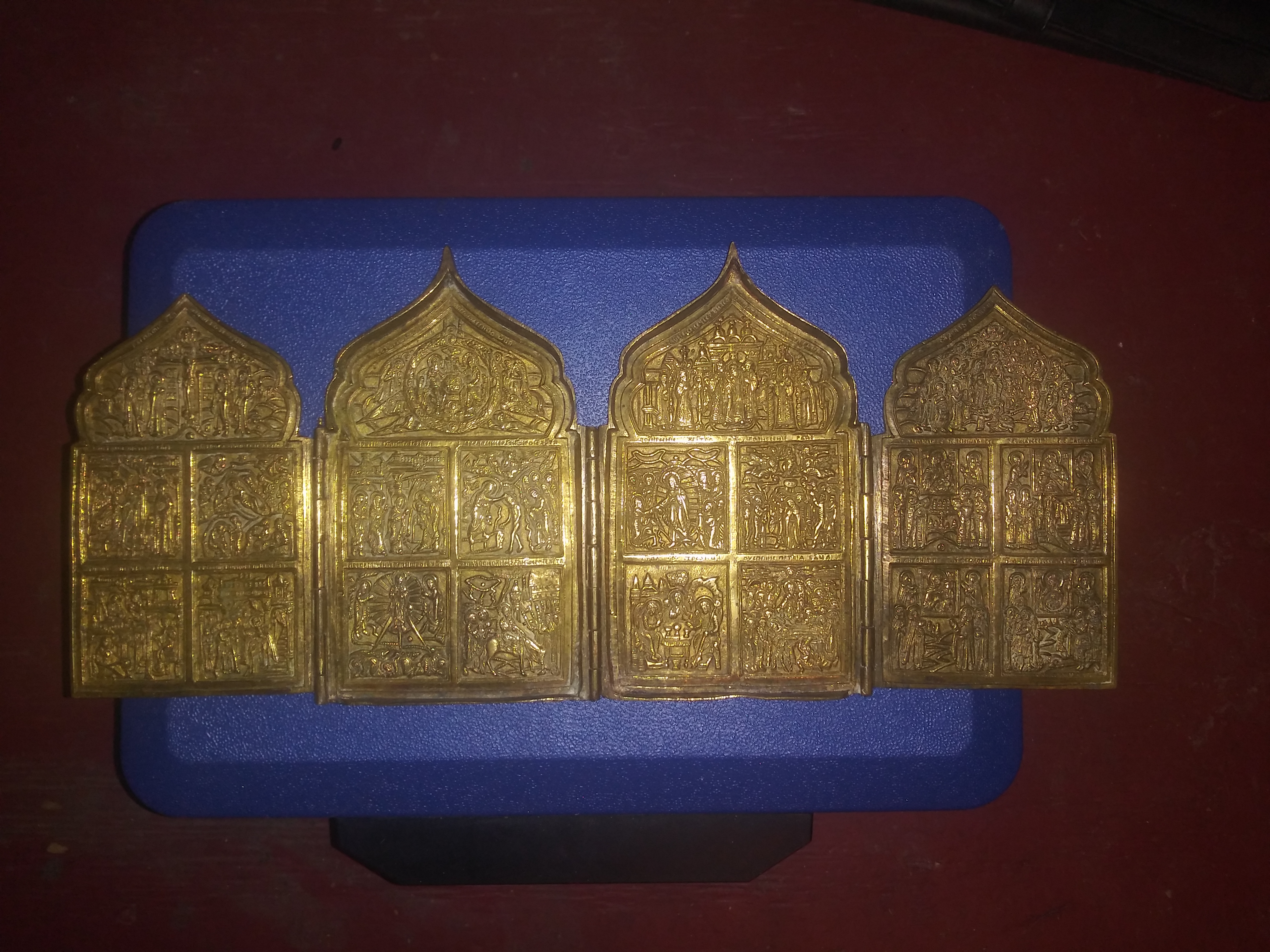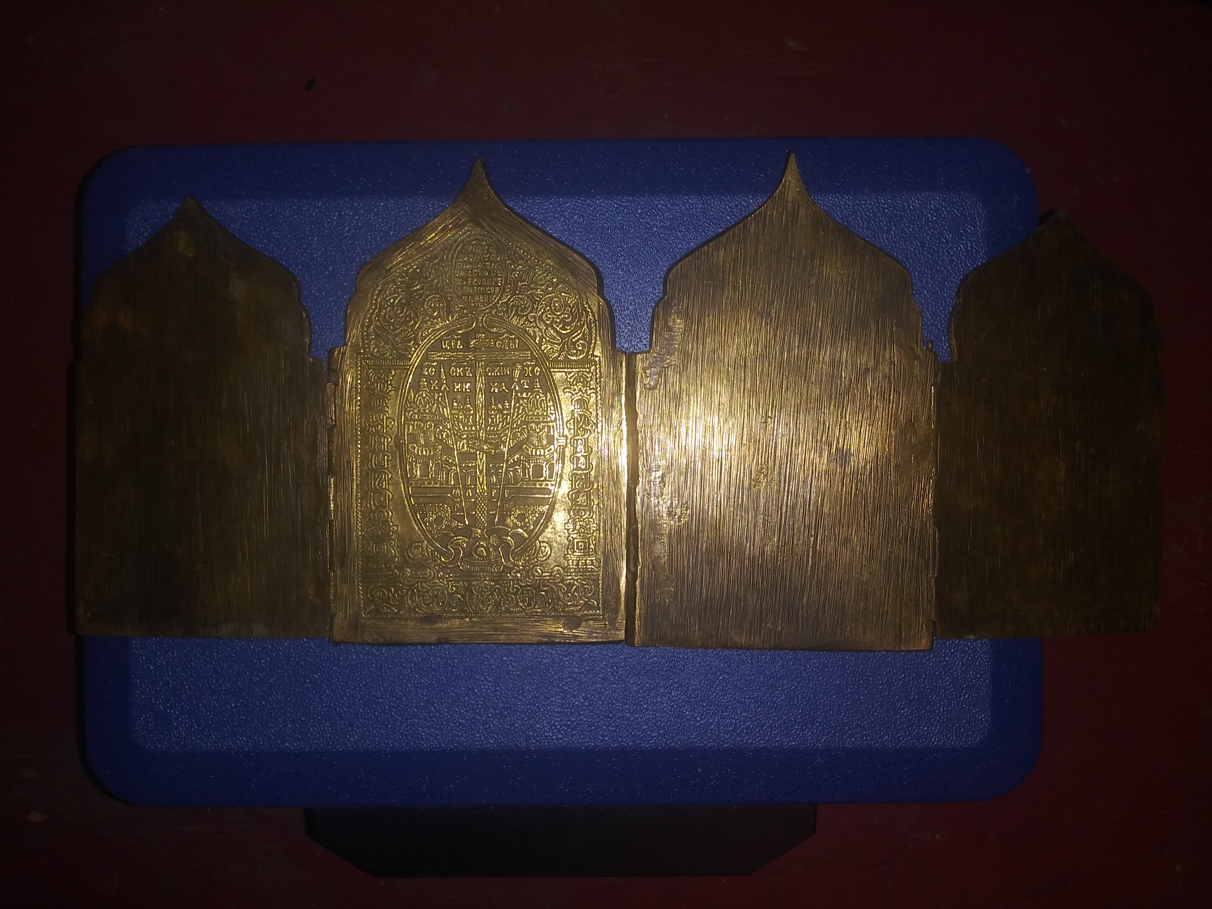 Came across this piece while cleaning. It's made of brass or something, I'm not sure. Four plates of brass that fold into make a single plate. They have detailed engravings. Took a minute to figure out the writing, I'm pretty sure it's Tajik. I could be wrong. I just want to learn all the information I can about this piece.