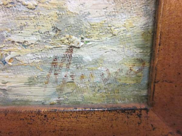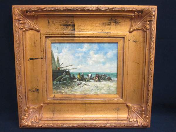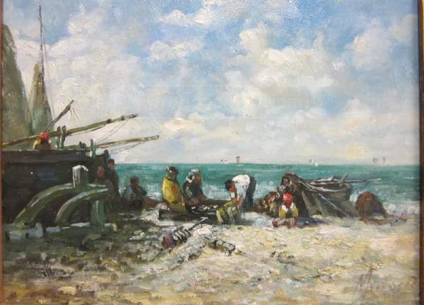I recently purchased this painting at an estate sale and am trying to learn more about it. There is an artists signature in the BR corner but I am unable to make it out. I looks to begin with an "M". The painting is 8 x 10 and looks to have been restreched onto a new frame at some point. It was listed as a "Beach Camping Scene" but looks more like a wreck or smaller boat coming ashore with gear. Hoping someone might be able to pick something out that my untrained eye can't see.