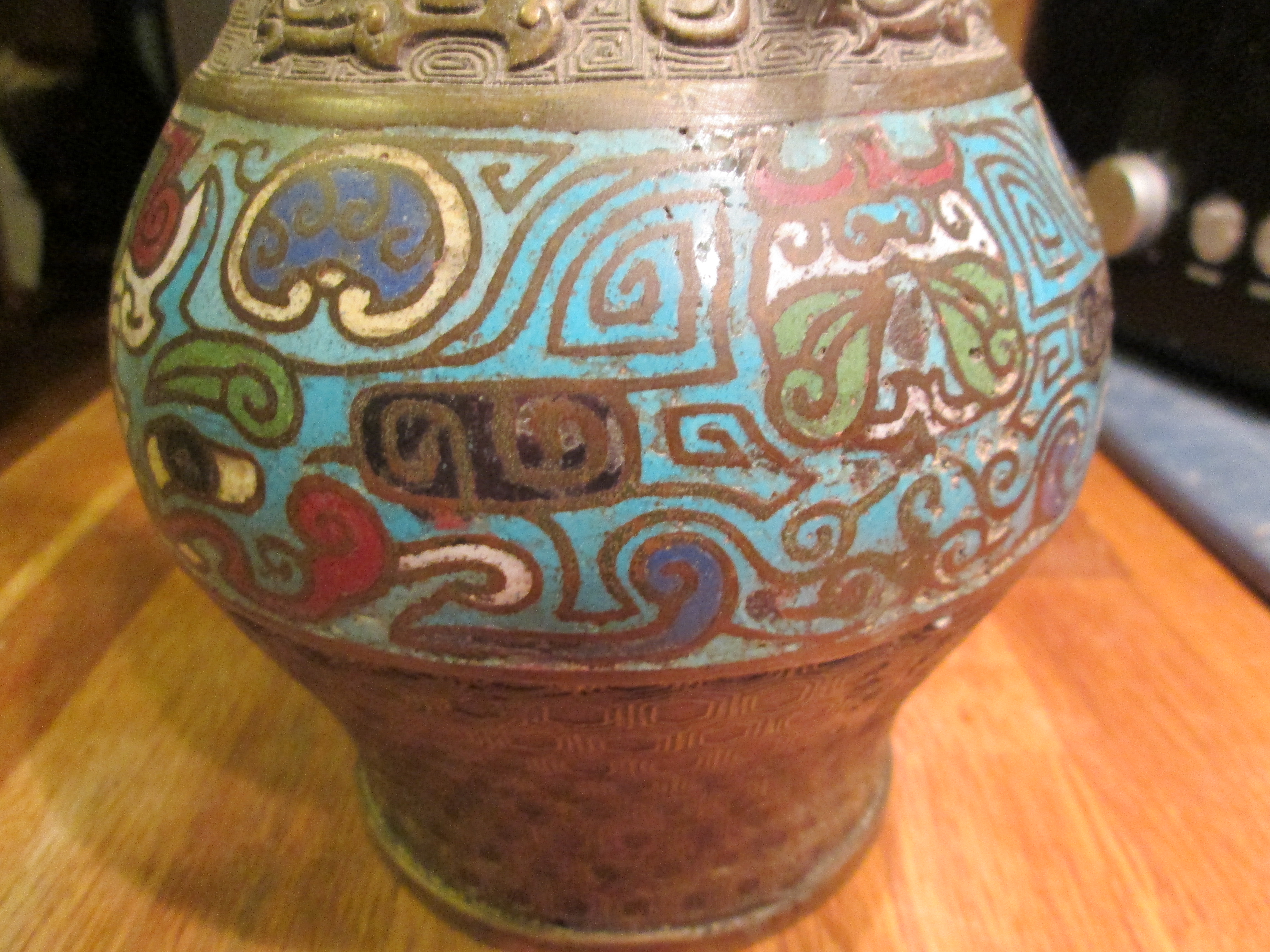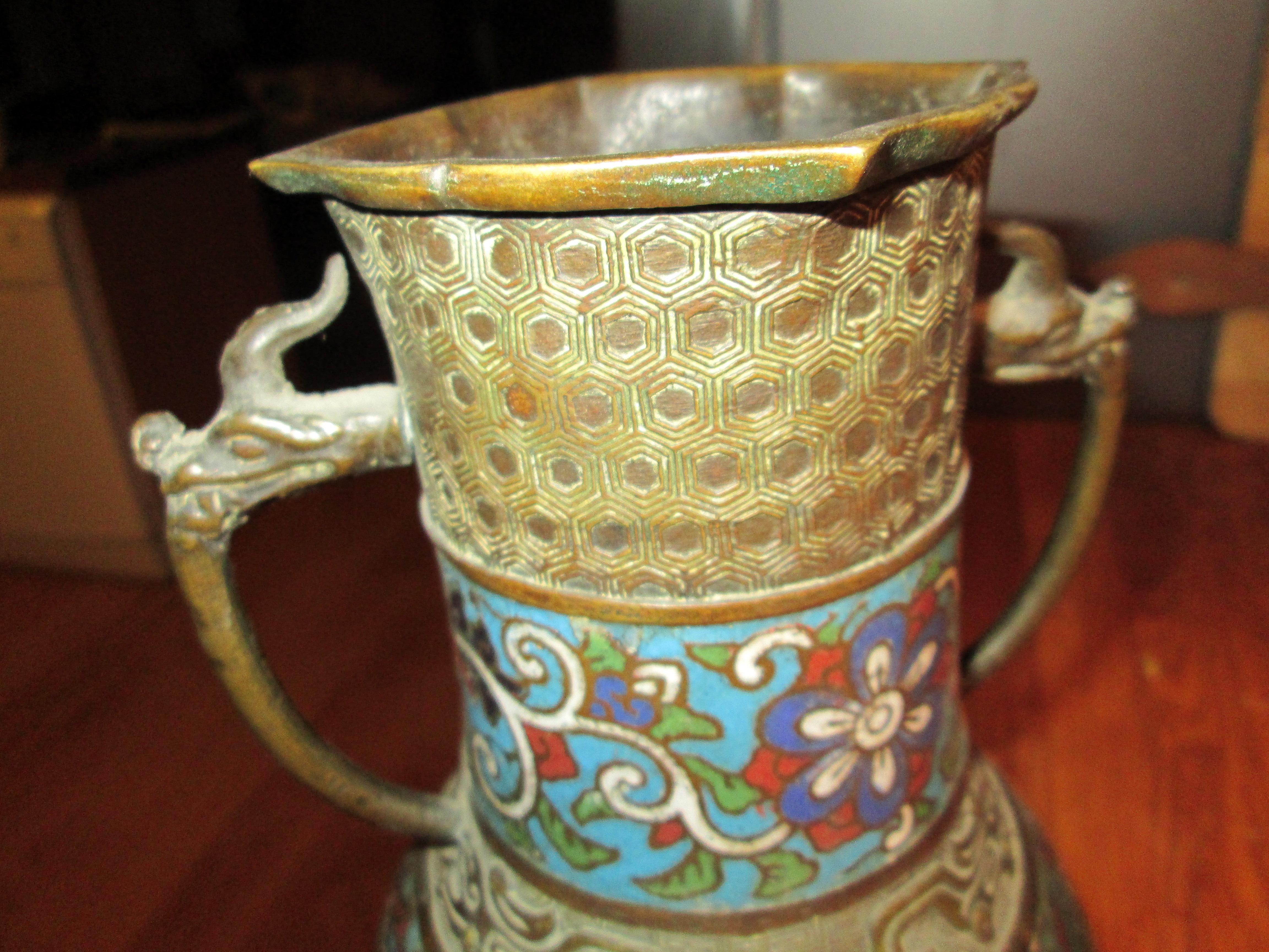 This is a vase bought with the contents of an appartment about 45 years ago. It is mainly some sort of metal, bronze or brass, wit a colour enamel or ceramic inlay. It has dragon shaped handles and although it is in the UK it definitely doesn't feel European. The colour is reminiscent of South America, Inca. But it could also be Chinese, or in some aspects it suggests Egyptian hyeroglyphs. Or even art-deco. It is in good condition and about 24 cm high and 15cm wide. It could be very old or a souvenir replica... although it looks fairly aged. Any ideas what it could be?