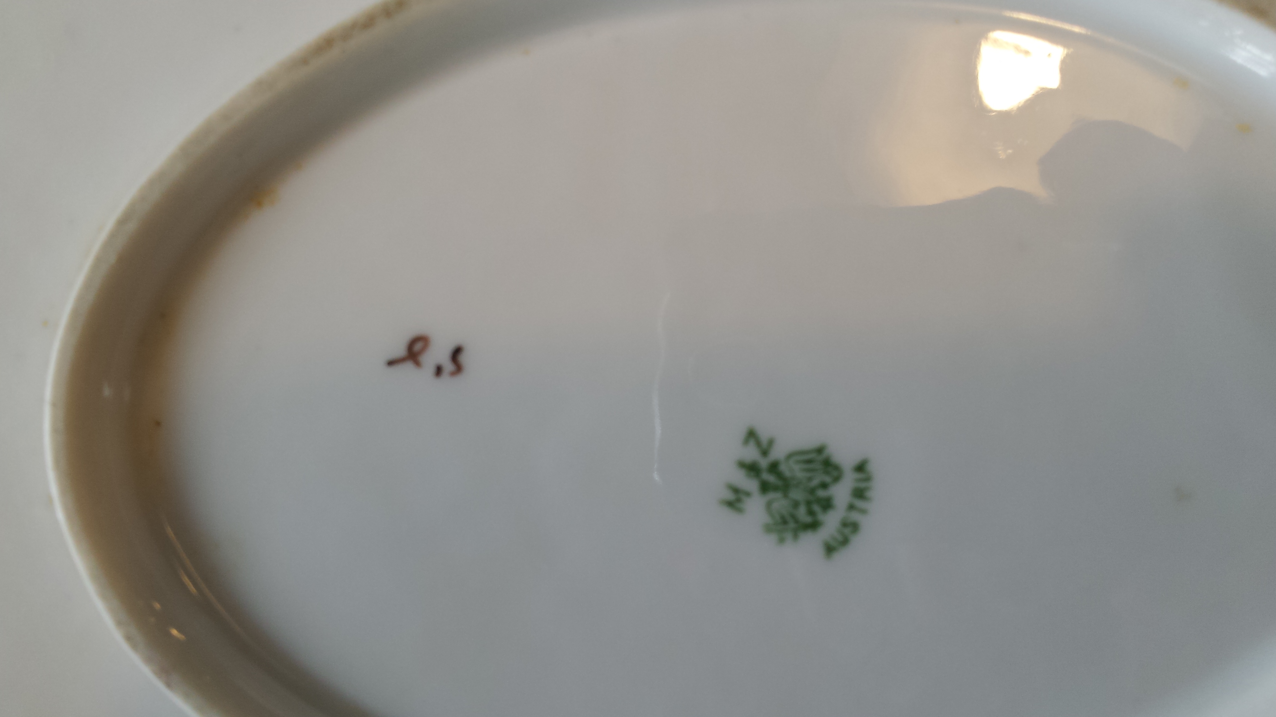 MZ Austria is stamped on the back. It is an oval platter that is 16.5"x12", with a gold rim (I'm not sure if it's real gold or not). It is in very good condition .
