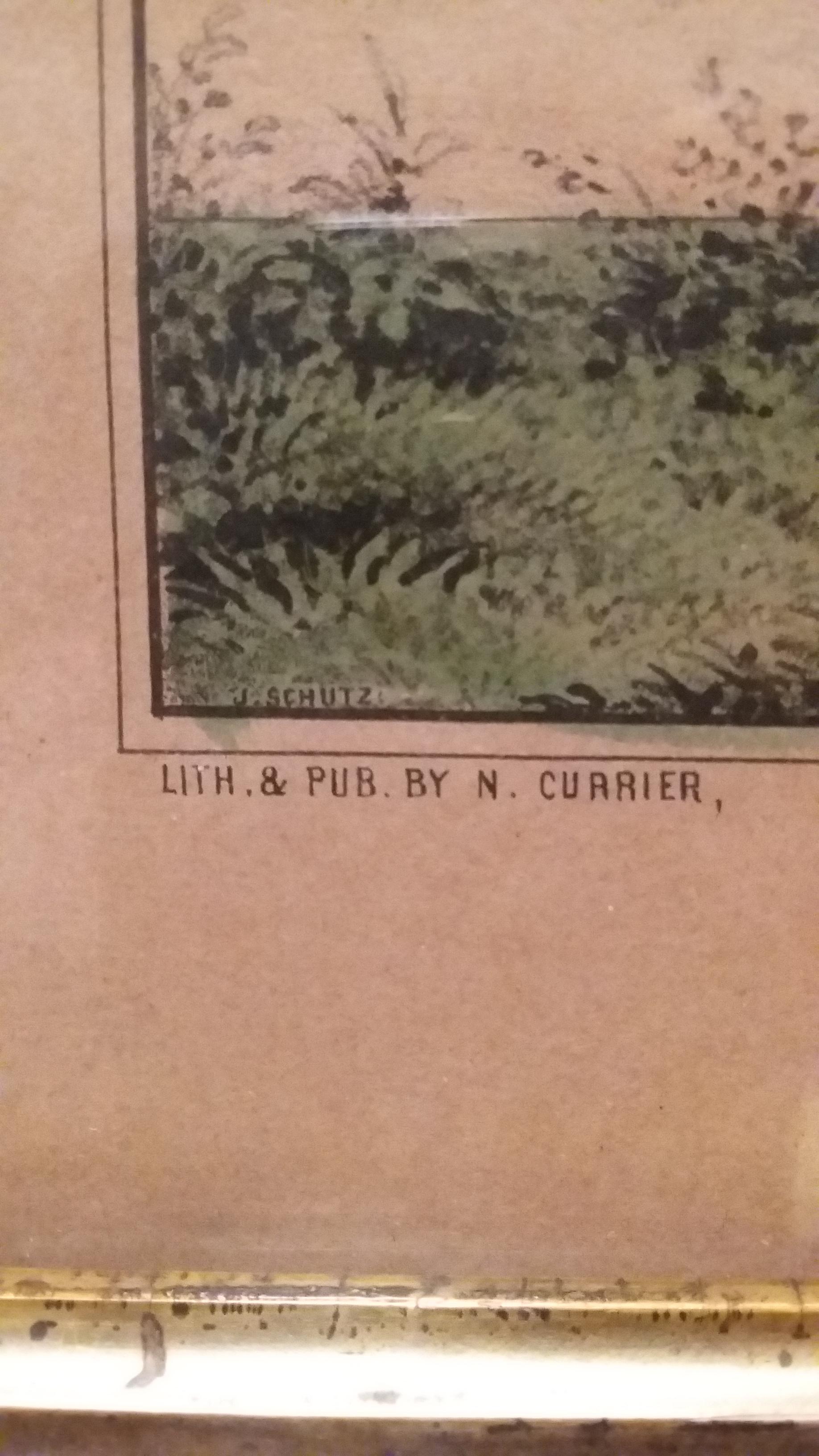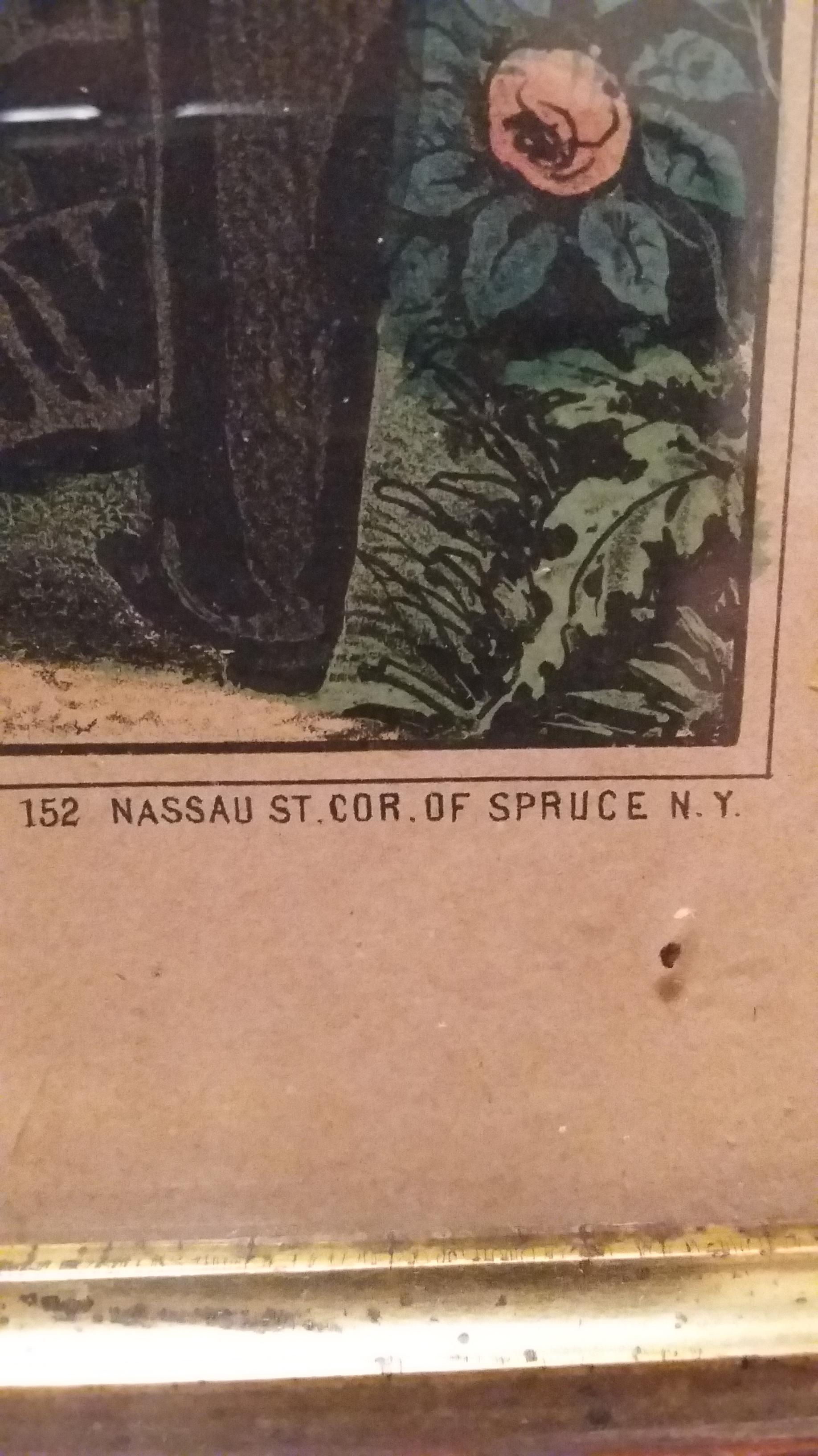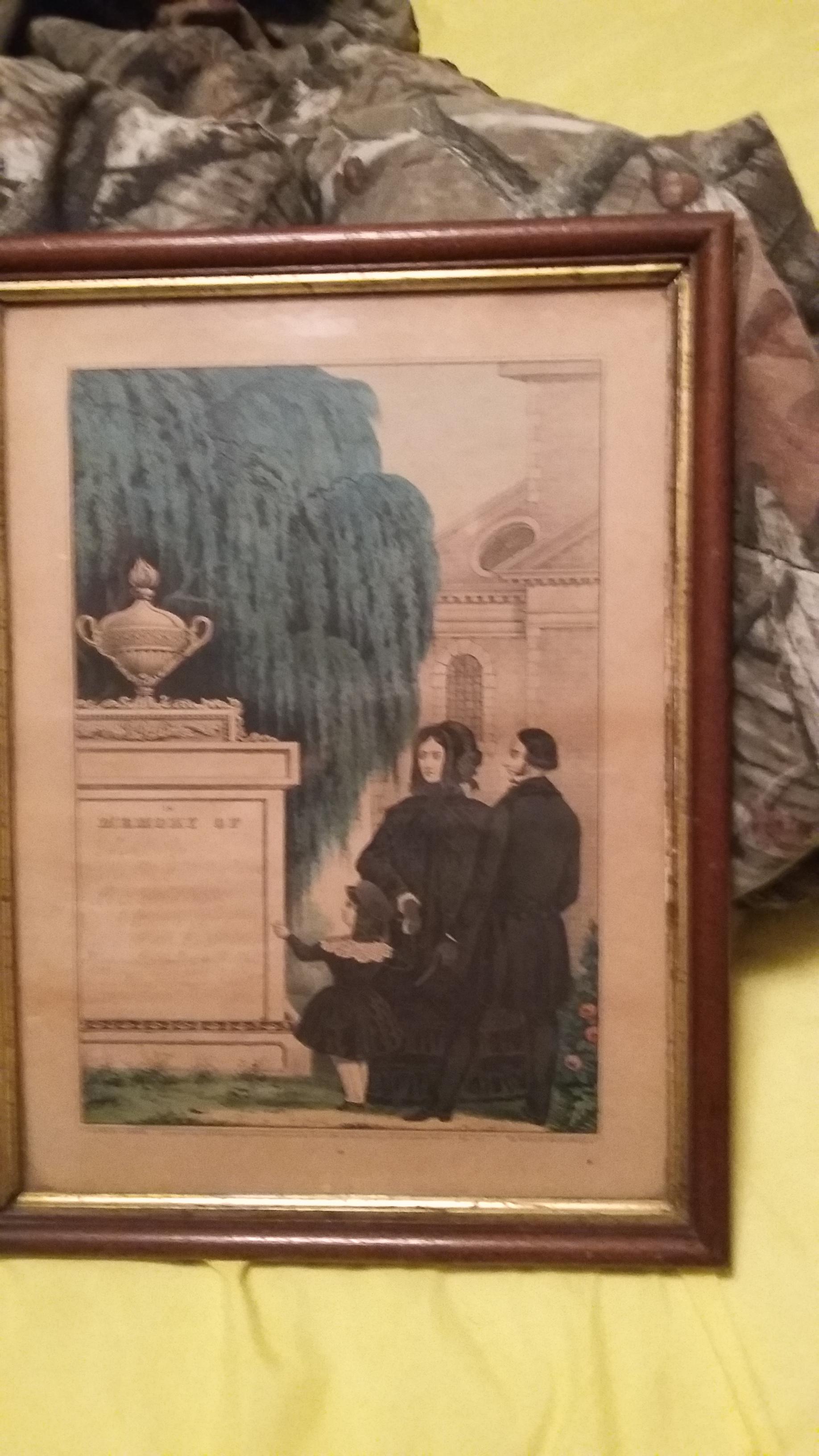 Nathaniel currier print depicting a family (2 adults and a child ) in front of a memorial gravestone that says "in memory of Albert warren died 1851 ....." the rest of the wording I can't read. It is framed in what I believe to be an original frame with wood slats as a backing and old nails (like tacks) holding everything in. The paper is very thick and heavy. No evidence of dot matrix. There are some words and numbers at the bottom that turned out to be an address of his. It's something like 152 cor. St. Spruce ny. (Sorry, I don't have the print in front of me) Also, it has something like a page number on the bottom. I think it's 153. All of the research that I've done leads me to believe that it is genuine and original, but I cannot find any record or documentation about it. Can anyone tell me what it is, and what it may be worth. Thank you for your time.