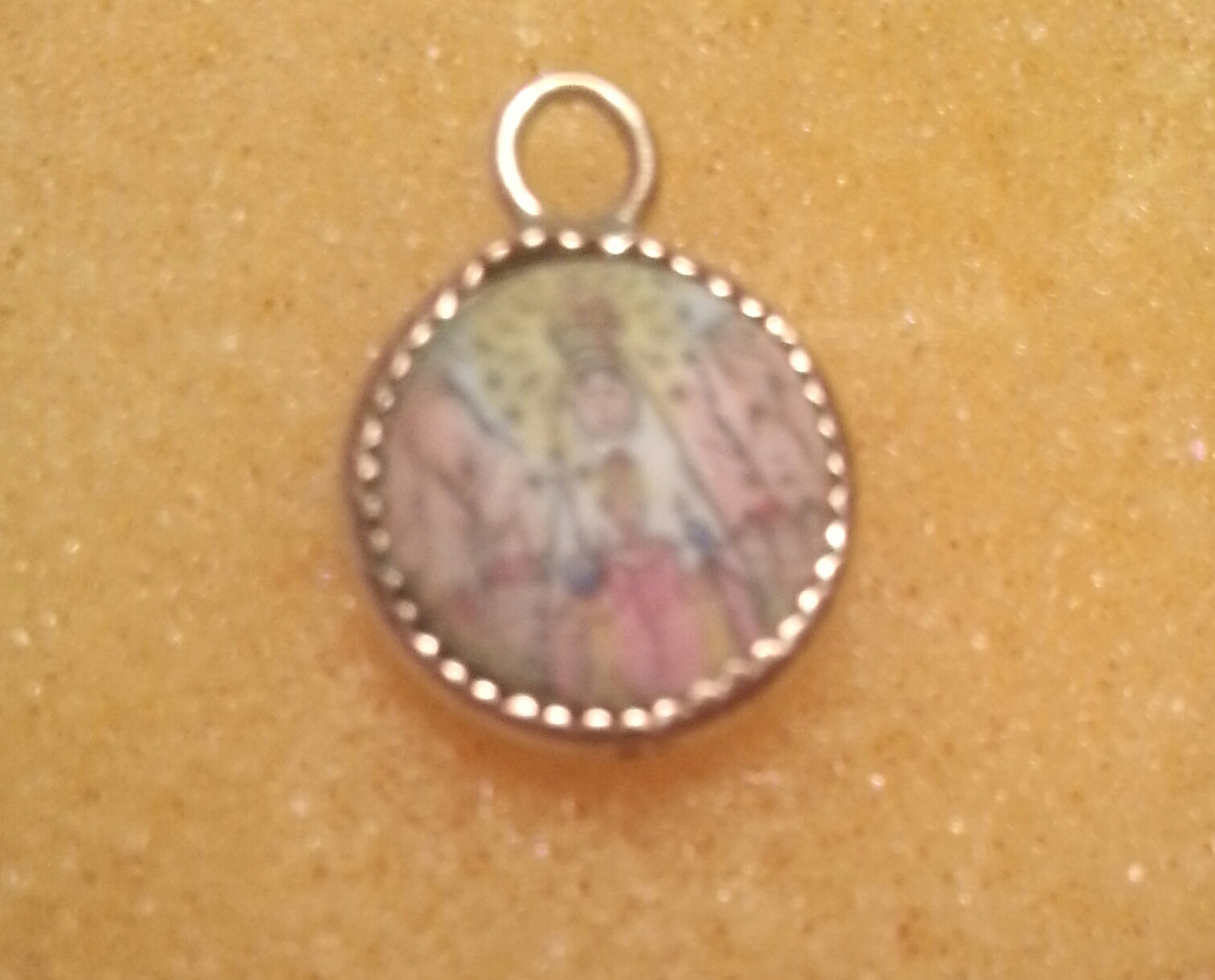 There seem to be Mountains in the background on the front where Our Lady is holding or standing with a child in front of her.