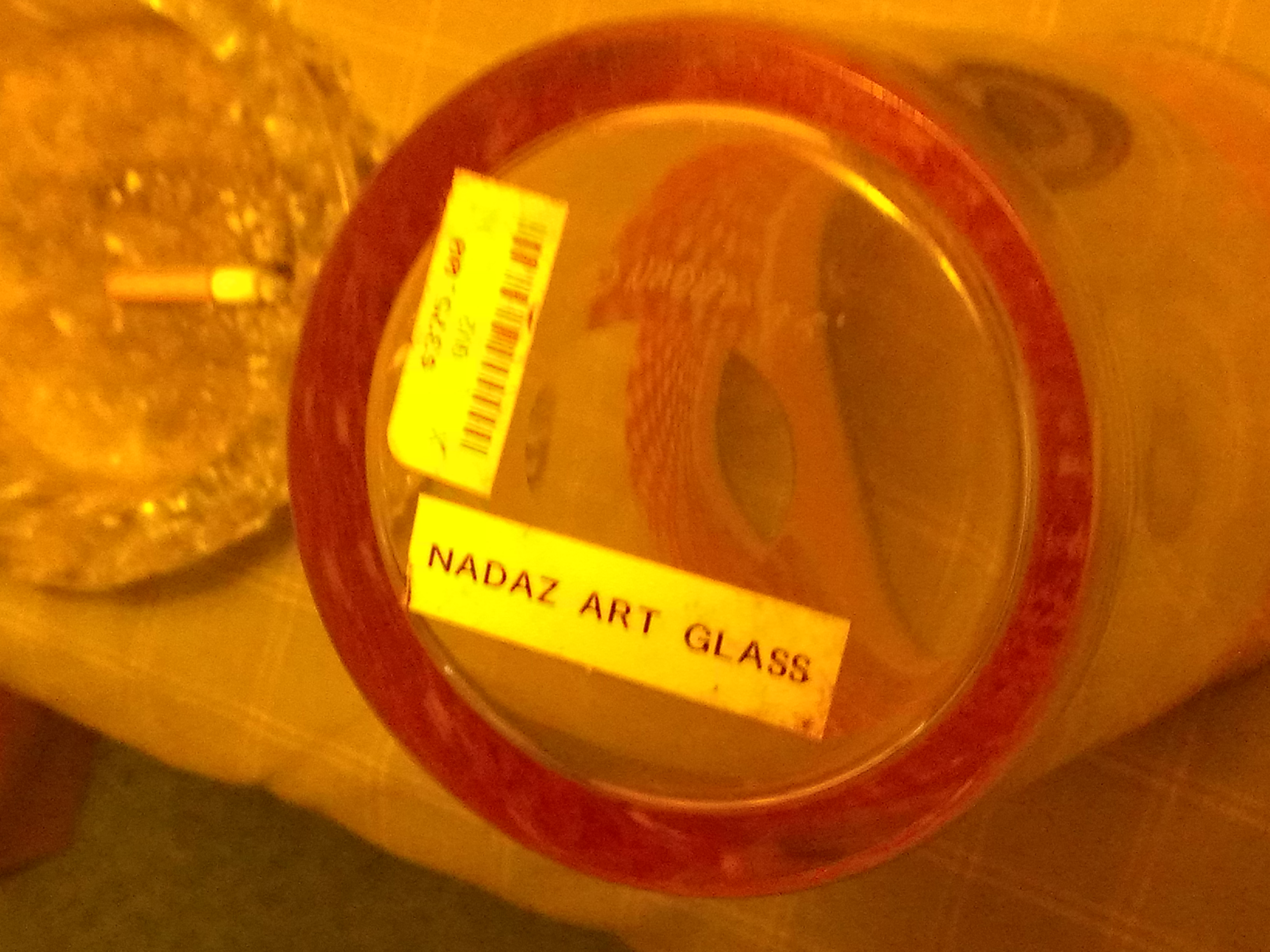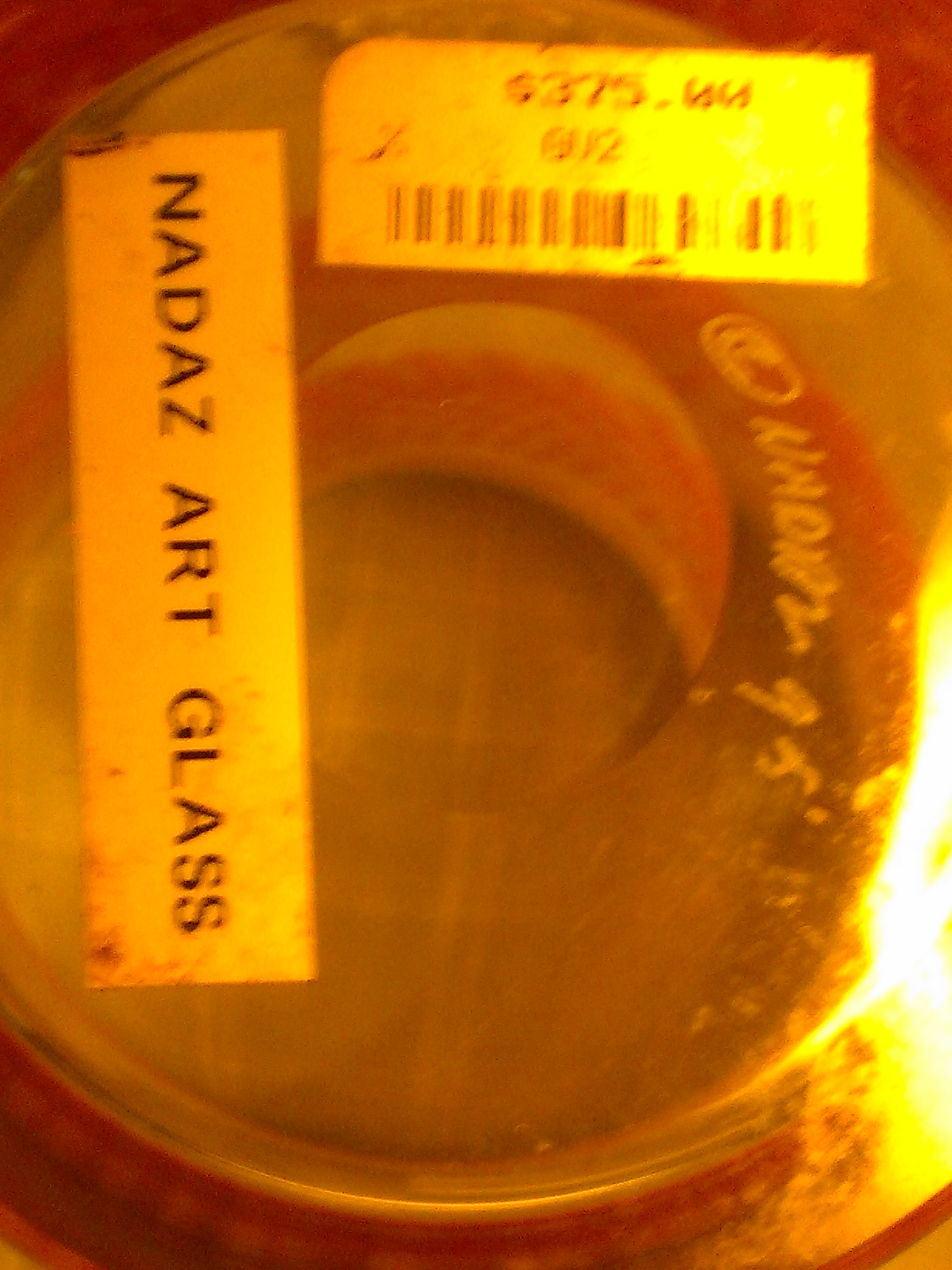 IT IS APPROX. 9" TALL, 5" WIDTH AT TOP, 3 1/2" AT BASE. WEIGHT IS APPROX 3LBS (+/-). THE TWO ORIGINAL STORE TAGS ARE VISIBLE ON THE BOTTOM. "NADAZ ART GLASS" AND THE BARCODE WITH PRICE TAG OF $375. I'VE TRIED TO CAPTURE IN THE PICS, "COPYWRITED NADAZ 95" THAT IS ALSO ETCHED ON THE BOTTOM.