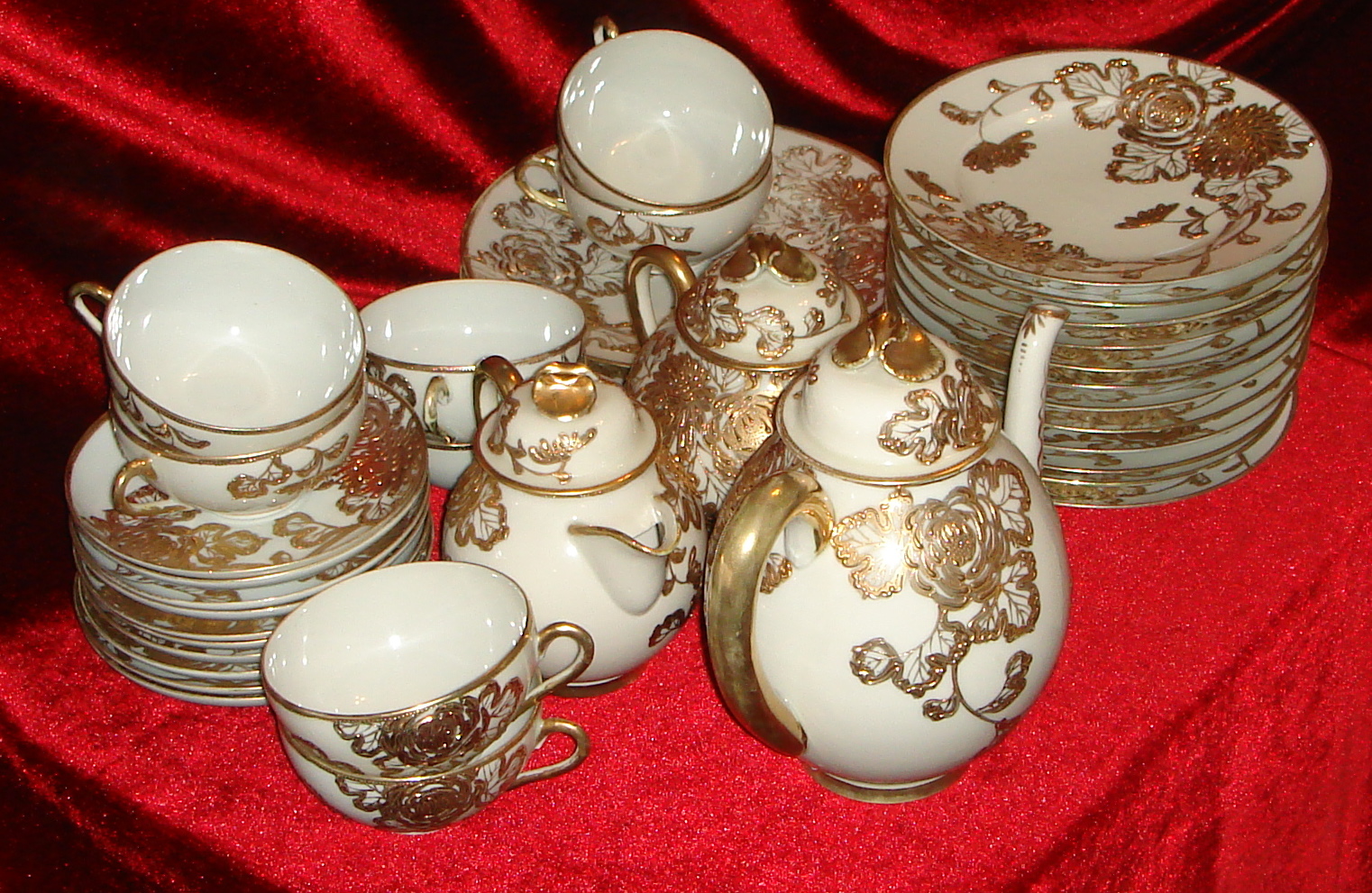 I have a gold on white teapot/lid, sugar bowl/lid, creamer/lid, 8 teacups, 10 saucers, 10 sandwich/dessert plates( 2 have slight issues) 2 larger serving plates(some wear on gilding.