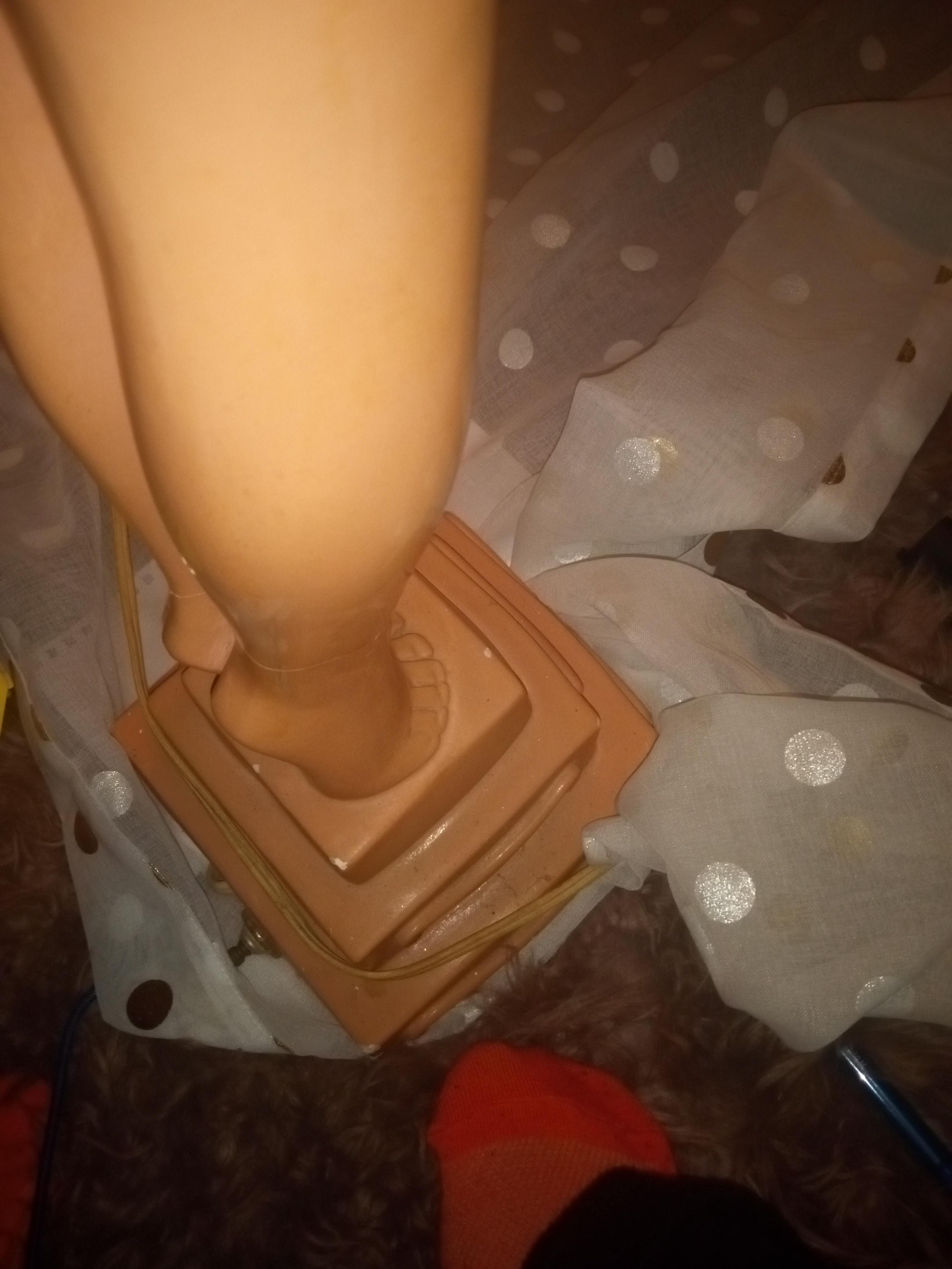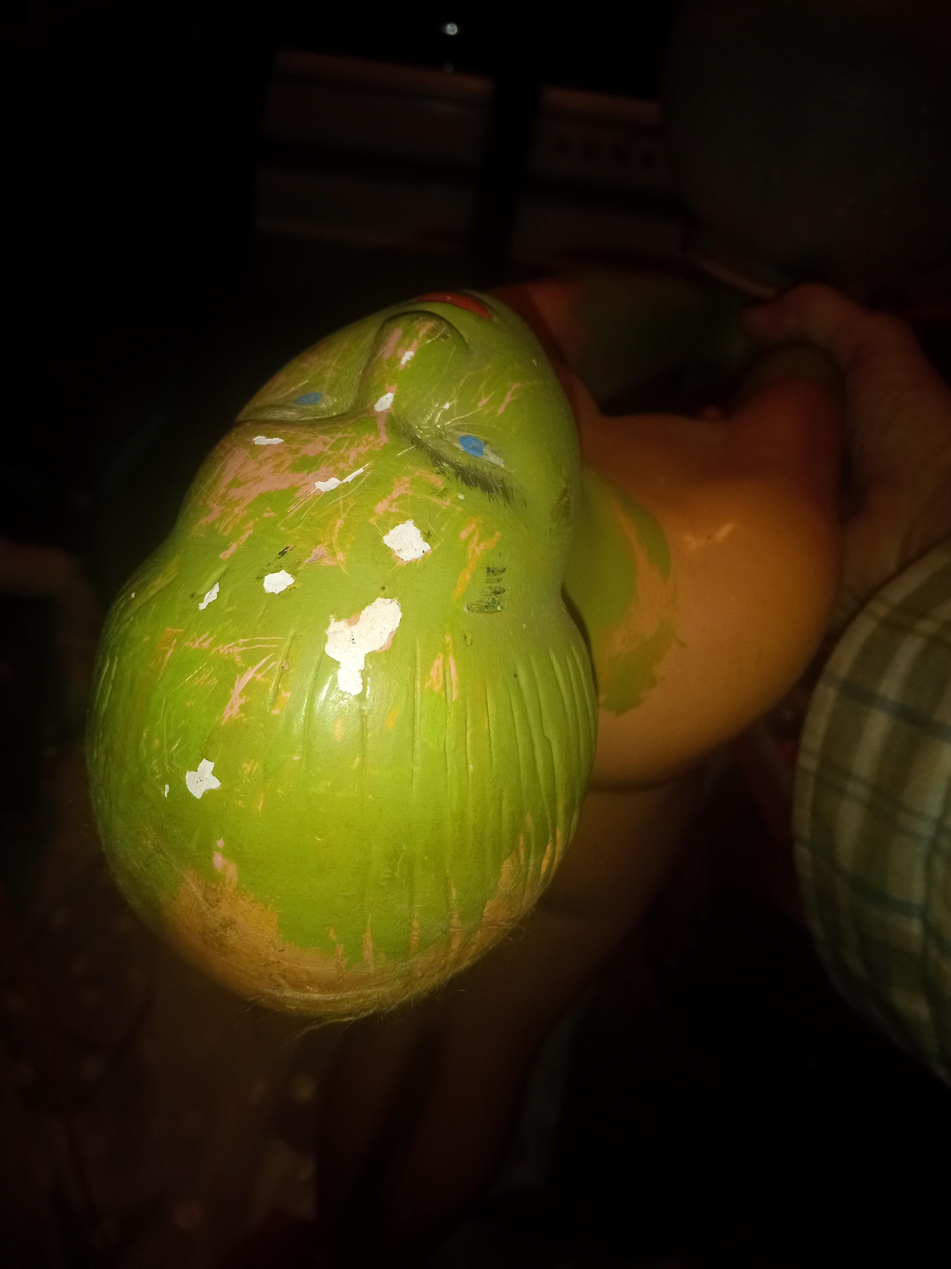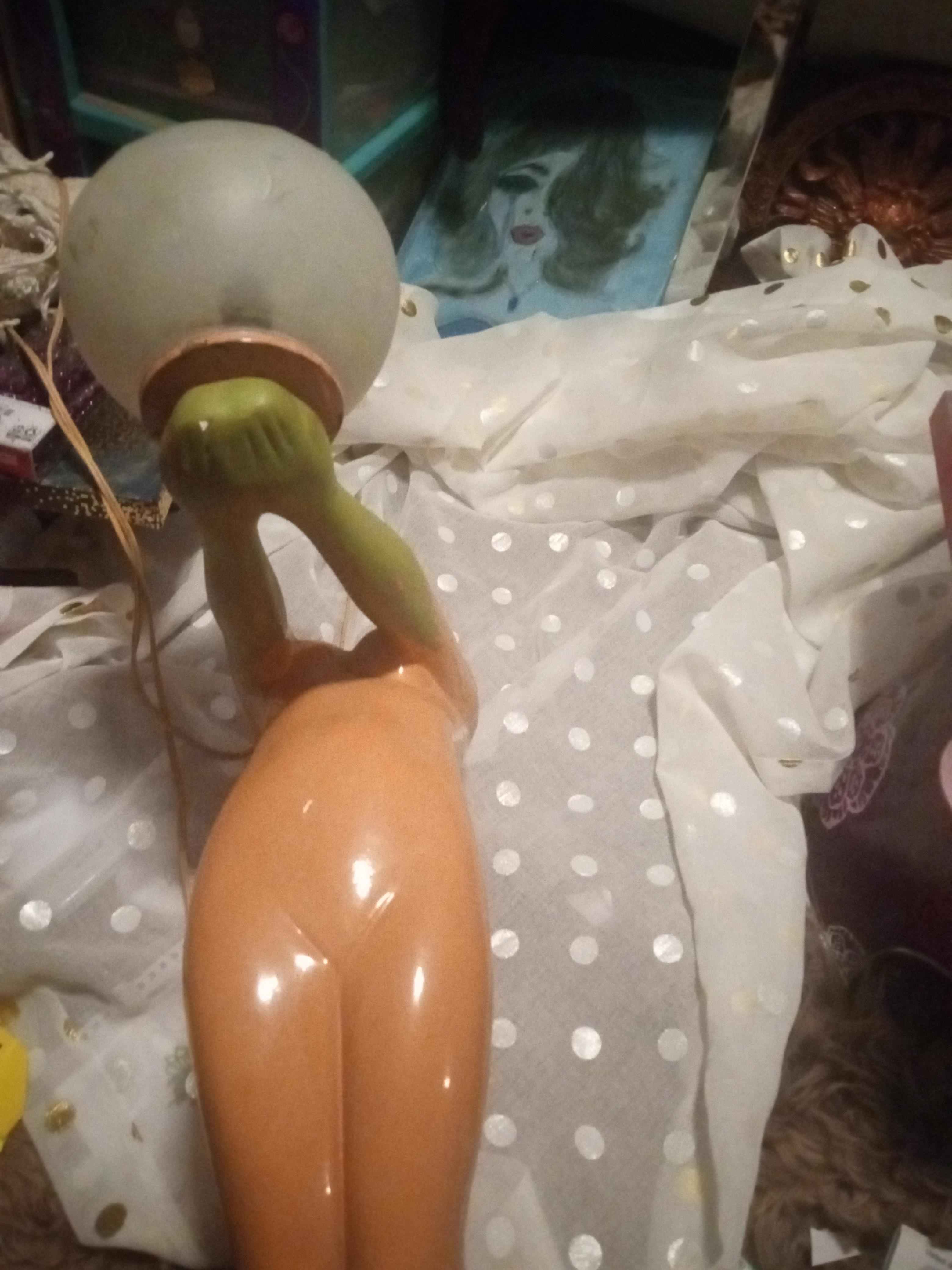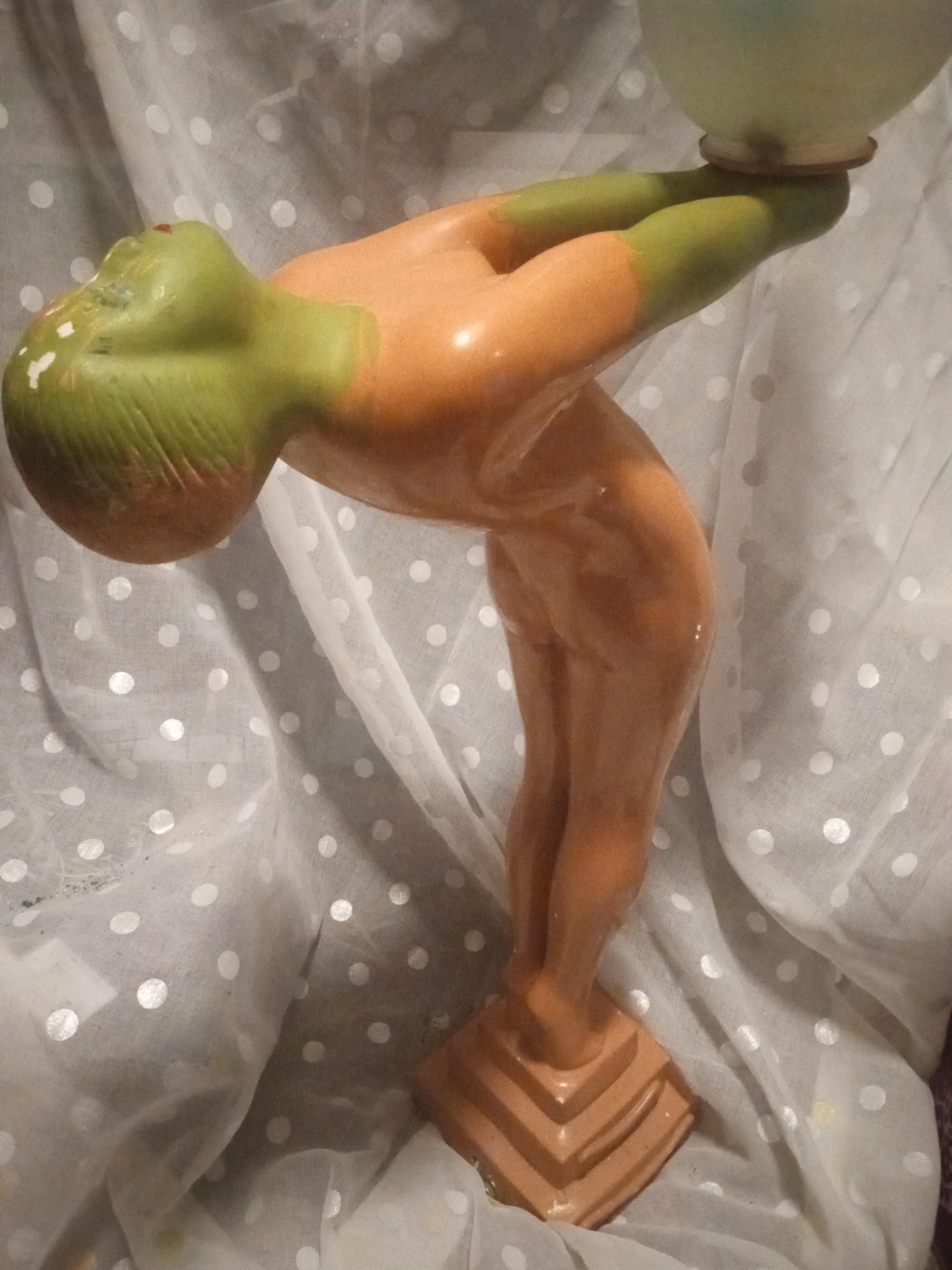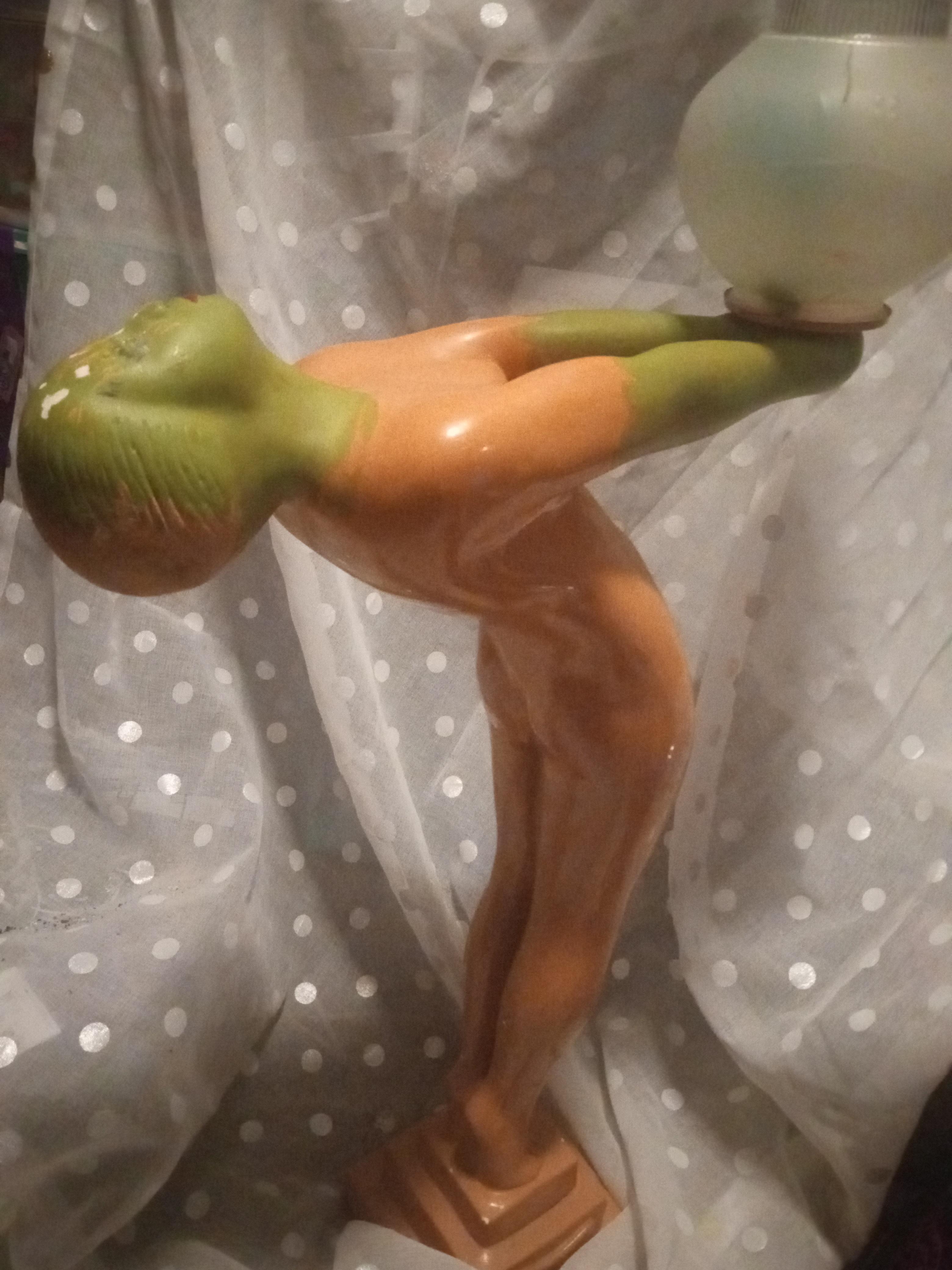 This is a ceramic lamp I do not see any markings. I'm guessing someone painted the face and arms green. It seems to come of easy