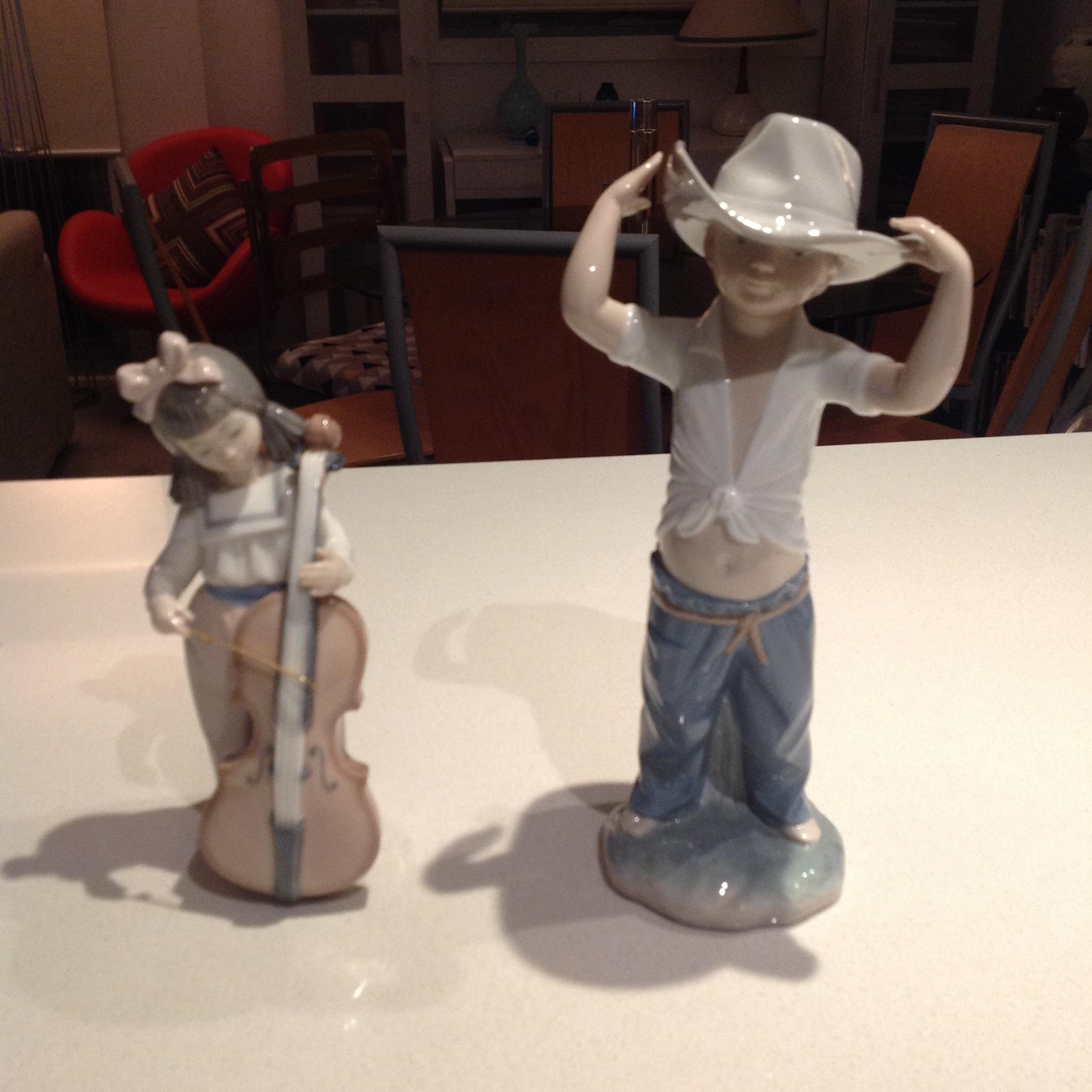 1. Little girl playing cello, handmade in Spain by LLadro sticker no 575. Writing is in a copper colour. Distinctive markings etched into figurine. Both eyes are not outlined in black.