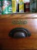 Antique primitive early large old hoosier with flour drawers lined with tin. Has two shelves, and two pull out bread cutting boards above the drawers. Beautiful ornate hardware. Dark wood. Orriginal finish.