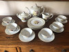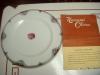 White background with Aqua leaves and pink and aqua lilly of the valley flowers gold leaf trim on edges of plates