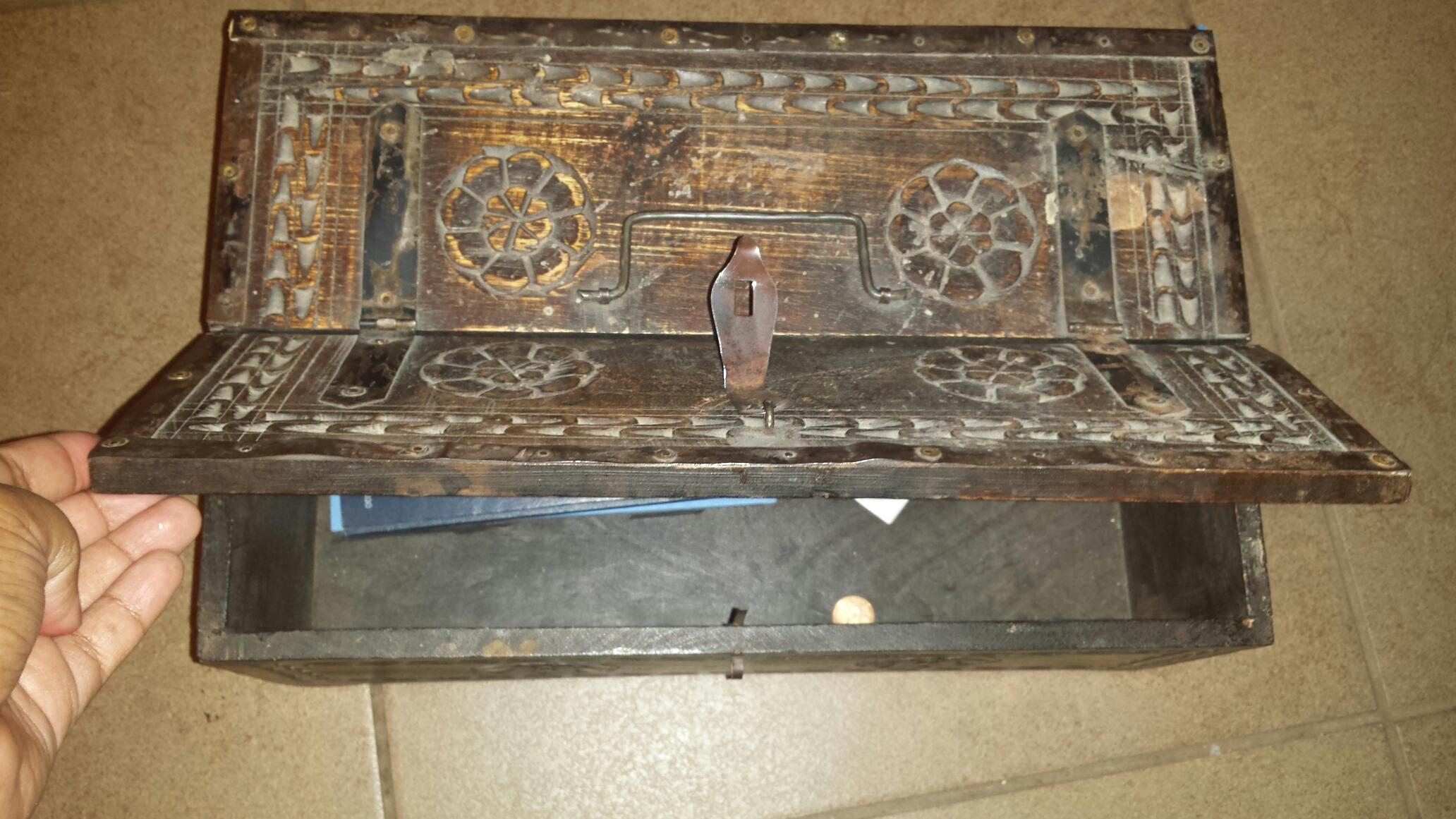 Wood chest lid opens half ways, old hinges, metal strip along sides top small feet. cant find a maker or mark got flower type design and a u shape designs