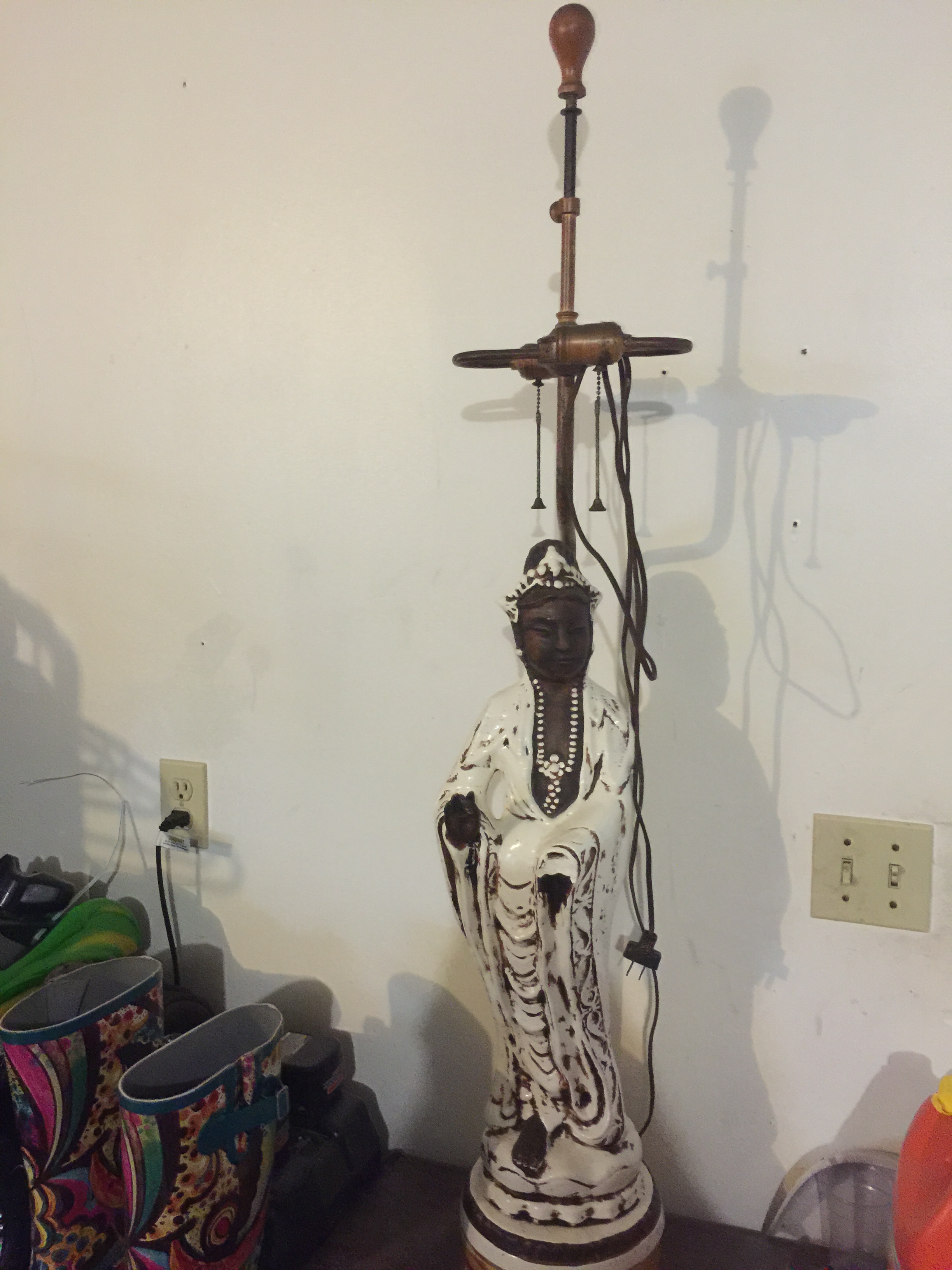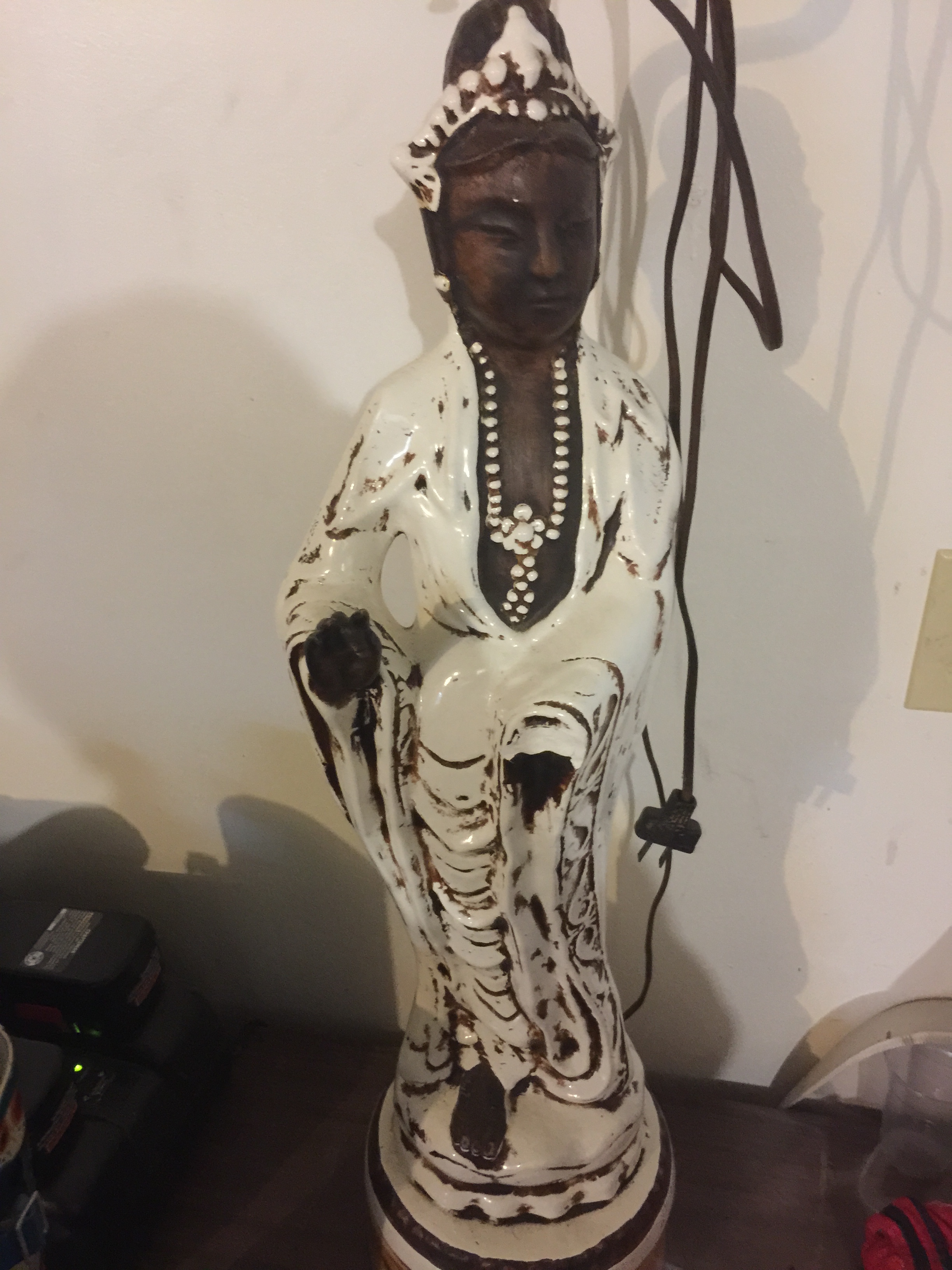 Asian. Please supply an image of the back view. Can I assume this lamp mount is in the French style and not drilled through that ceramic? A back view should answer this question.