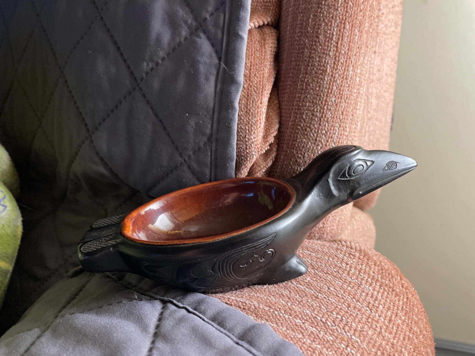 This exquisite Native American pottery piece is designed in the shape of a bird, showcasing both artistic craftsmanship and cultural significance. The bowl features a glossy reddish-brown interior, while the exterior is a rich black, characteristic of traditional Native American pottery.