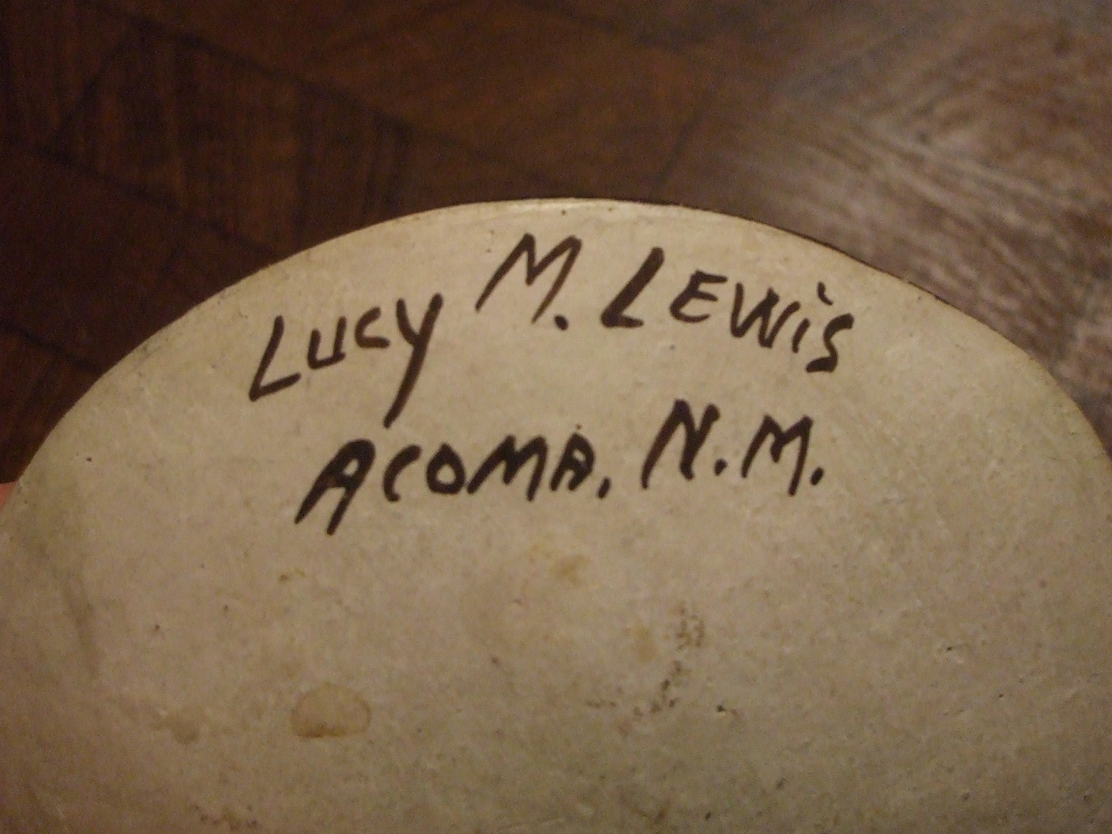 This is a Lucy Lewis plate, purchased at aution in 90's. It is in excelent shape but a few places where black glaze is gone.