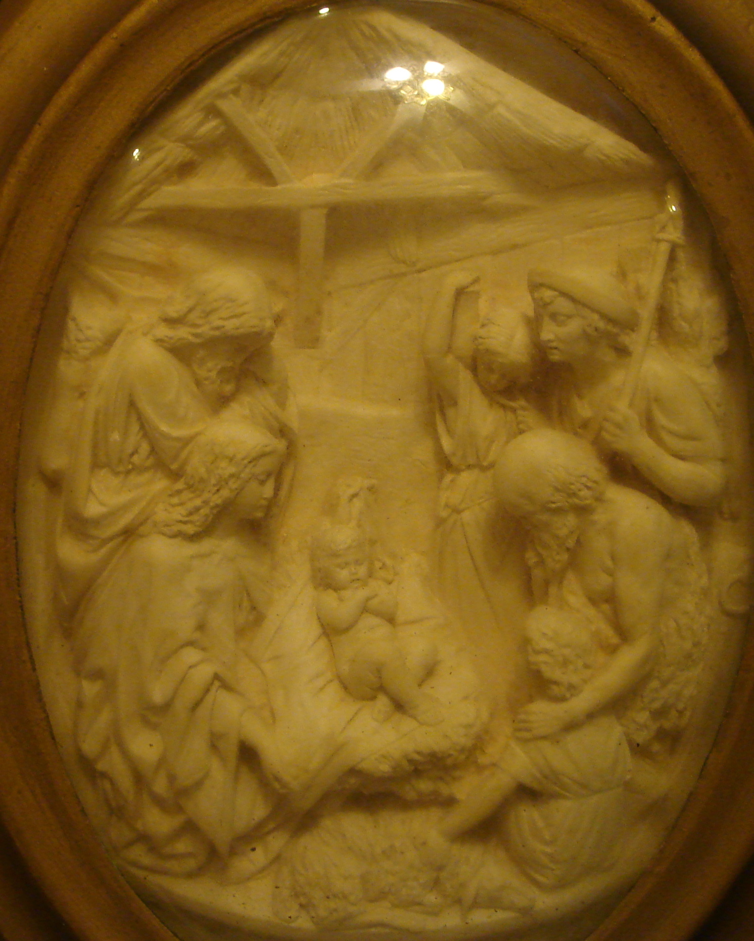 The is a beautifully carved relief, and appears to be from some kind of stone. There is some script on it- "J'Fonlana 1858 Edileur" It's been covered in domed glass and some kind of plaster frame. There are specks of gold paint on the inside of the dome...don't me how that happened! The original paper is still on the back of it. The work is very fine! I would love to have any information available! Thank you! :)
