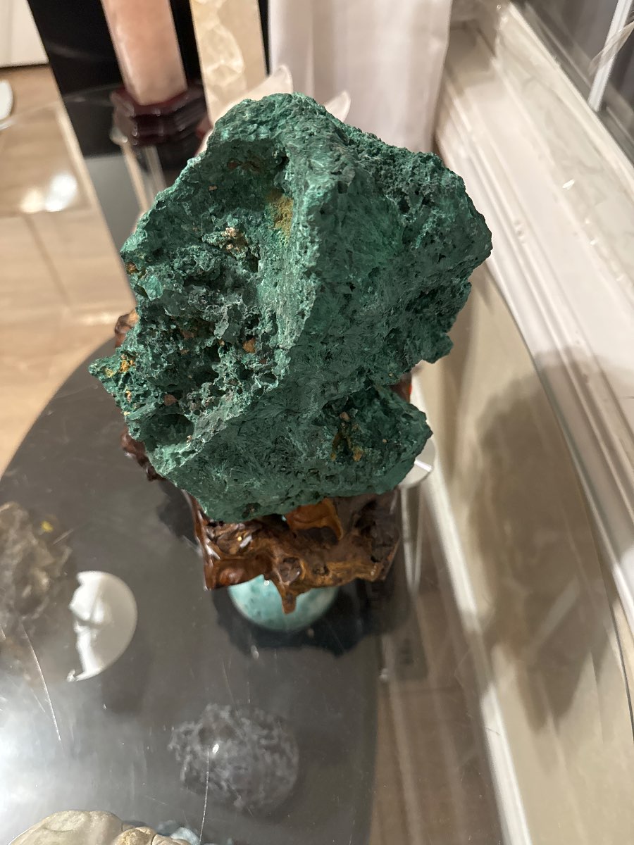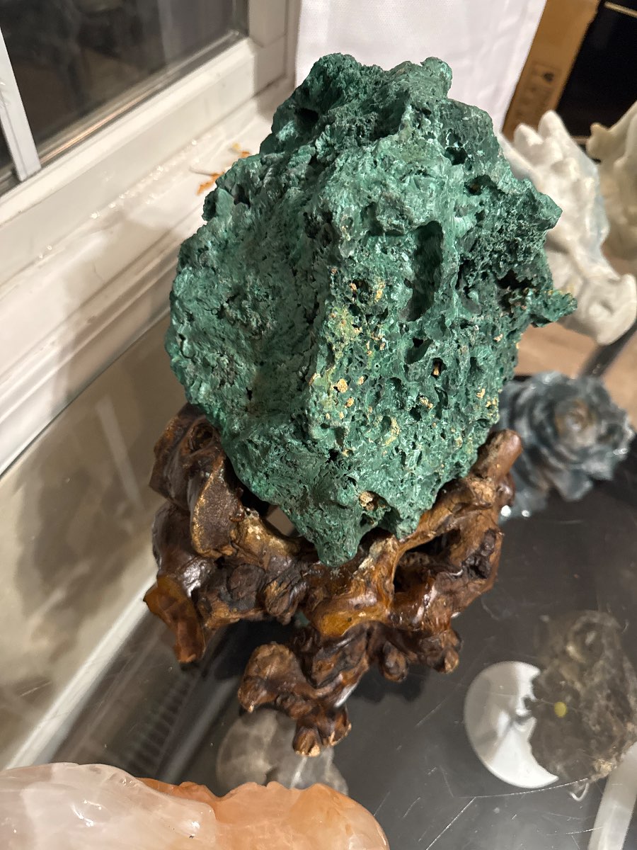Natural minerals like malachite do not have a specific date of creation, but their geological formation can be traced back millions of years. The style of the wooden base may suggest a more contemporary design, likely from the late 20th century to present.