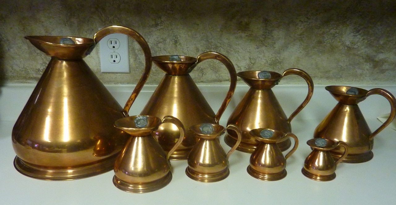 These all copper measure pitchers were used to measure the daily ration of rum given to the crew aboard naval ships. These pitchers each have a lead stamp on the inside rim showing the government inspection mark and royal cipher which proofed each pitcher to meet volume specifications. They range from one Gallon to 1/8 Gill and have a lead seal with a crest inside.