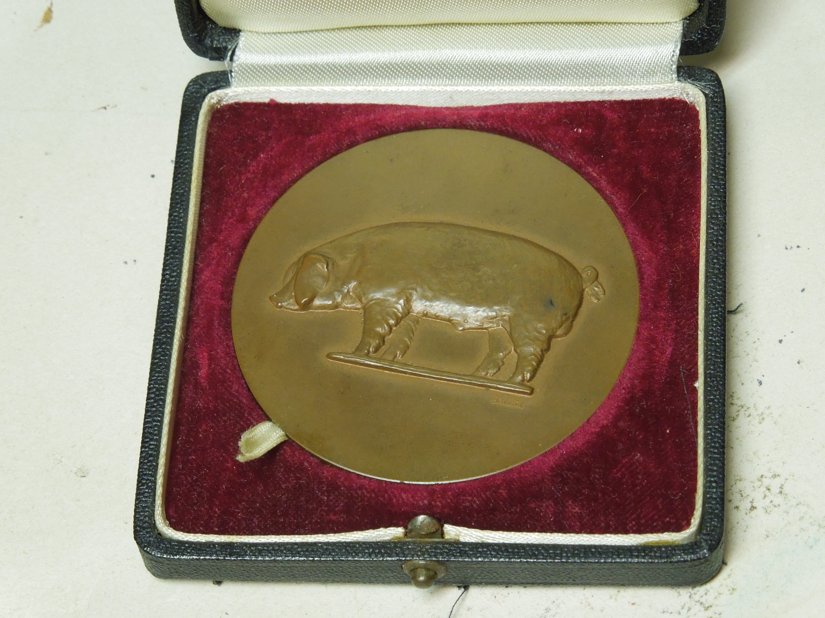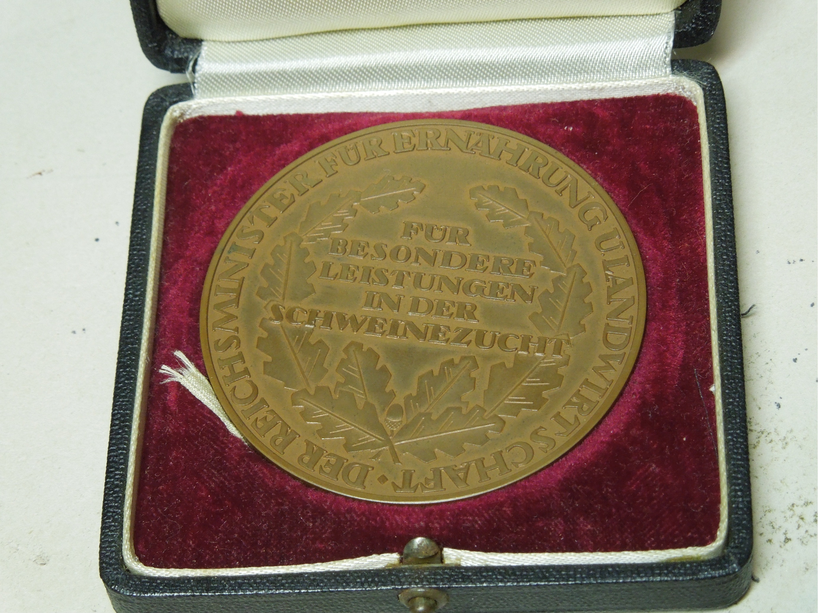 Bronze? Medal Side 1: Image of Pig with Sheurich written at rear foot. Side 2: Fur Besondere Leistungen in der Schweinzucht. (For special service in the pork industry). Der Reichminister fur Ernahrung und Landdwirdschaft. (The Minister of food and agriculture)