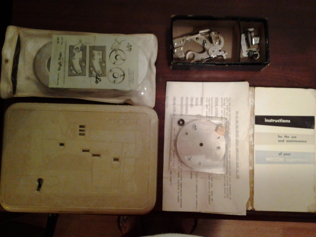 I have a Necchi Supernova BU in its original Parson's cabinet. The machine works great and the cabinet has minor marks, on ruler on the front edge, there are words making certain spots written in pen. I also have the original instruction booklet, missing it's cover; accessory kit, embroidery plates, and pattern weights. I know it was made in Italy and I believe it's from the 50's...