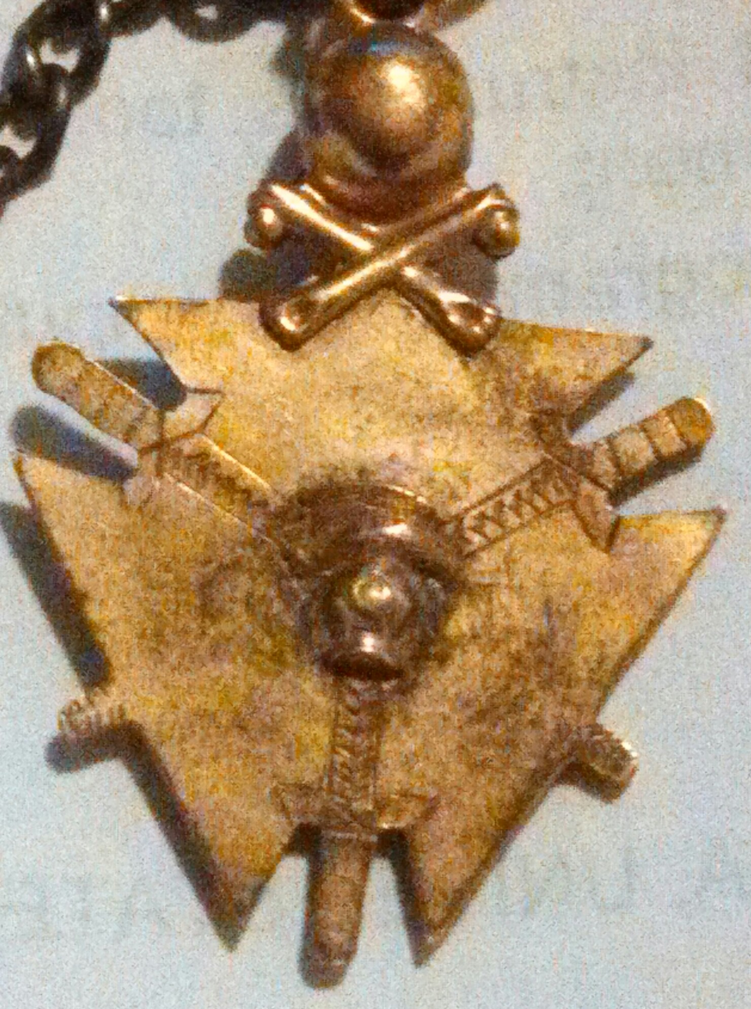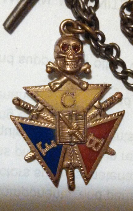 this appears to be a tie holder it hooks into a button hole and has a chain that goes around tie it has a skull and crossbones symbol with tiny red jewels for eyes with three triangles. the top is yellow, the bottom left blue, & the bottom right is red . the skull and crossbones is sitting on the top on the yellow triangle. there appears to be three swords one is stabbing down between yellow and blue triangle into the red triangle, the second stabbing down between the yellow and red triangle into the blue triangle the third is stabbing up between the blue & red triangles into the yellow triangle in the center is what appears to be an open book with a dagger laying on it handle down pointing up from right to left not really sure if this some kind of organization or society type symbol jewelry but any light that can be shed on this would be greatly appreciated .