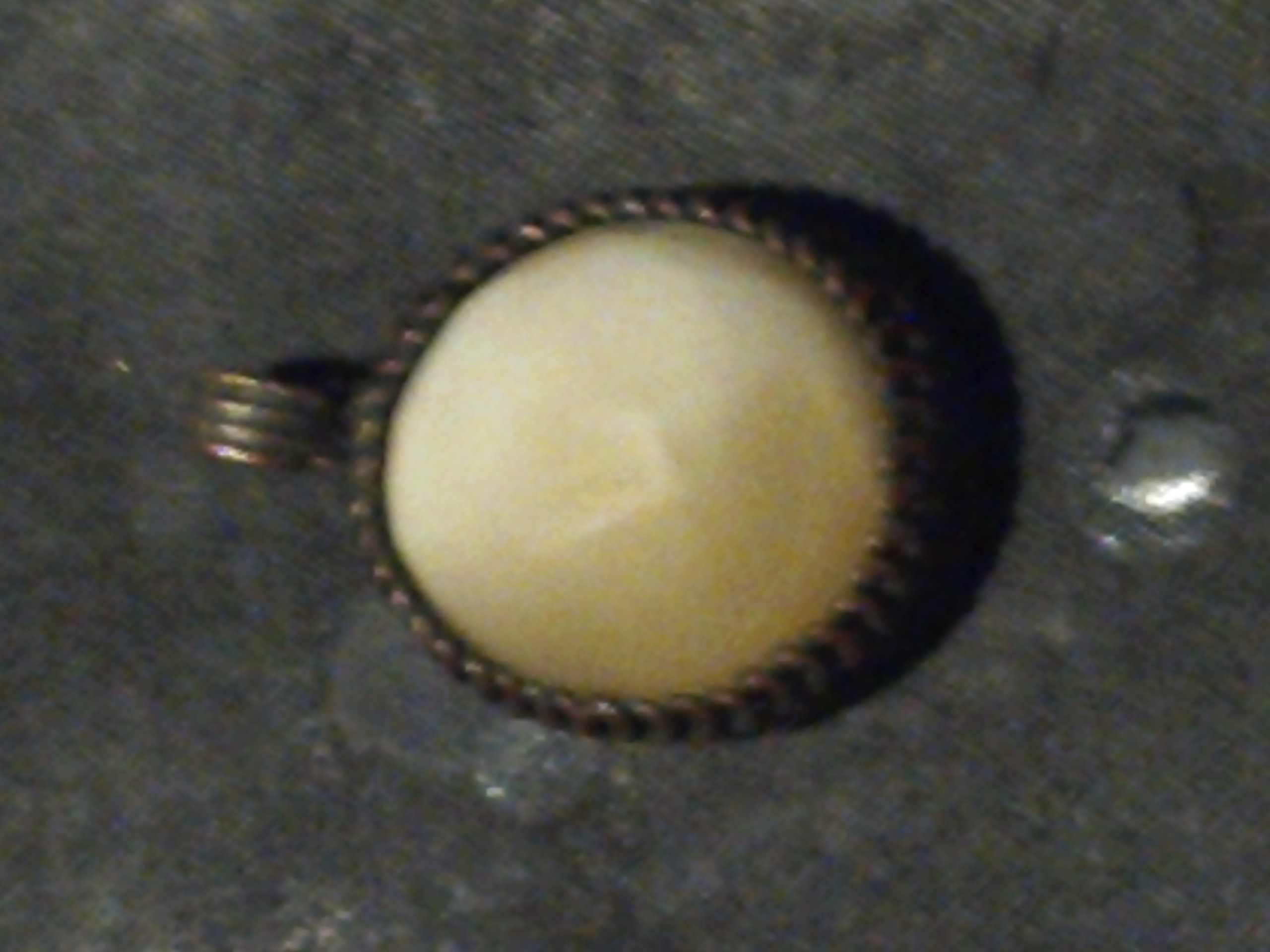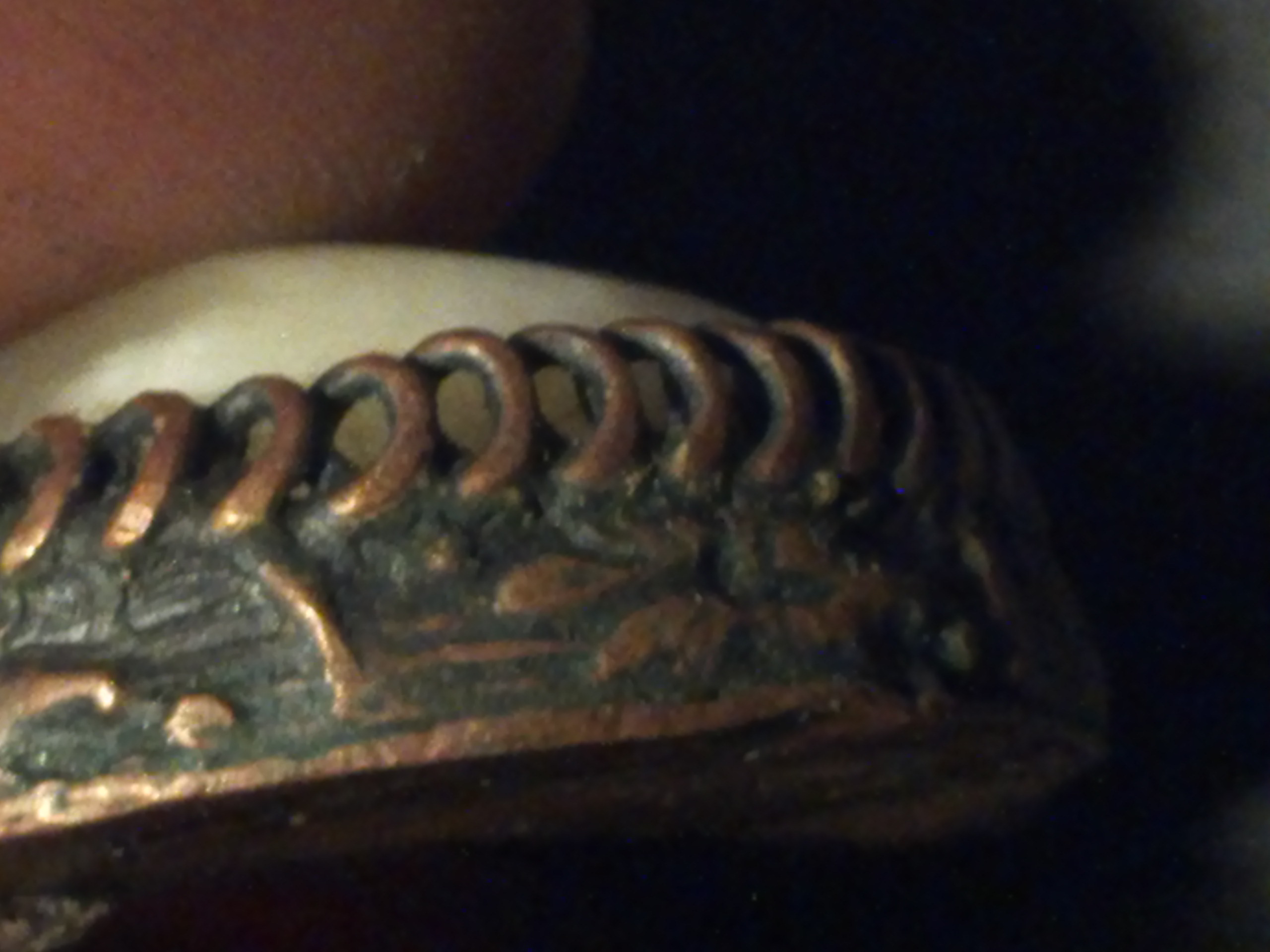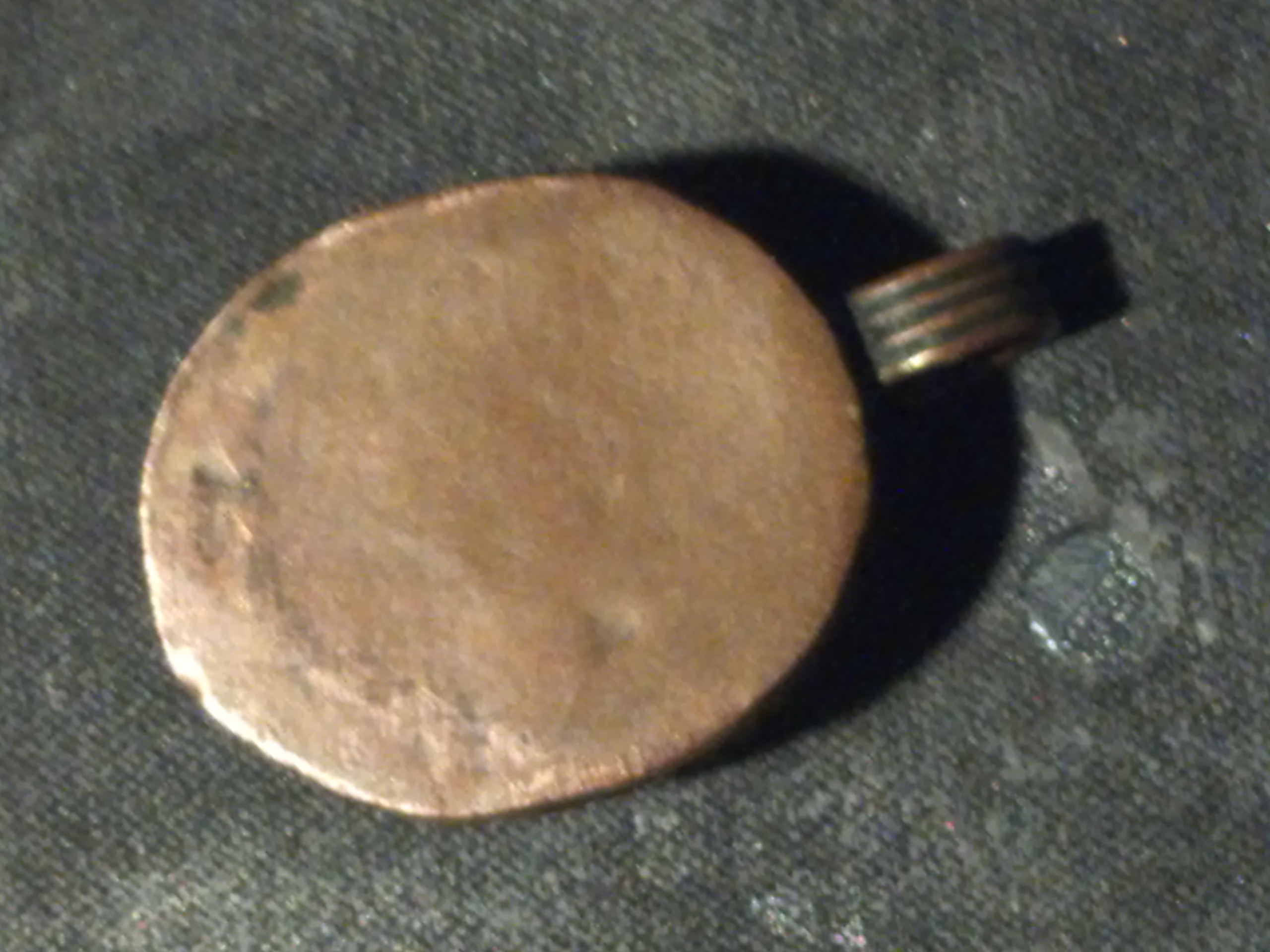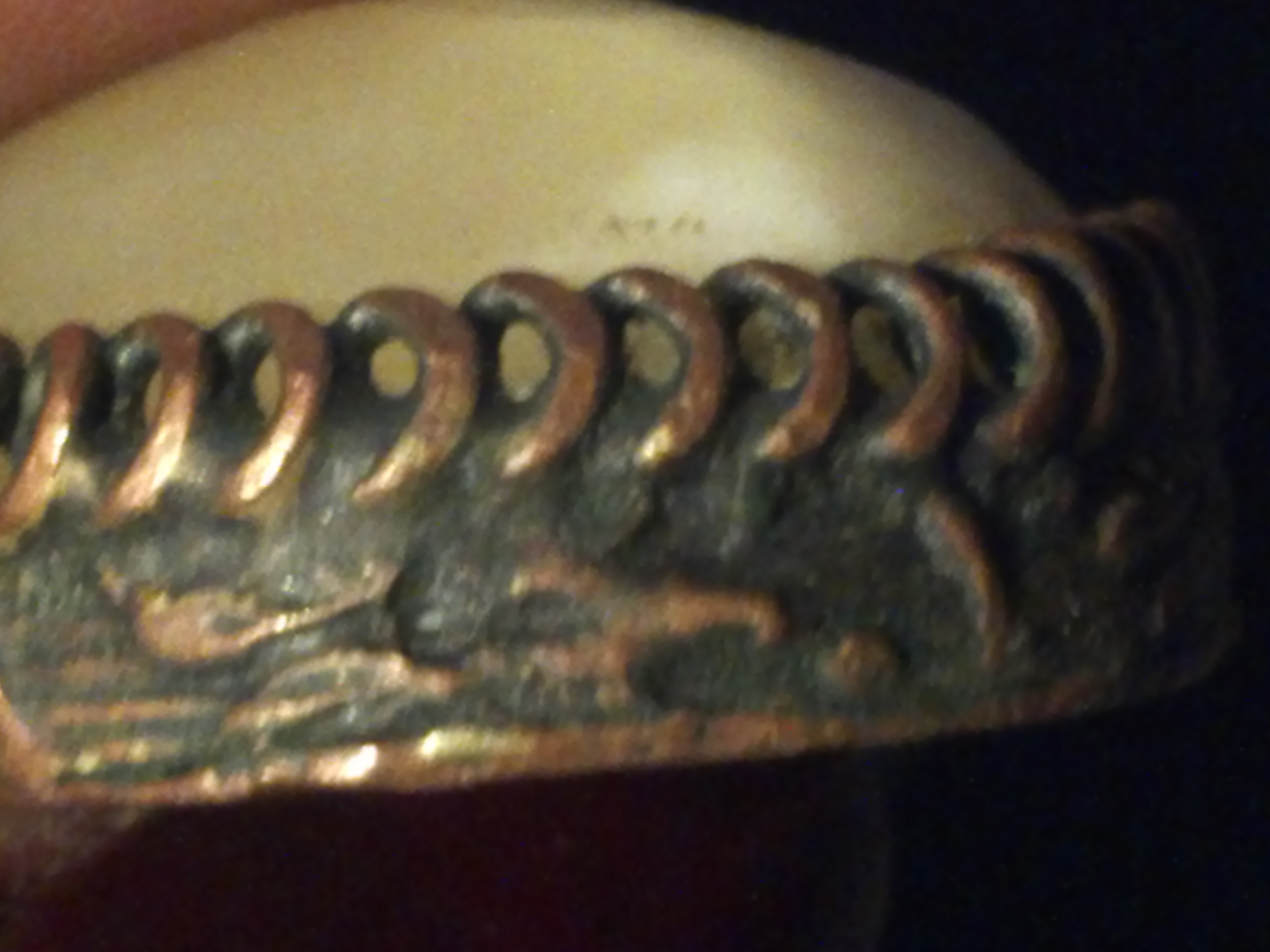 Oval shape, possibly made out of brass, copper, the stone s a antique white, and very pale yellow, the stone surounded by possibly brass swirls, all around the stone is what appears to be either crude markings or possibly symbols, back looks like copper. This was either made many, many years ago, or its newer just made by someone who was bad at it. In some places it looksloke you can see marks with they beat on it with some tool to shape it.
