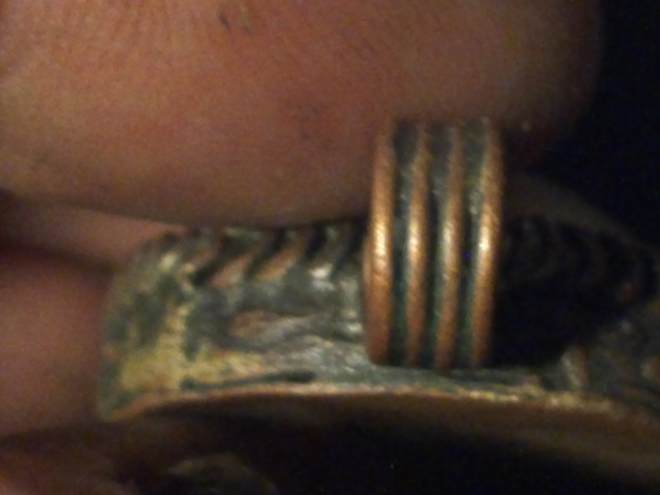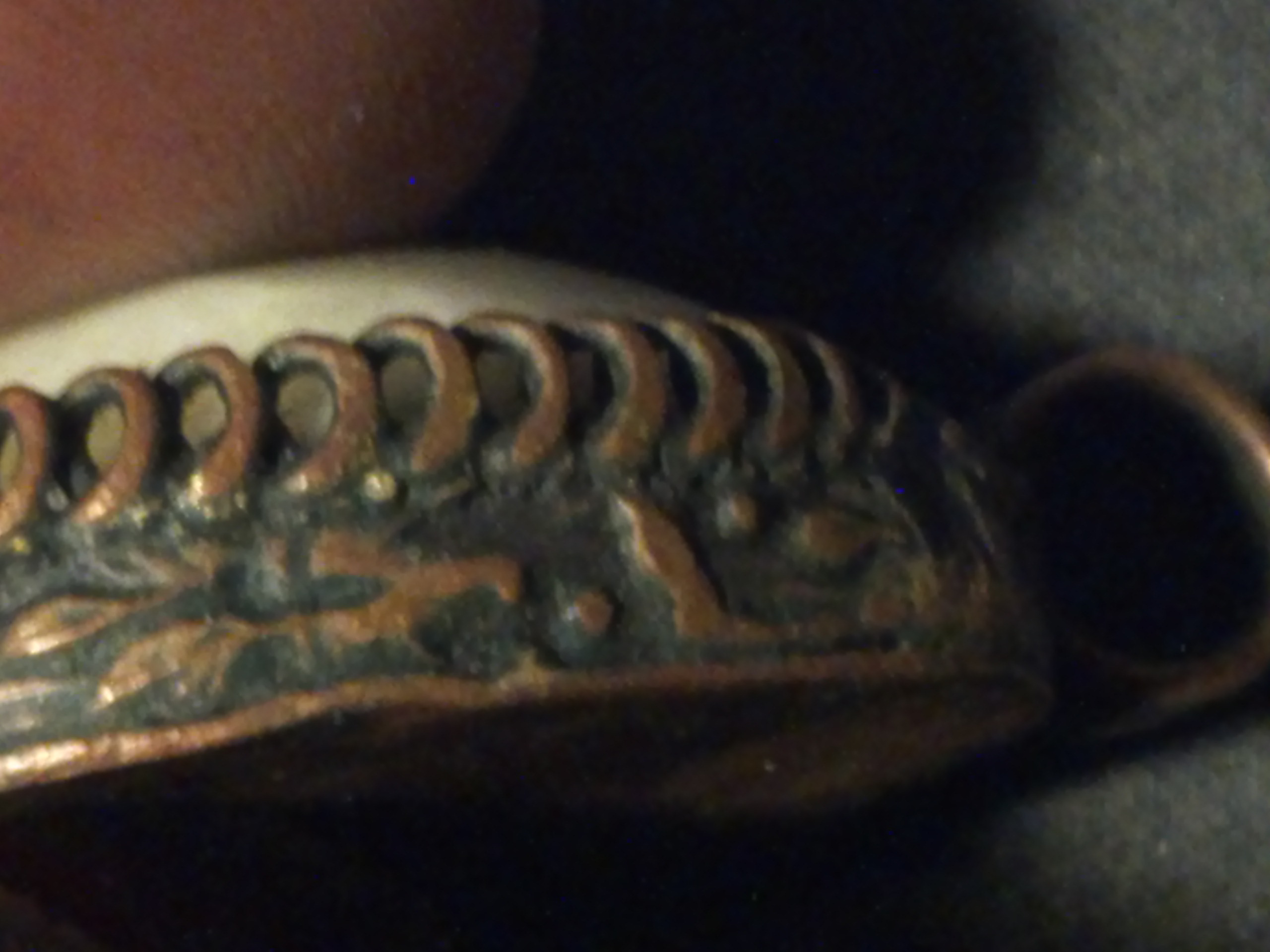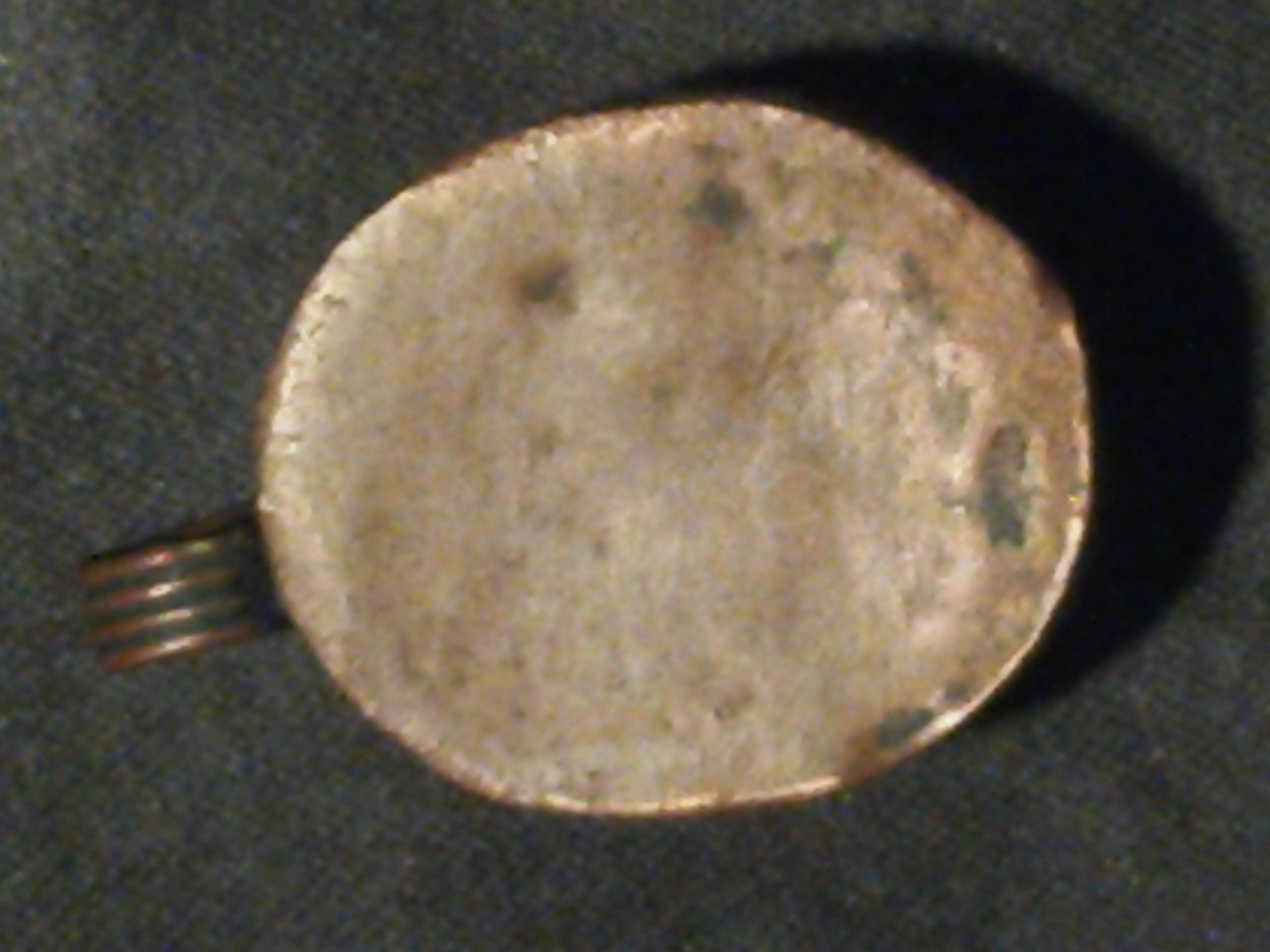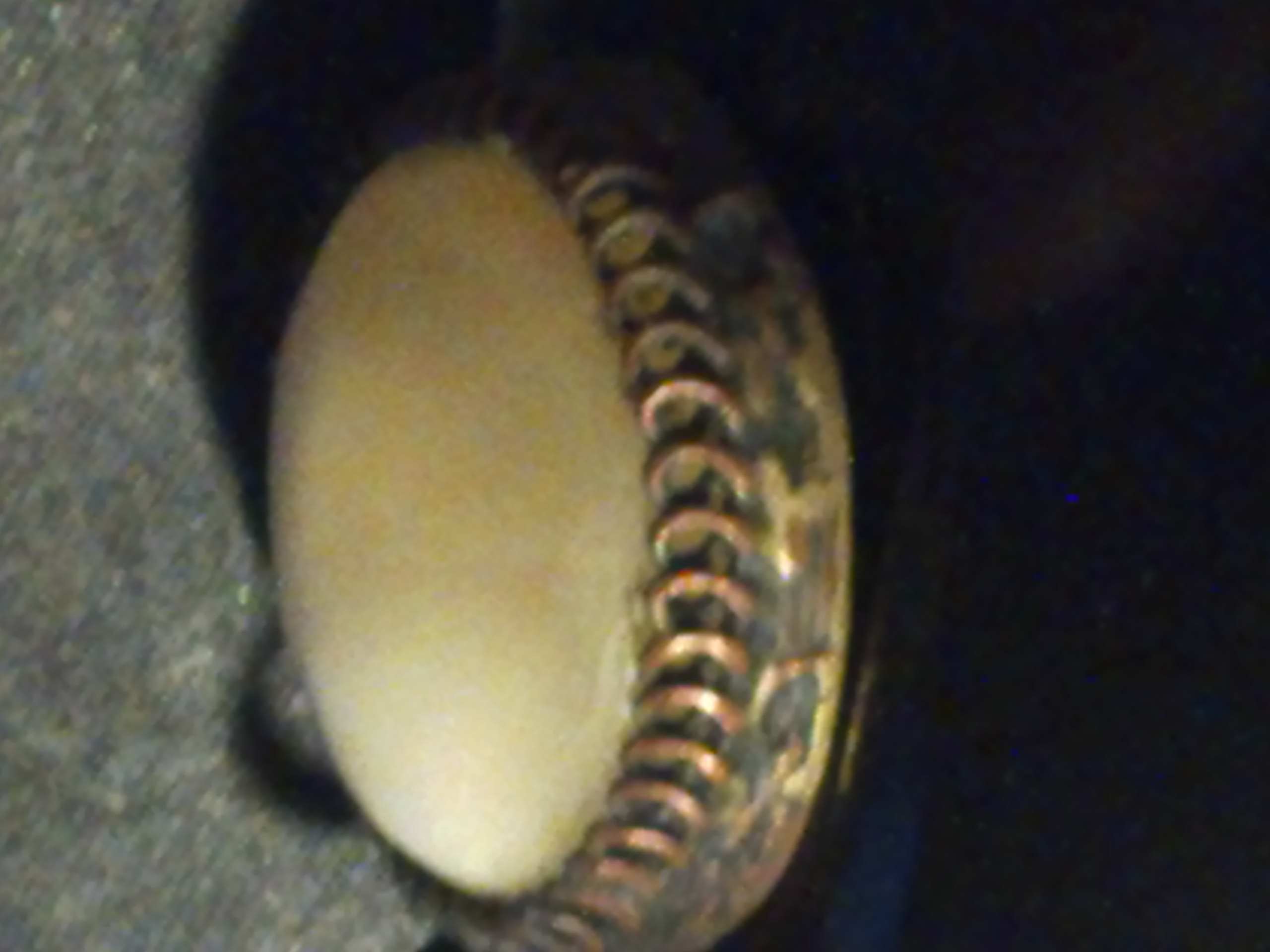 Oval shape, possibly made out of brass, copper, the stone s a antique white, and very pale yellow, the stone surounded by possibly brass swirls, all around the stone is what appears to be either crude markings or possibly symbols, back looks like copper. This was either made many, many years ago, or its newer just made by someone who was bad at it. In some places it looksloke you can see marks with they beat on it with some tool to shape it.
