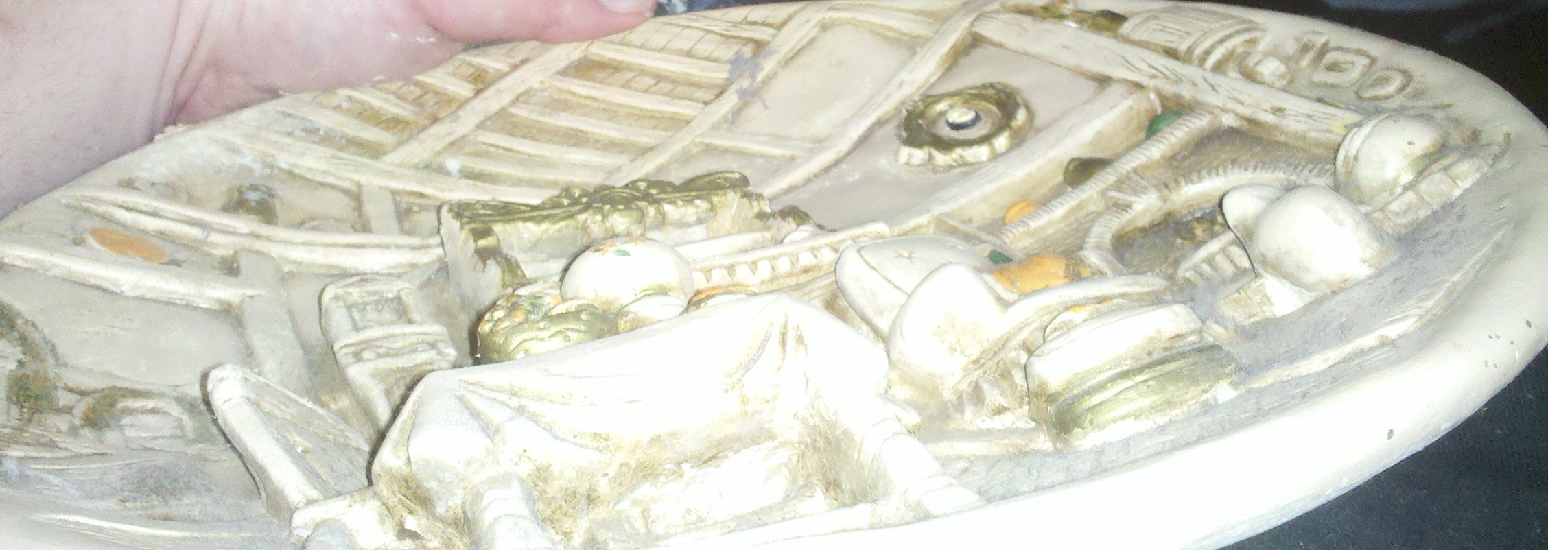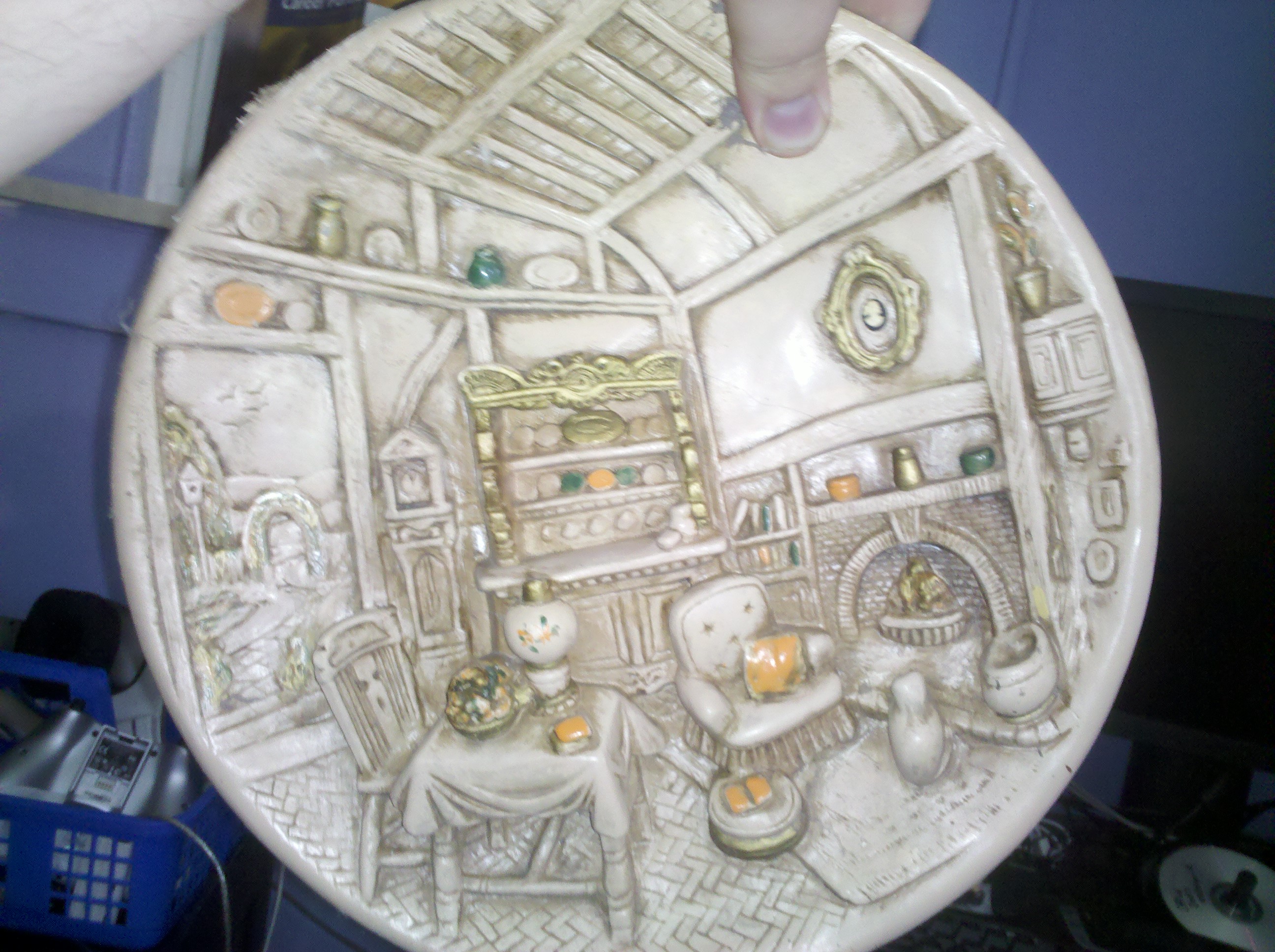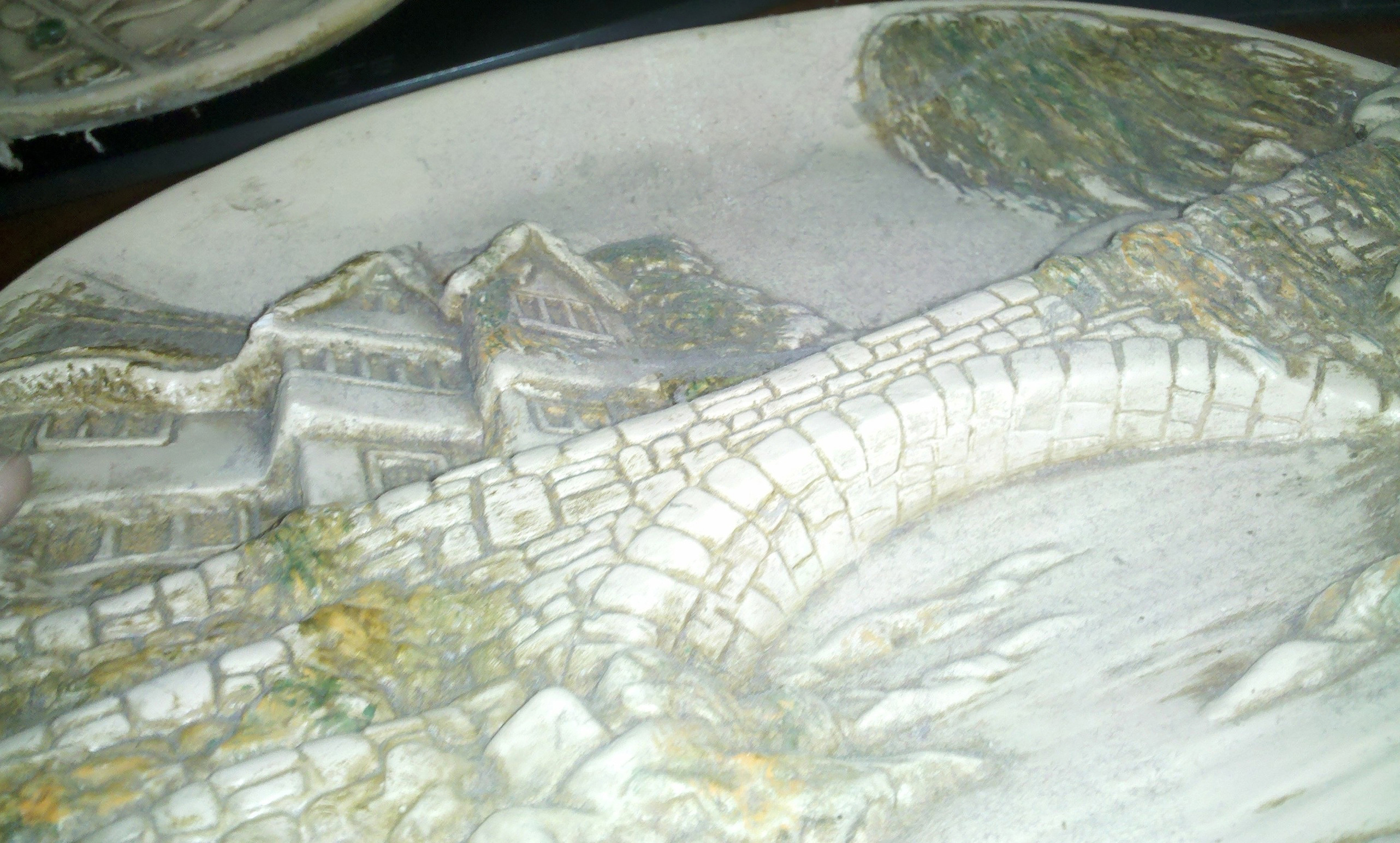 I found these 2 plates inside my home that was left behind and apparently forgotten by the previous owners. They were wrapped inside some newspapers from 1959-- so they are AT LEAST 50 years old. I believe they are ceramic. The artwork is raised so that it appears to have depth. There is no distinguishing markers such as a name or country. They appear to depict the exterior and interior of a cottage by a river, possibly English or german style homes from the early 20th or 19th century. They are in good condition with no chips or cracks. I am undecided if I wish to sell them, but I would like to know a guess on the appraised value. If anyone can give me their experienced opinion I would be grateful. Even if it not worth something I would still like to know any back history on this plate.