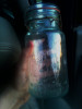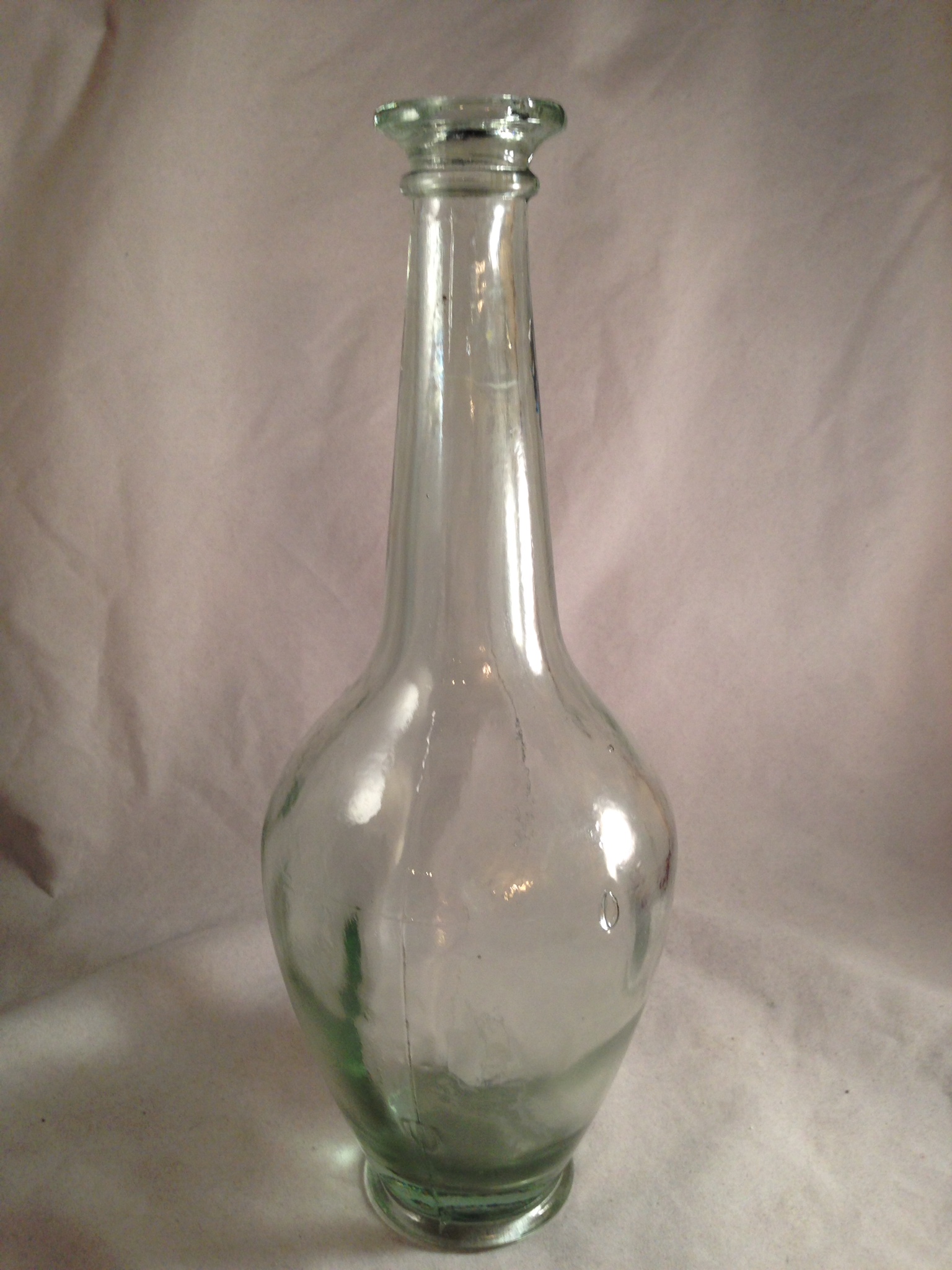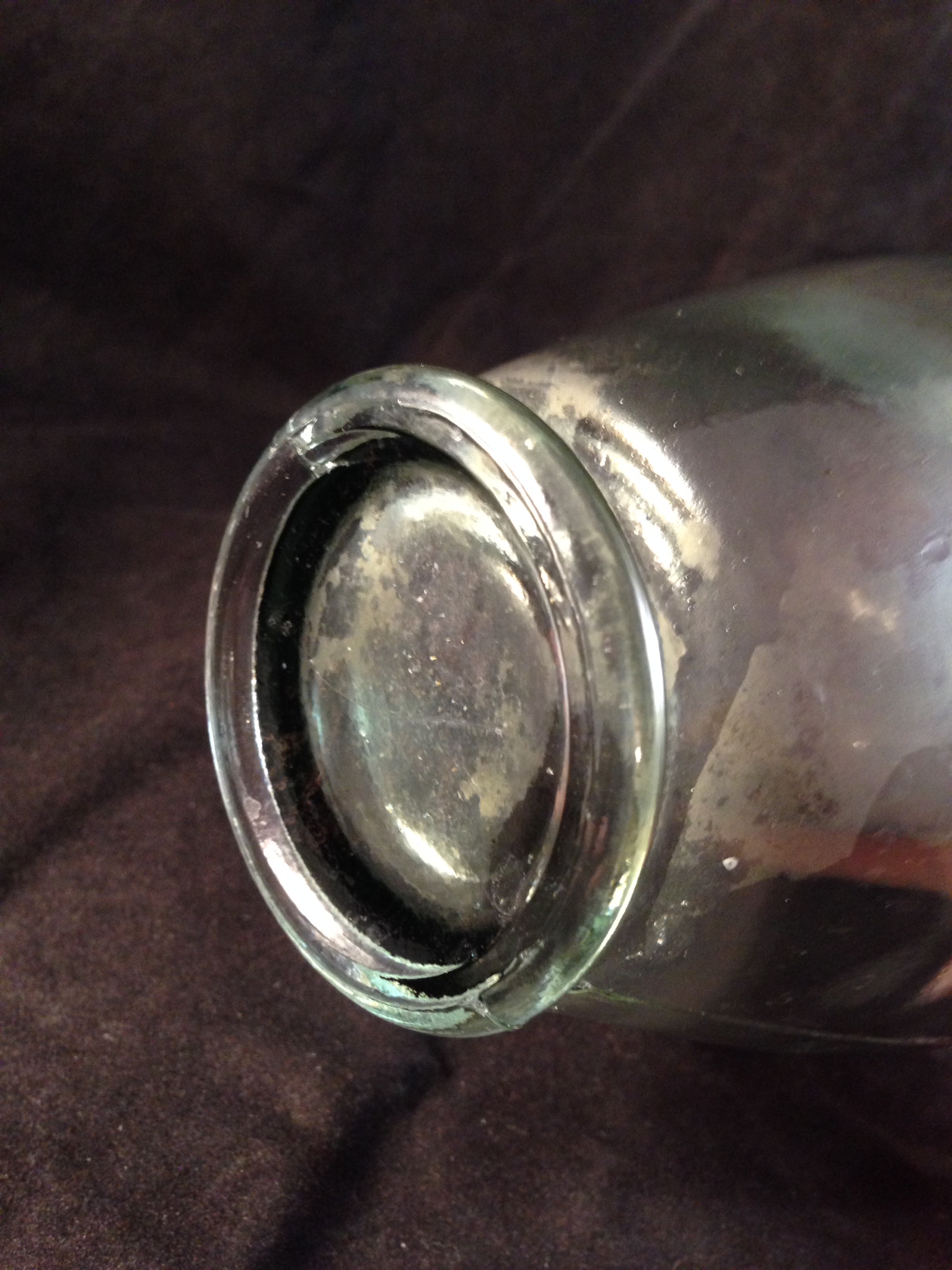 There are no embossed marks on the bottle, but there is a long cigar shaped ouline in the front and back of the bottle, shown in the last two pictures...I couldn't get the whole cigar shaped outline because it was hard to capture in the pics, but I got the top and the bottom of the shape outline in the last two pics. There are mold lines on the sides, and the shoulder of the bottle. there is also a slight mold like line around the bottom edge in a circle. There are a couple of large bubbles also shown in the pics...thank you for any and all info you can shed on this bottle.
