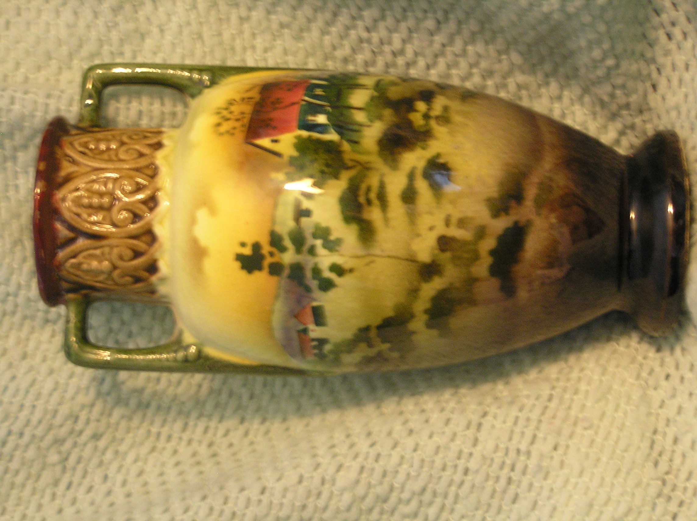A pottery vase that has a painted sceneof a house with trees and grass. greens and browns