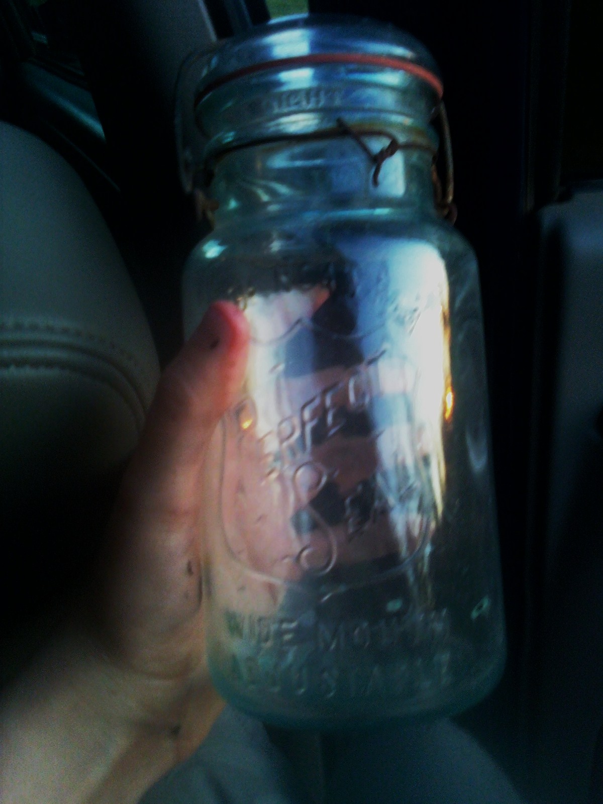 I have an old canning jar i found in my garage, it is a large jar that has a glass top that is held down by a metal clamp, there is a rubber seal on the bottom of this glass lid.. the lid has small bubbles in it.. The jar itself is a light aqua color, with what appears to be a shield with the words "Perfect Seal" inside. Below that are the words "wide mouth adjustable". The sides appear to be sealed via molding or machine, on the bottom of the jaw is the number 6, and that is it. Any ideas on how old this is?