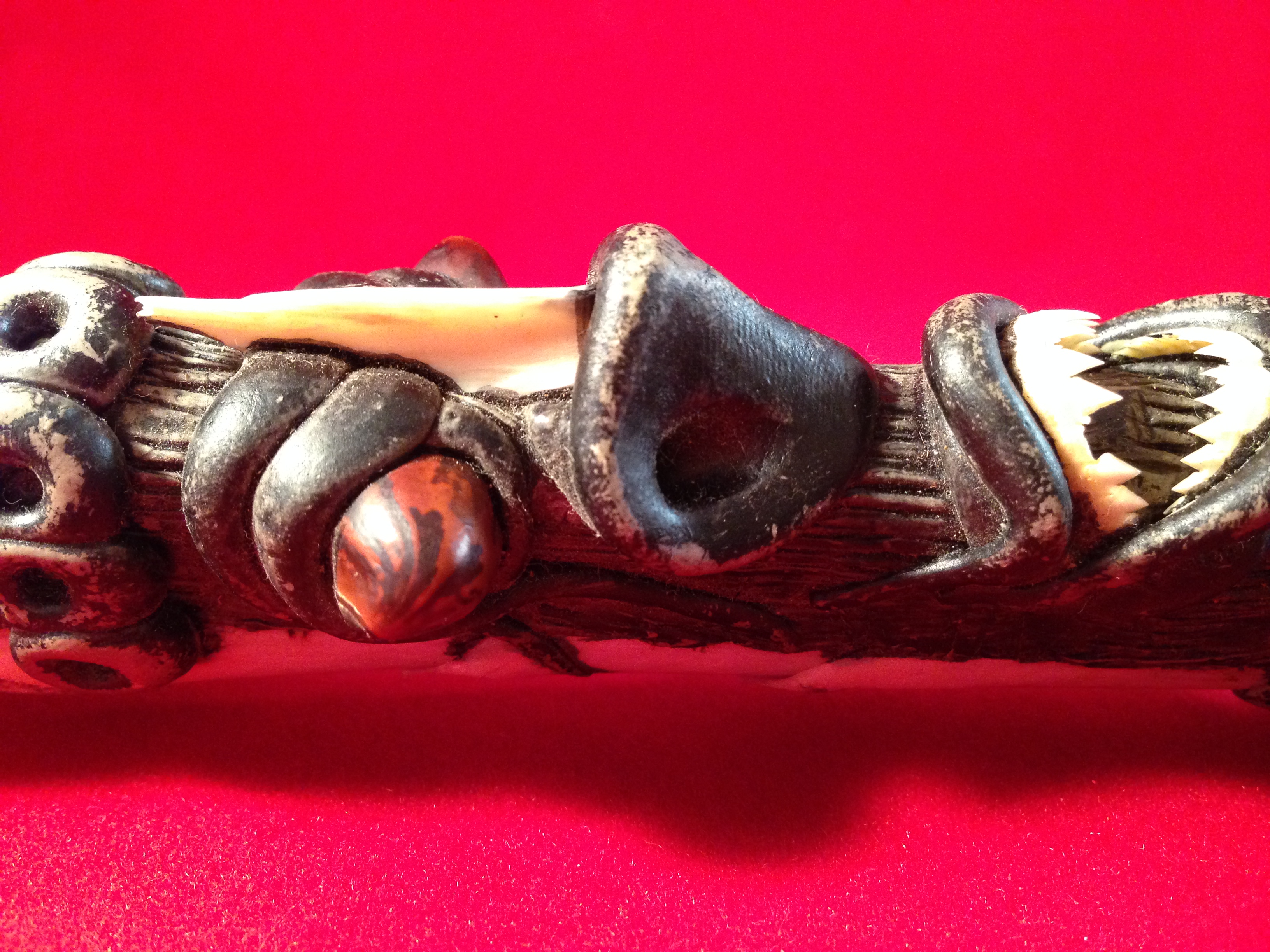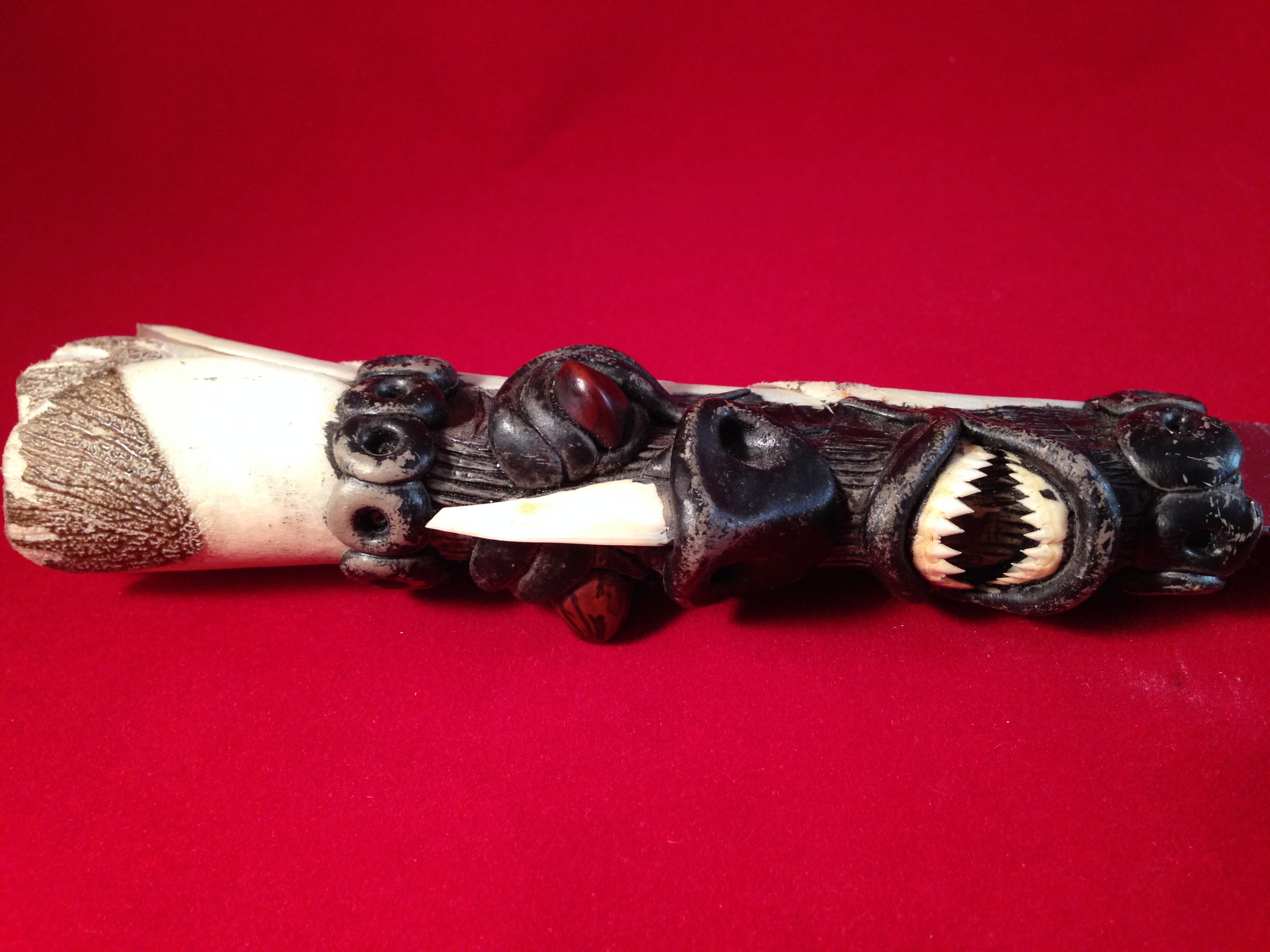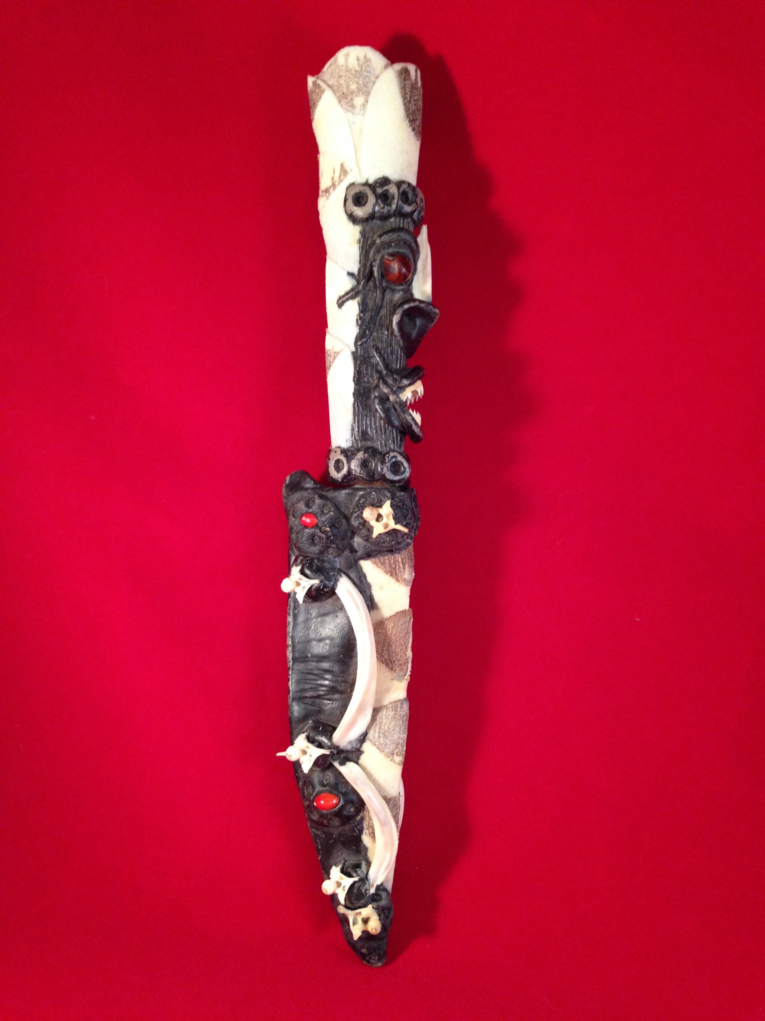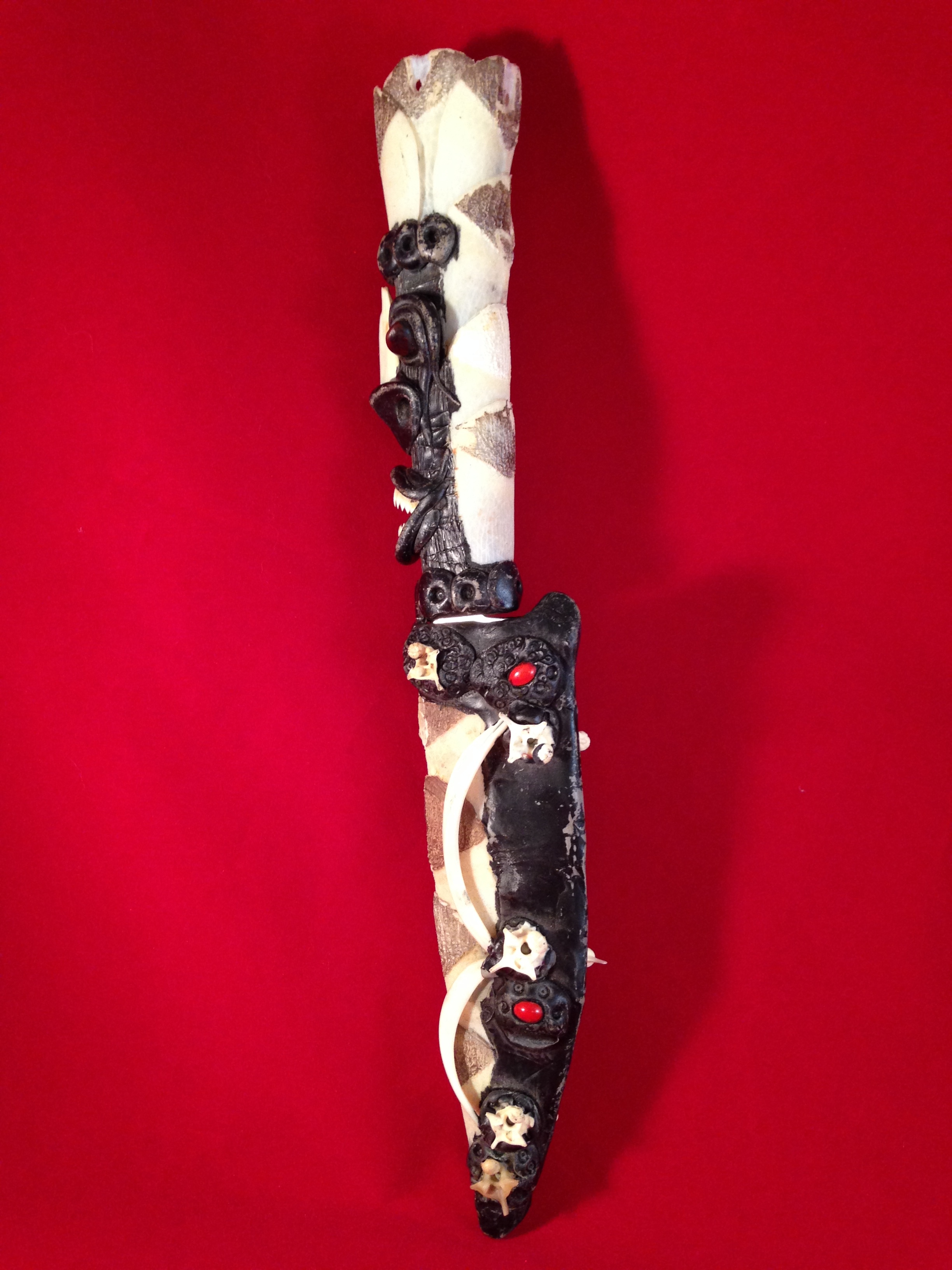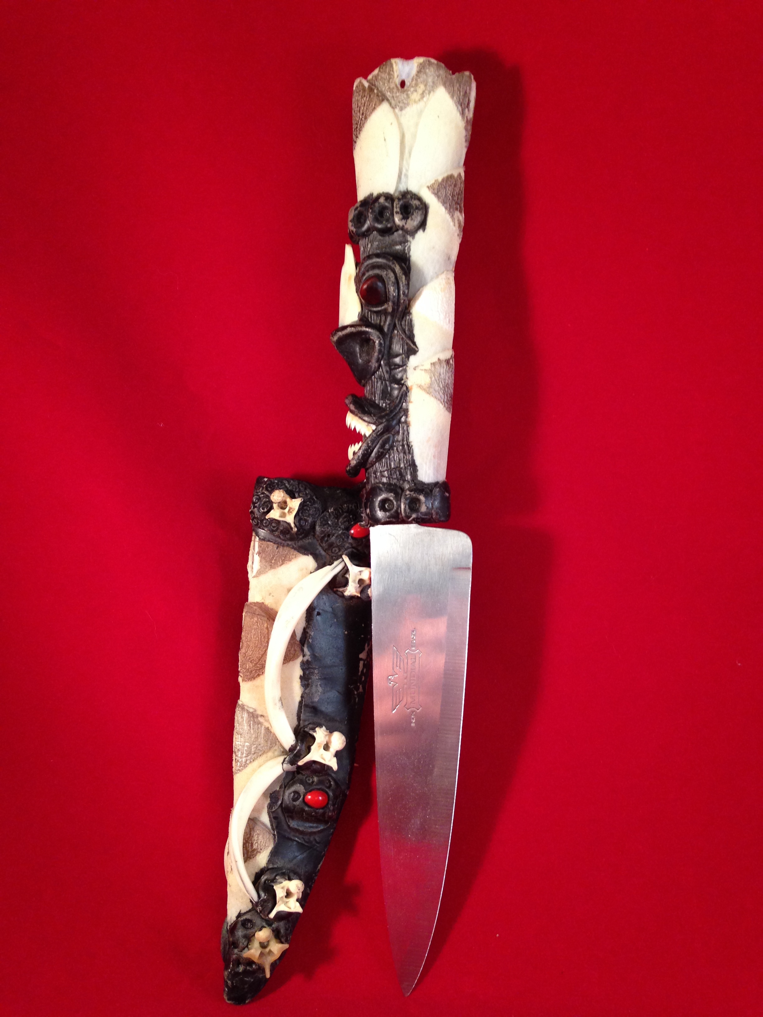 I found this knife also in a thrift store, (I do a lot of thrift store shopping!) and thought it was so unique and different that I had to get it. I cannot find anything like it on the internet. I did find some tribal mask that had similar style to the knife. But the closer you look at this knife the more amazing it is. Every white piece is actual bone! The jaw is a parhanna jaw, a friend of mine said the small sharp bones are snake vertabre, and the long rib looking things that are "legs and arms" I have no idea what beast the bones are from. The crown looks like a scale of some time to me, but 2 people have said it looked like hollow dear antler. The blade is a current modern blade, but I don't know if it is the original blade or switched out. The sheath of the blade underlying material is leather. Any insight from someone would be greatly appreciated. Thank you!