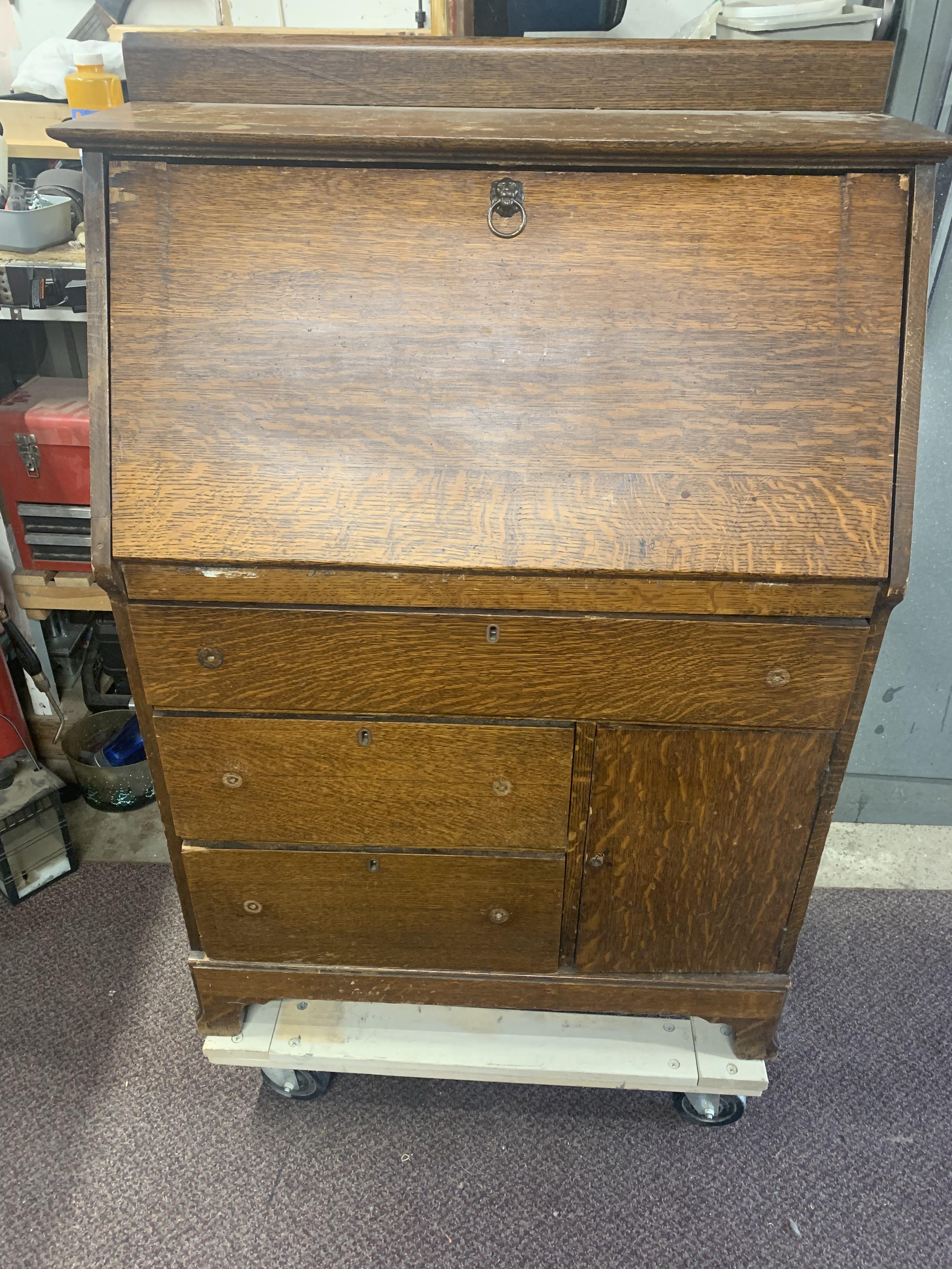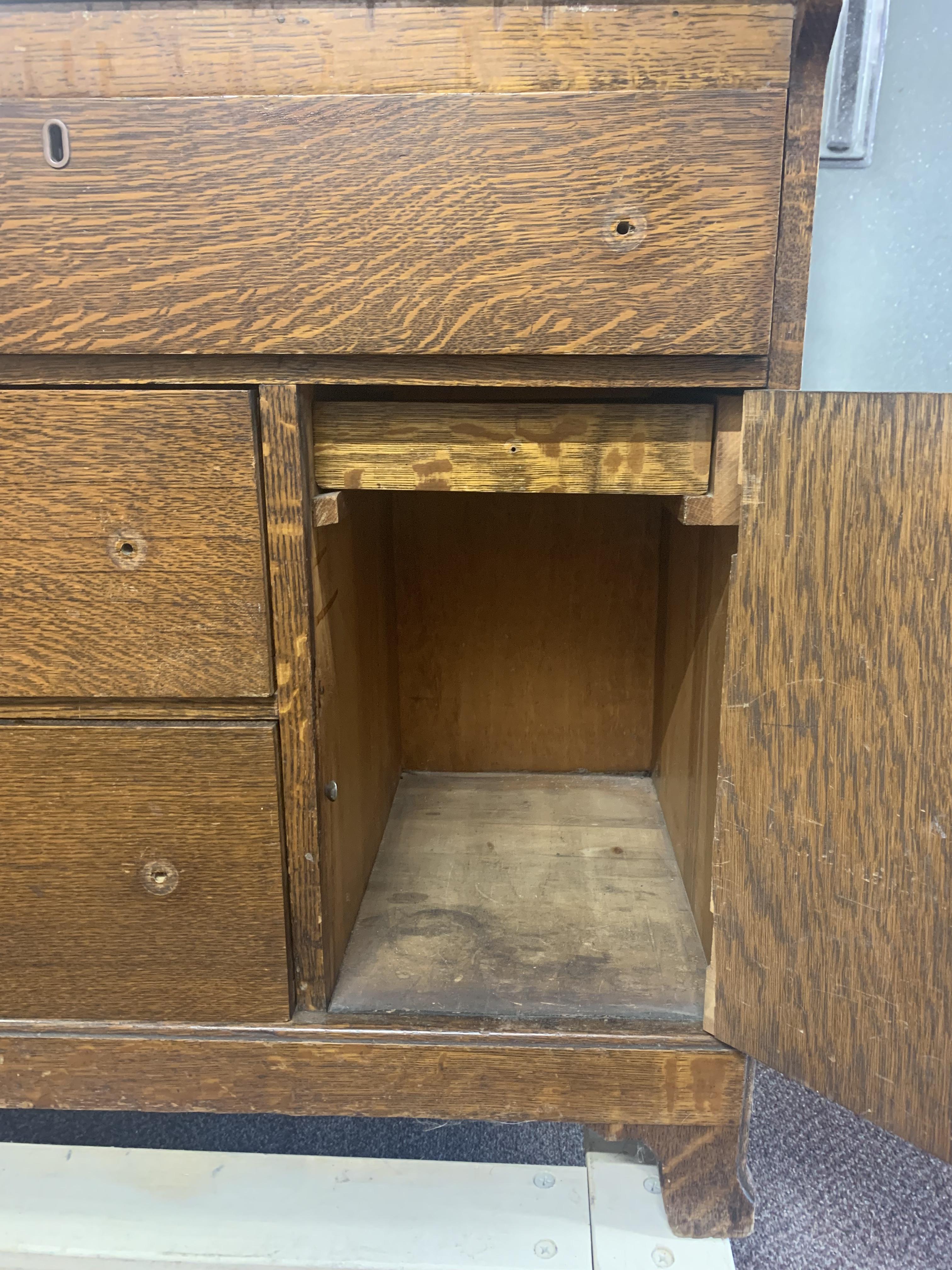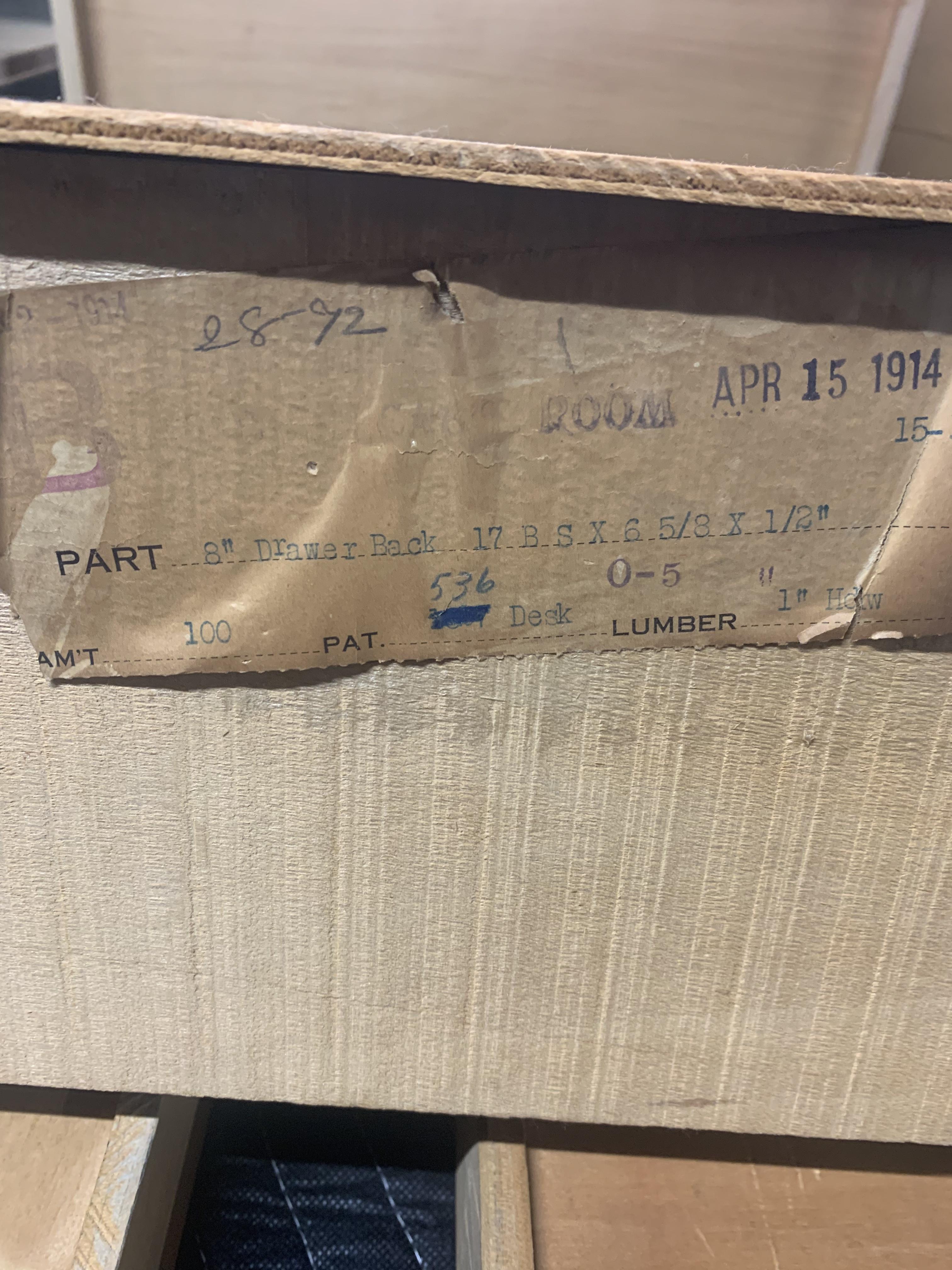 The label on the back was scrubbed/sanded off at some point before it came to me. I found one label on a drawer that is stamped April 1914, but otherwise can’t find any identifiable info. Anyone recognize this style? Thanks y’all!